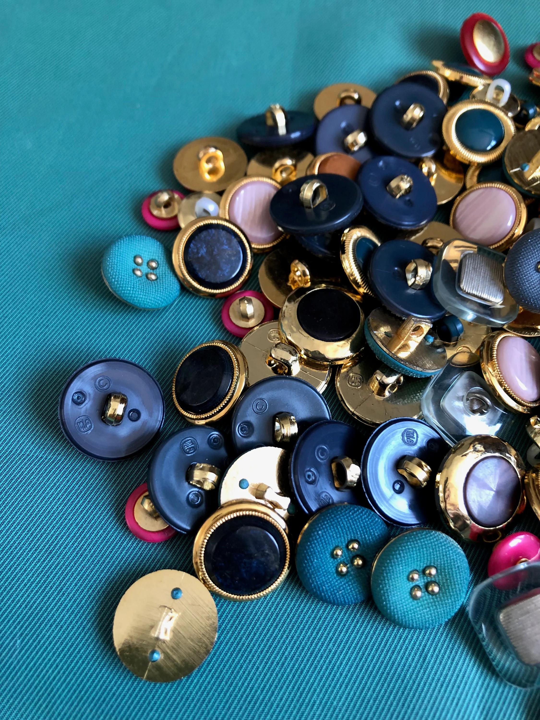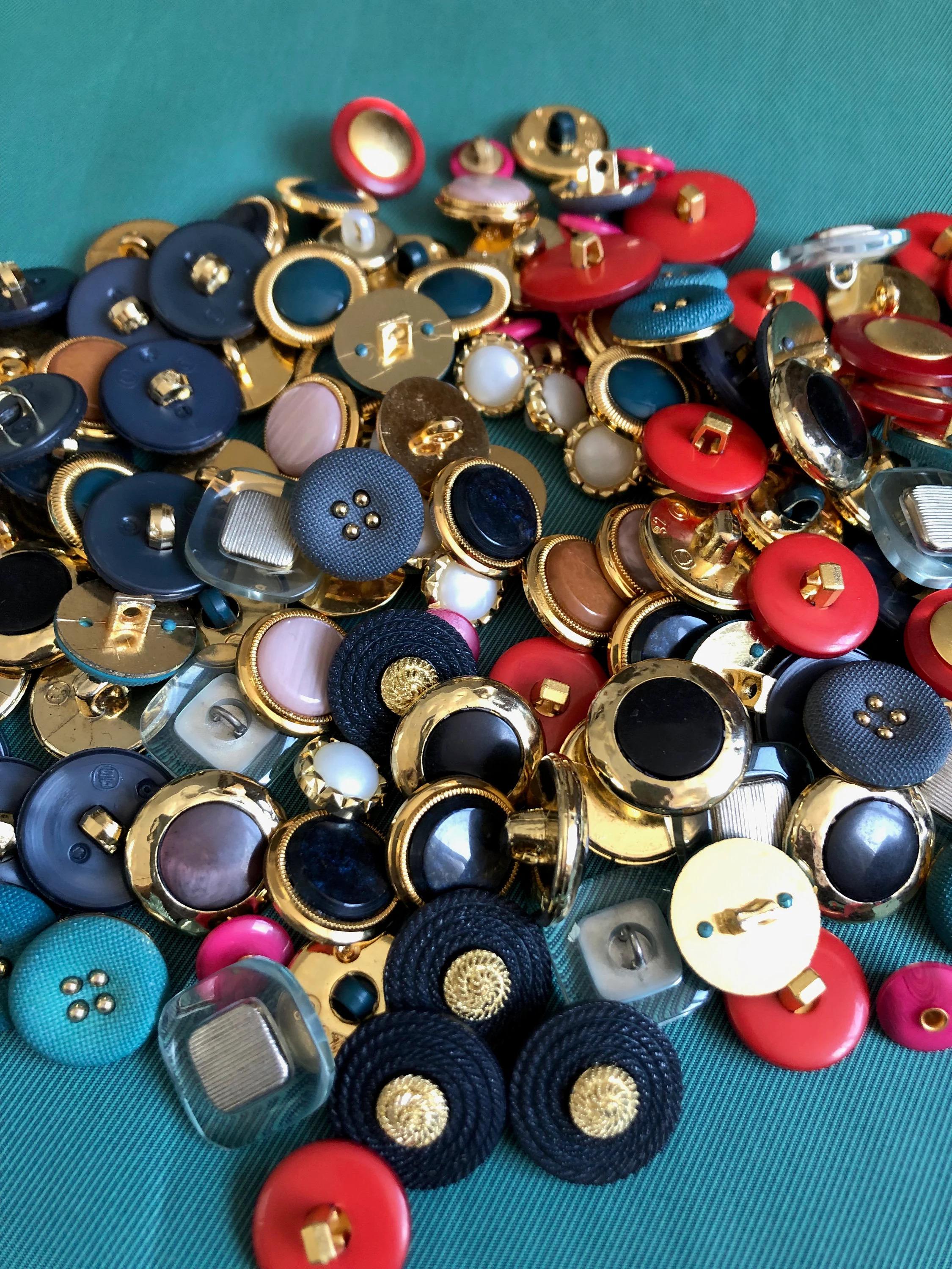 a bag of various design and coloured vintage buttons, all have a gold or silver accent