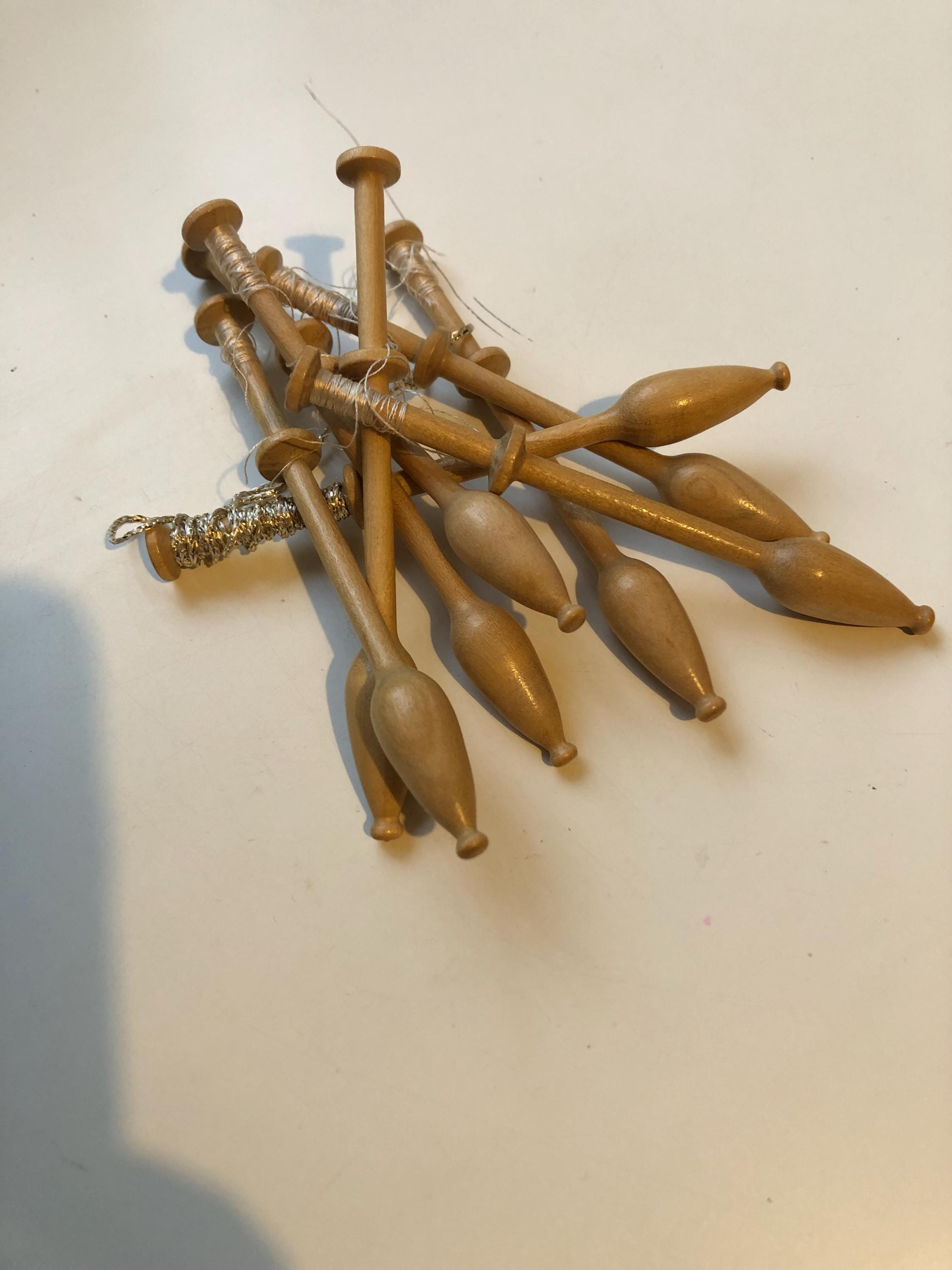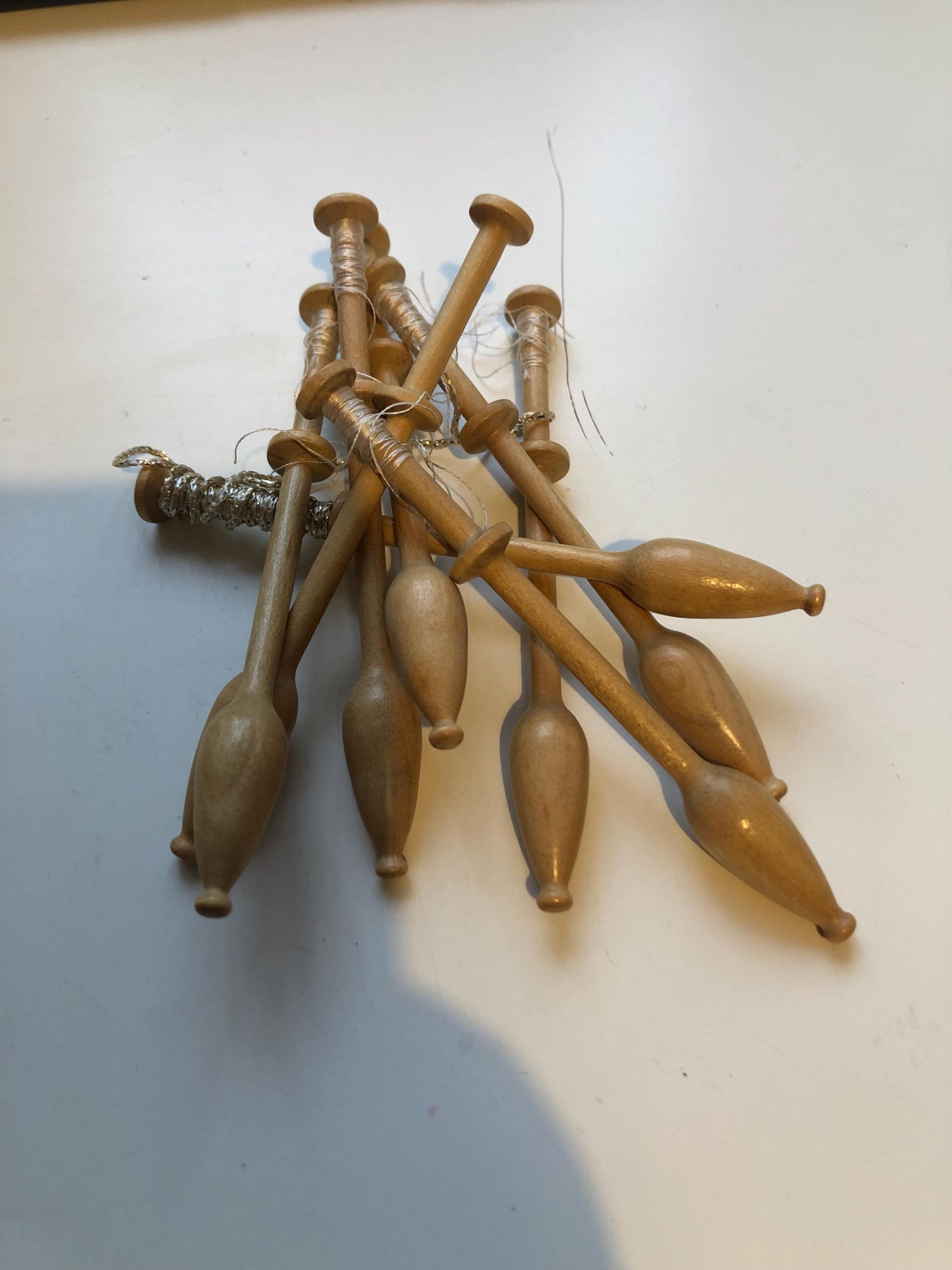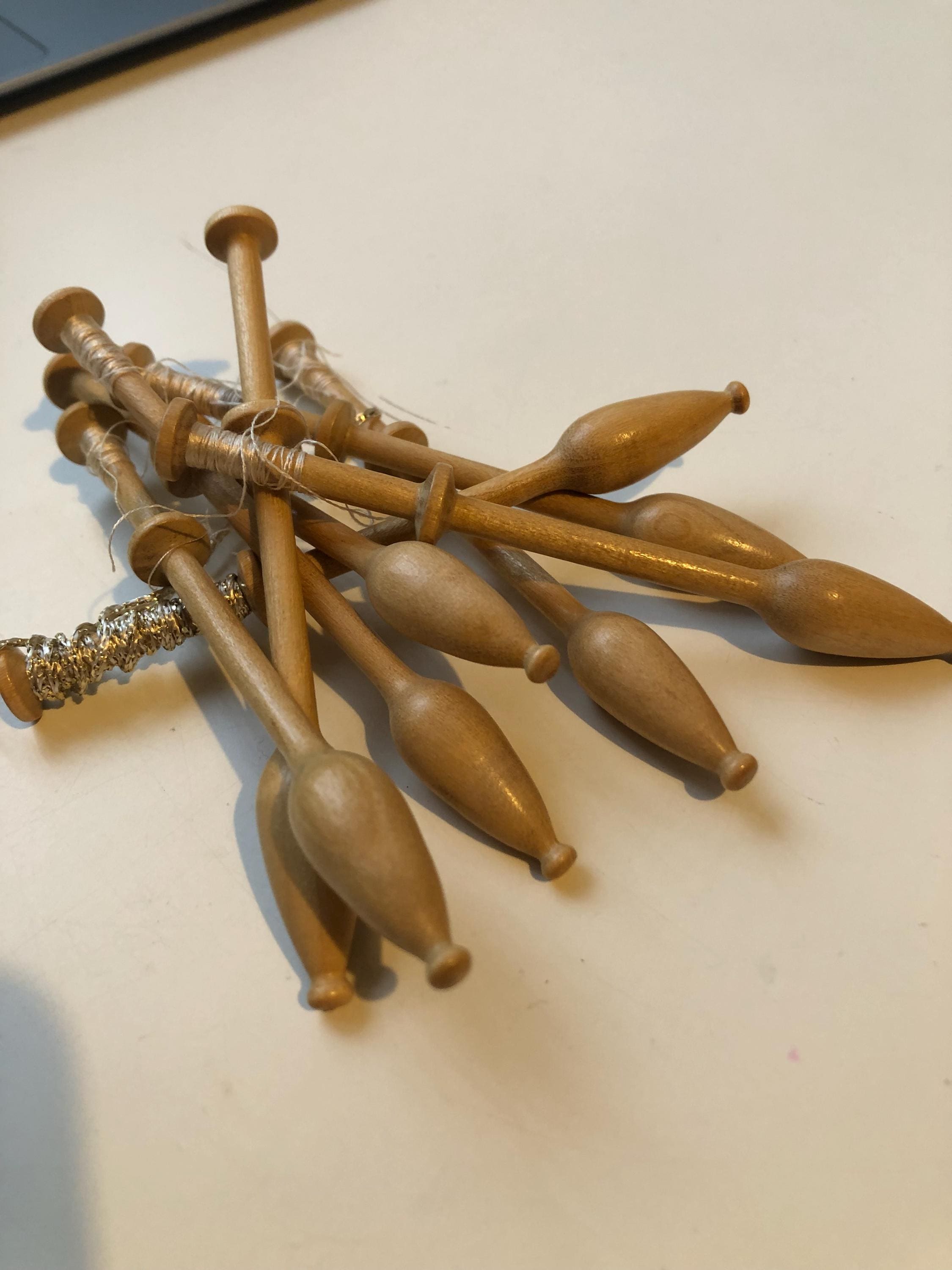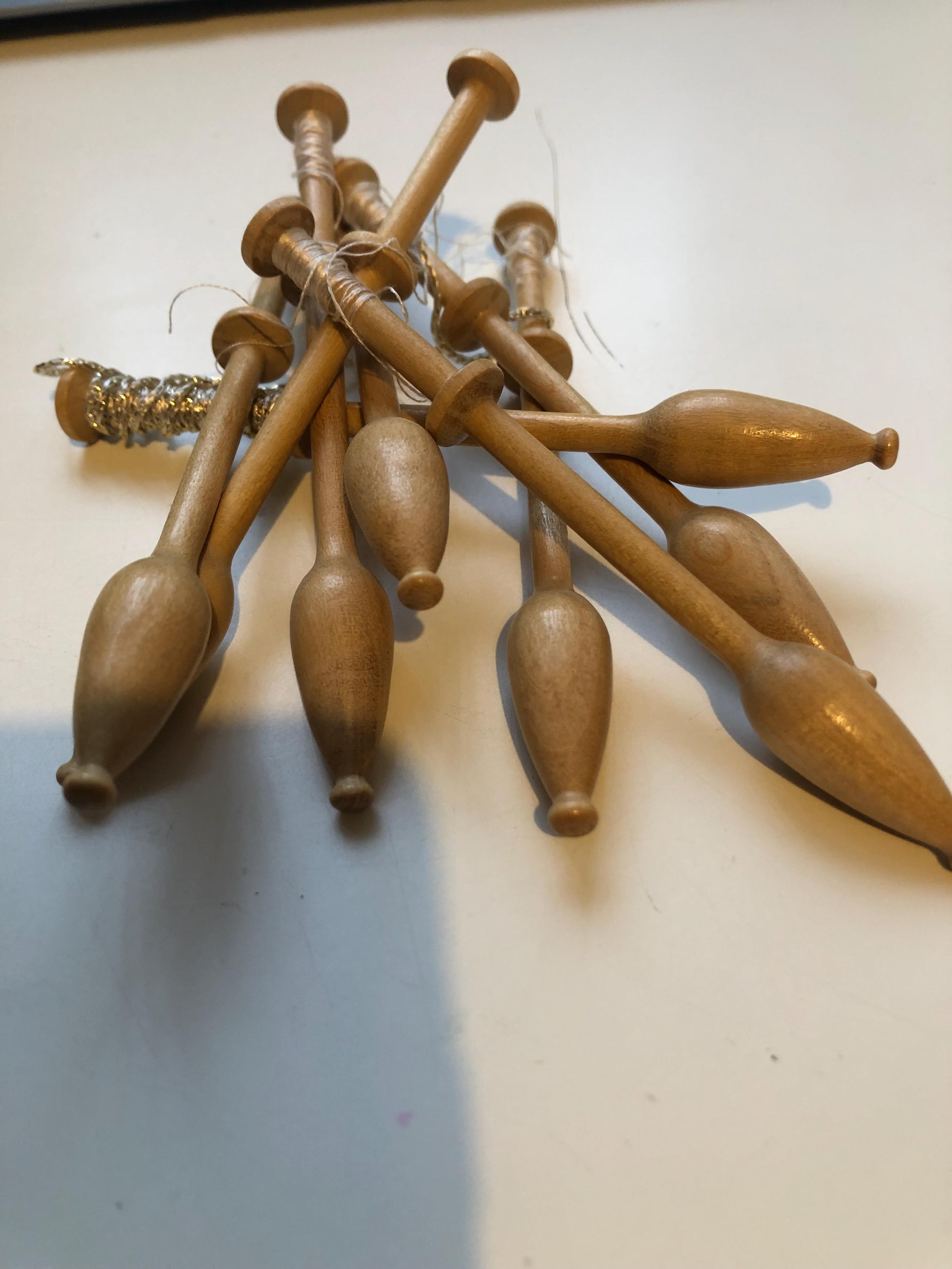 Set of 8 light coloured wood lacemaking bobbins