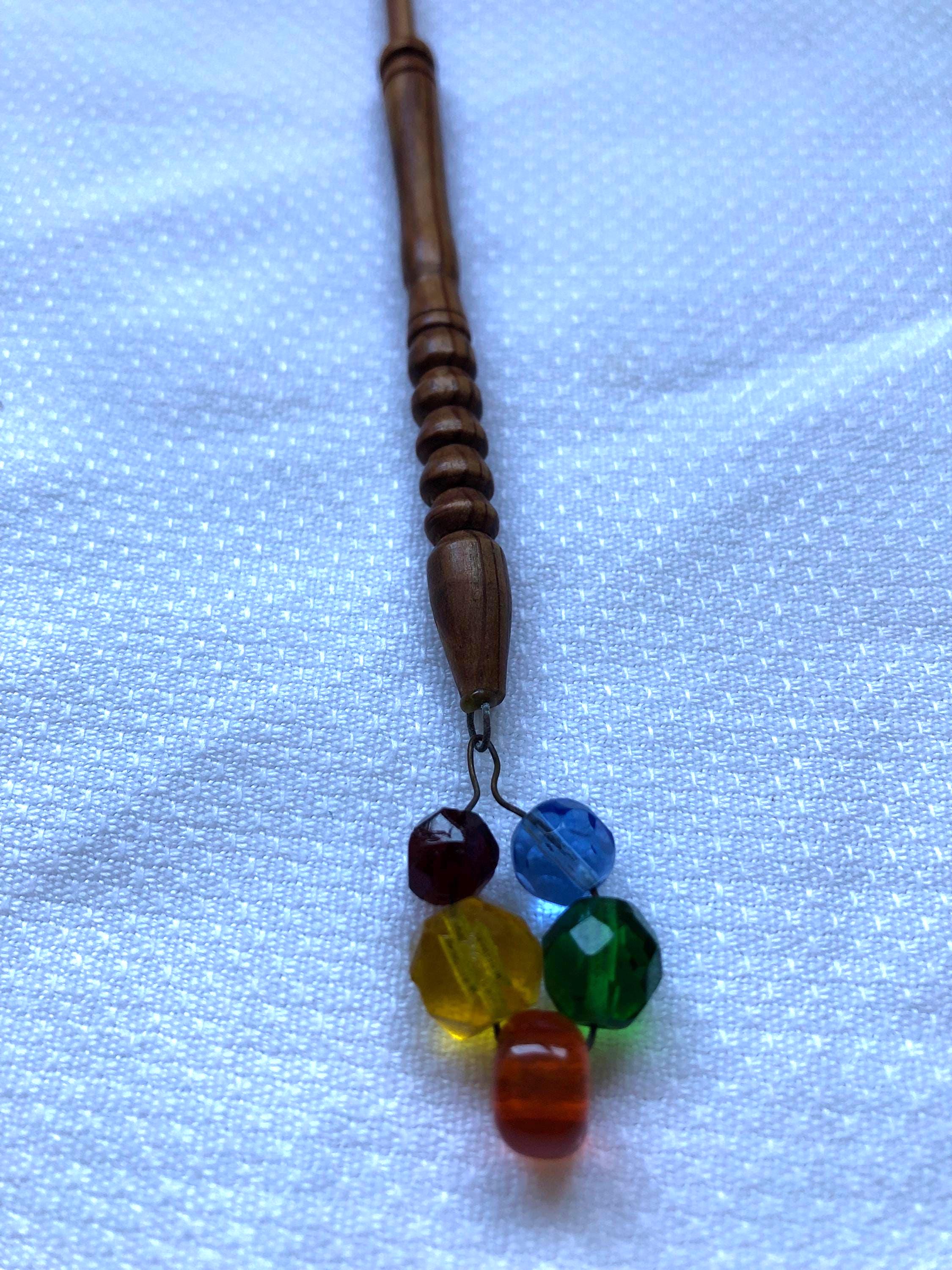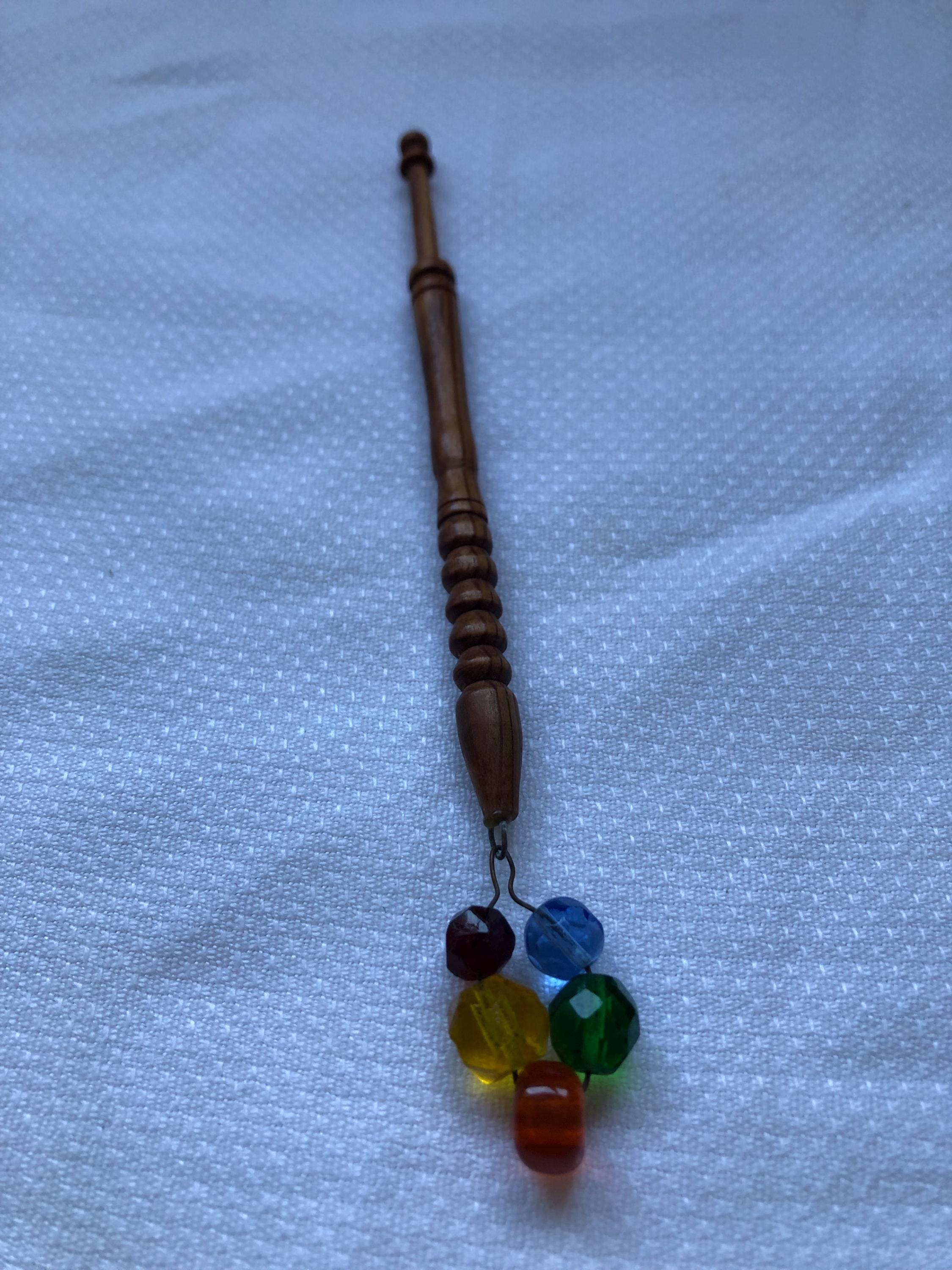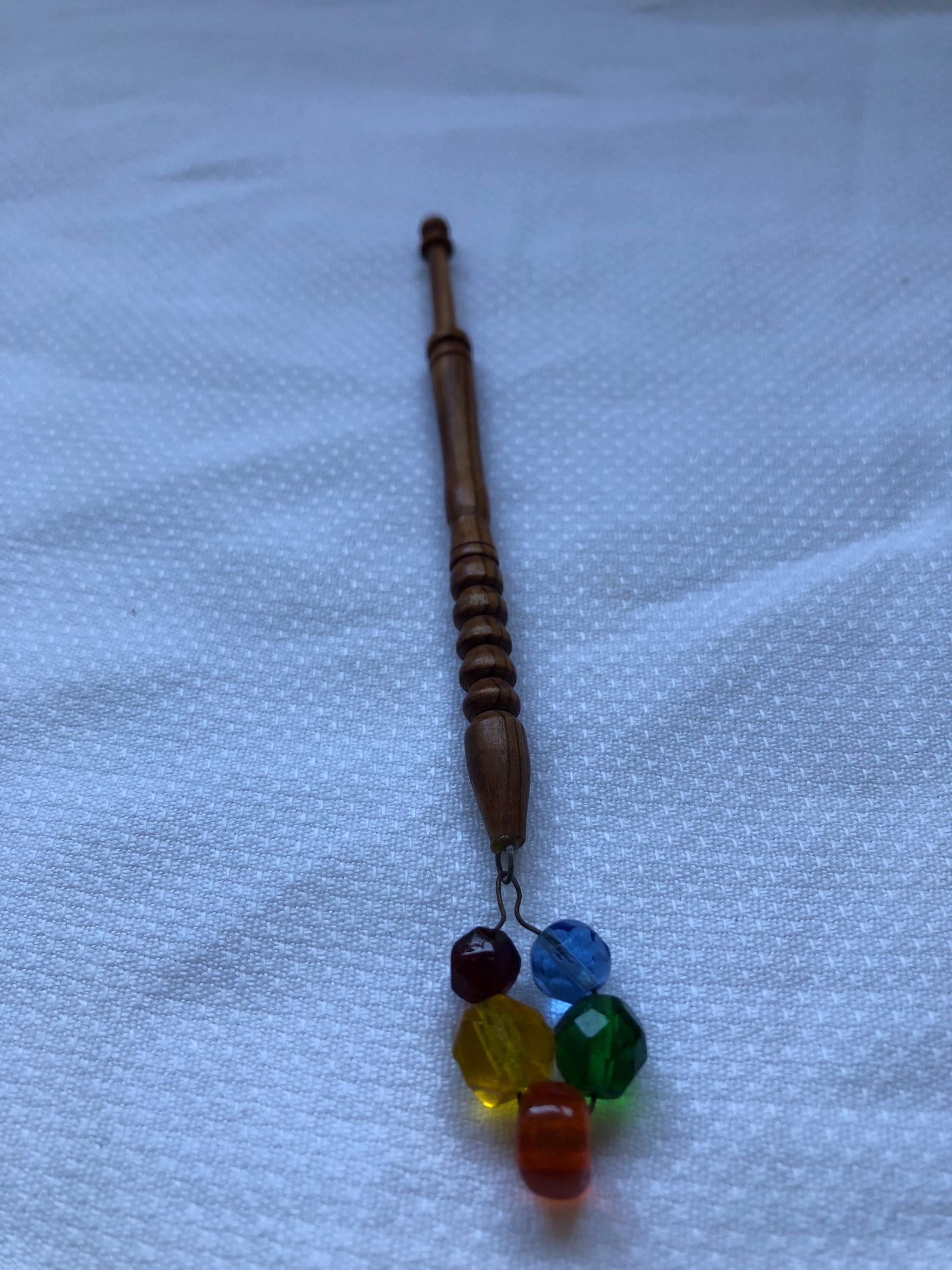 Single wooden lacemaking bobbin, beautiful example, very smooth to touch. Very unique fixing for the glass spangles