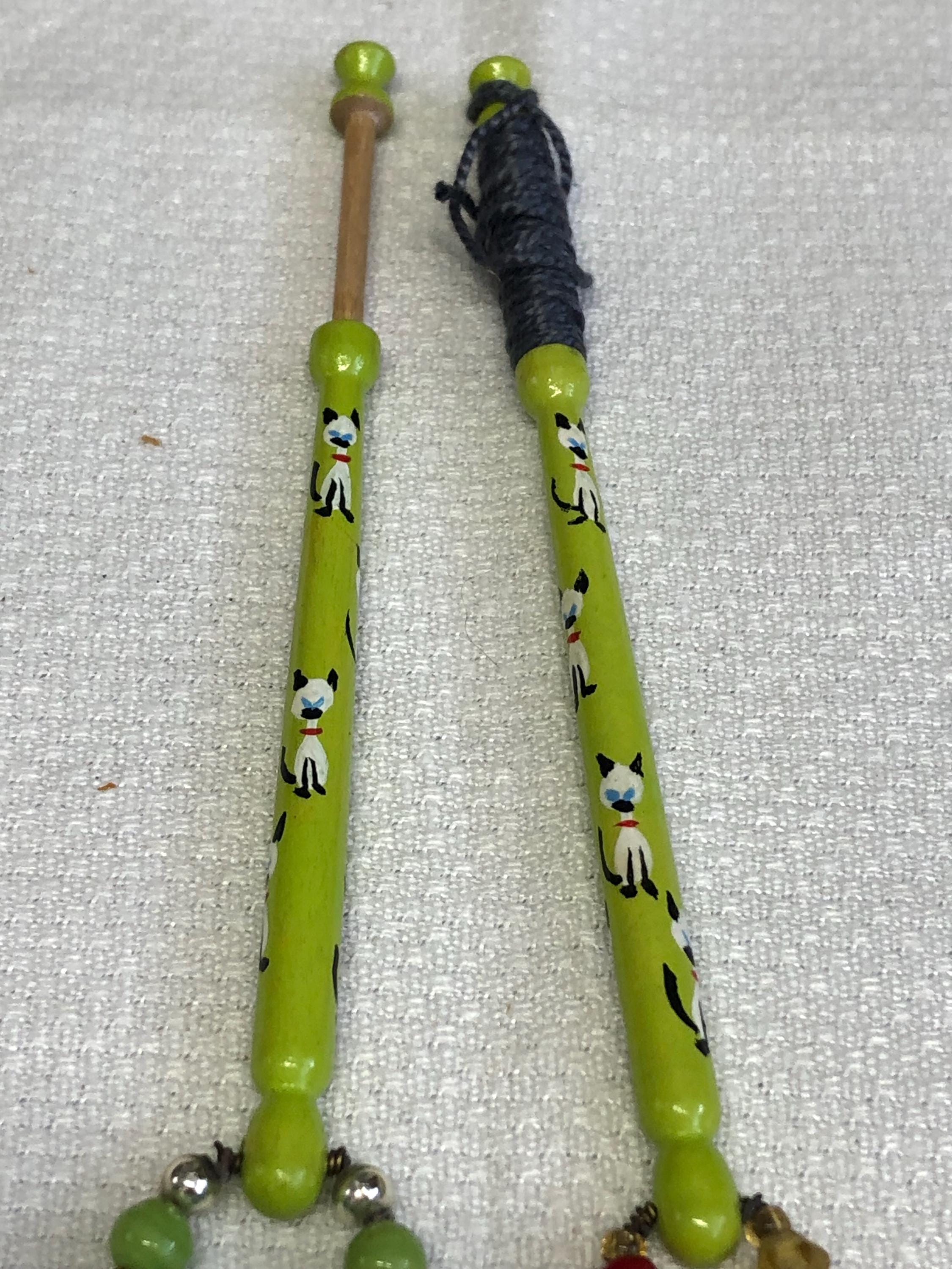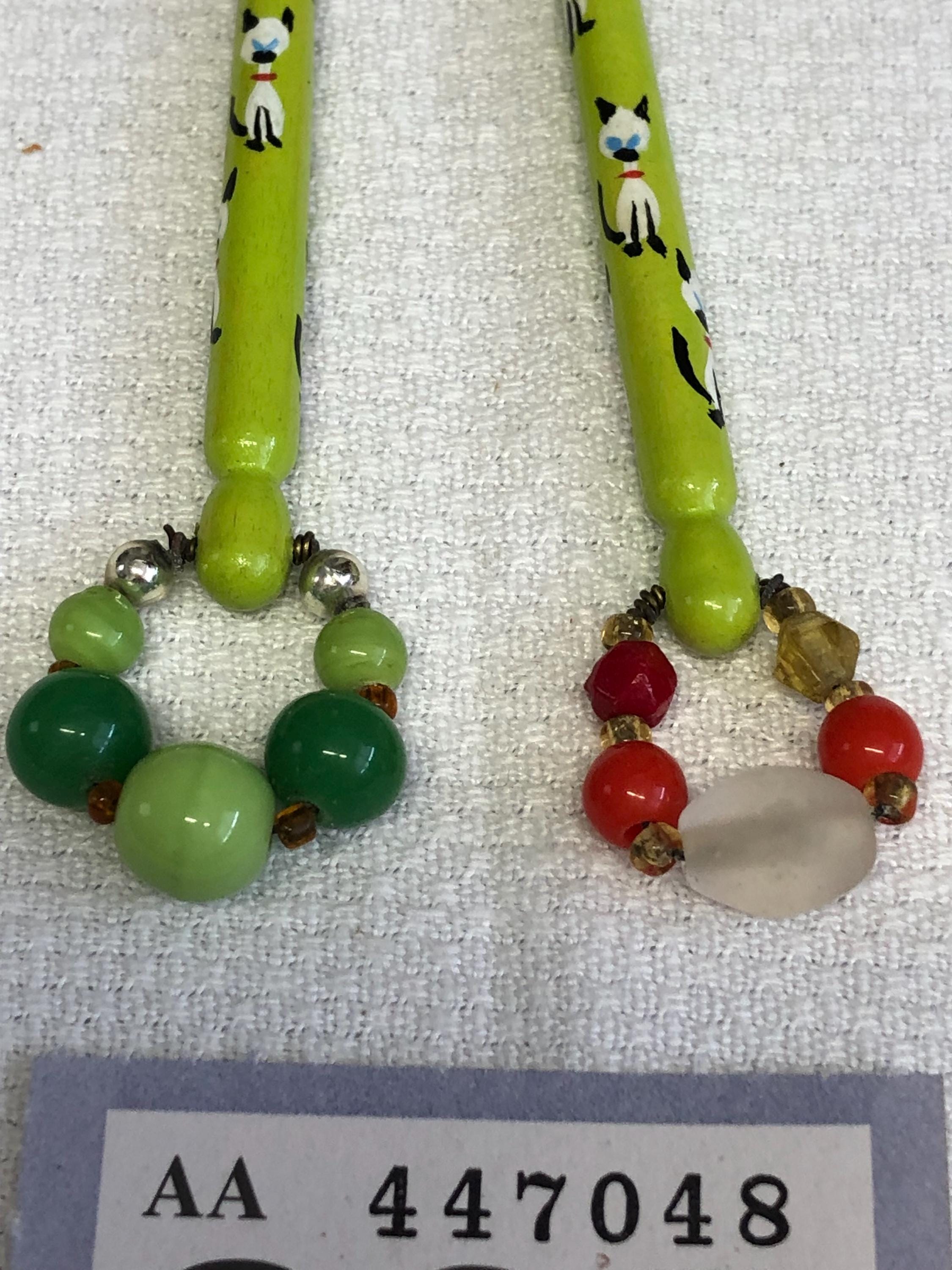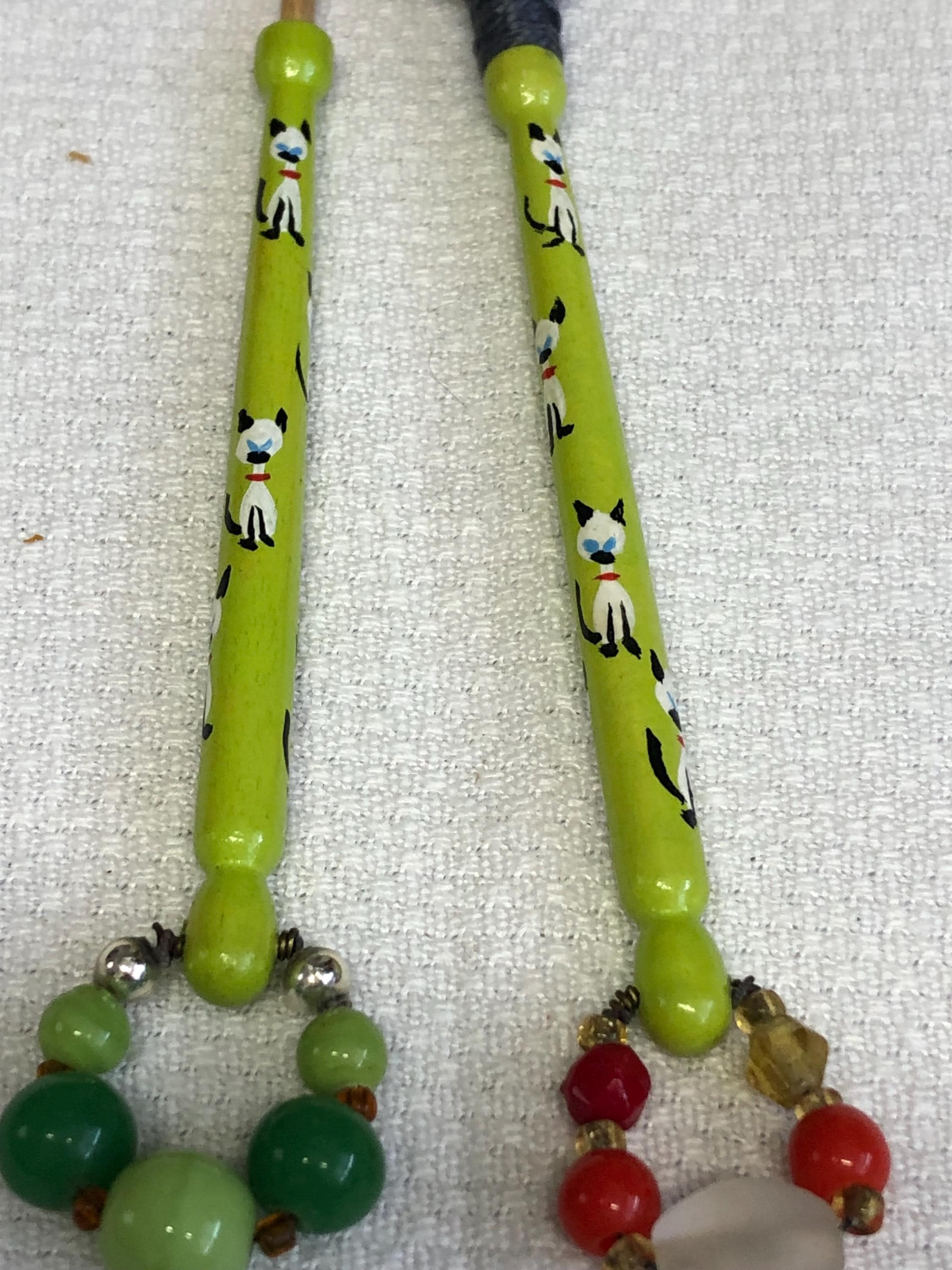 1 pair of hand painted wooden lacemaking bobbins, bright green with cats