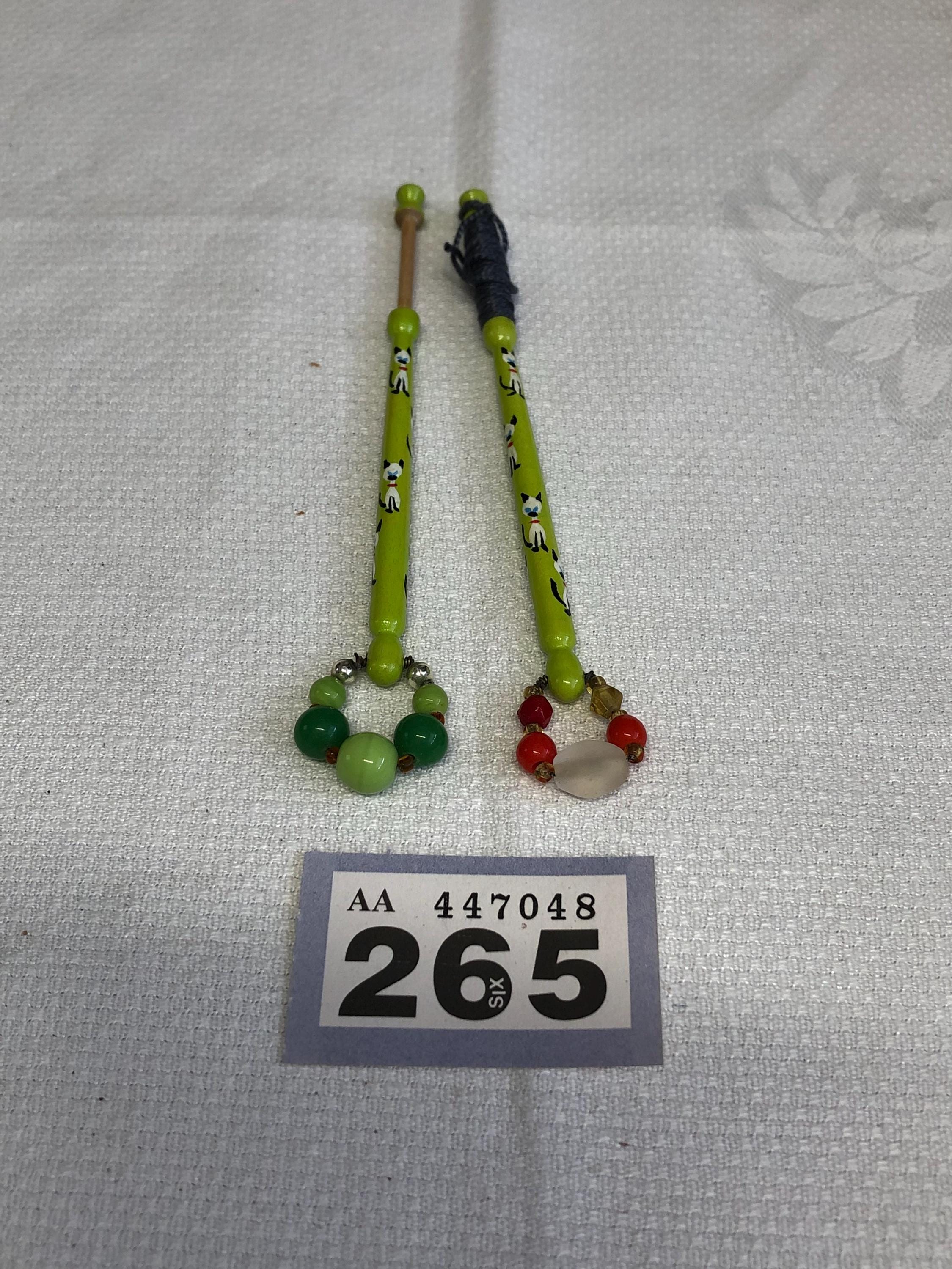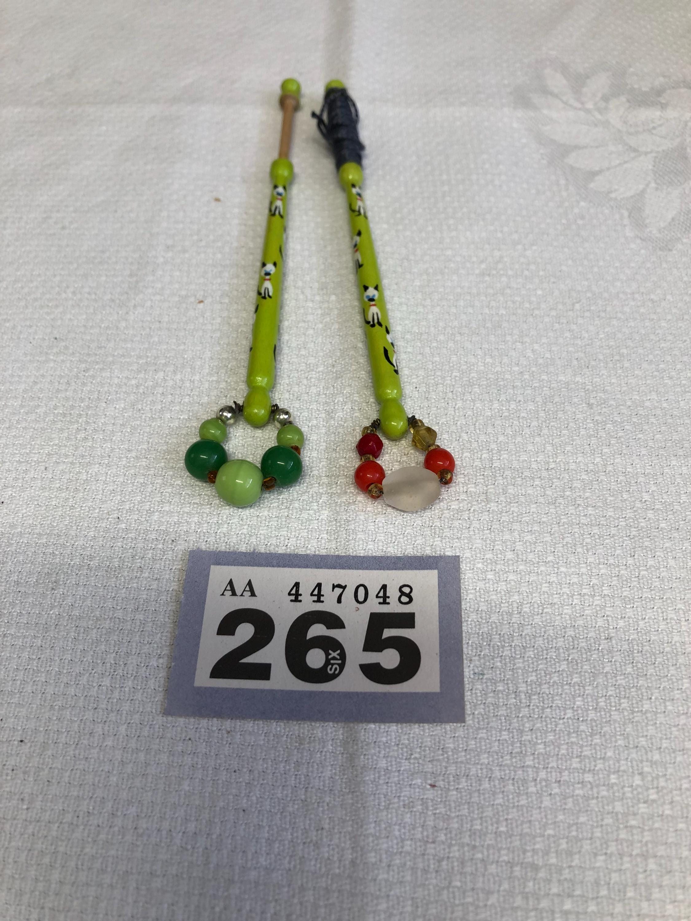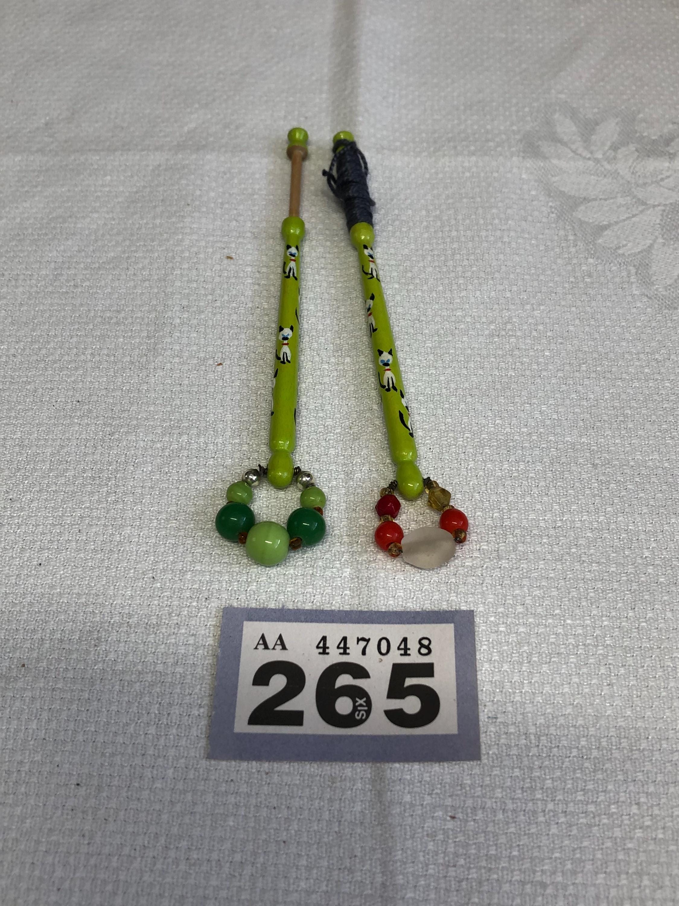 1 pair of hand painted wooden lacemaking bobbins, bright green with cats