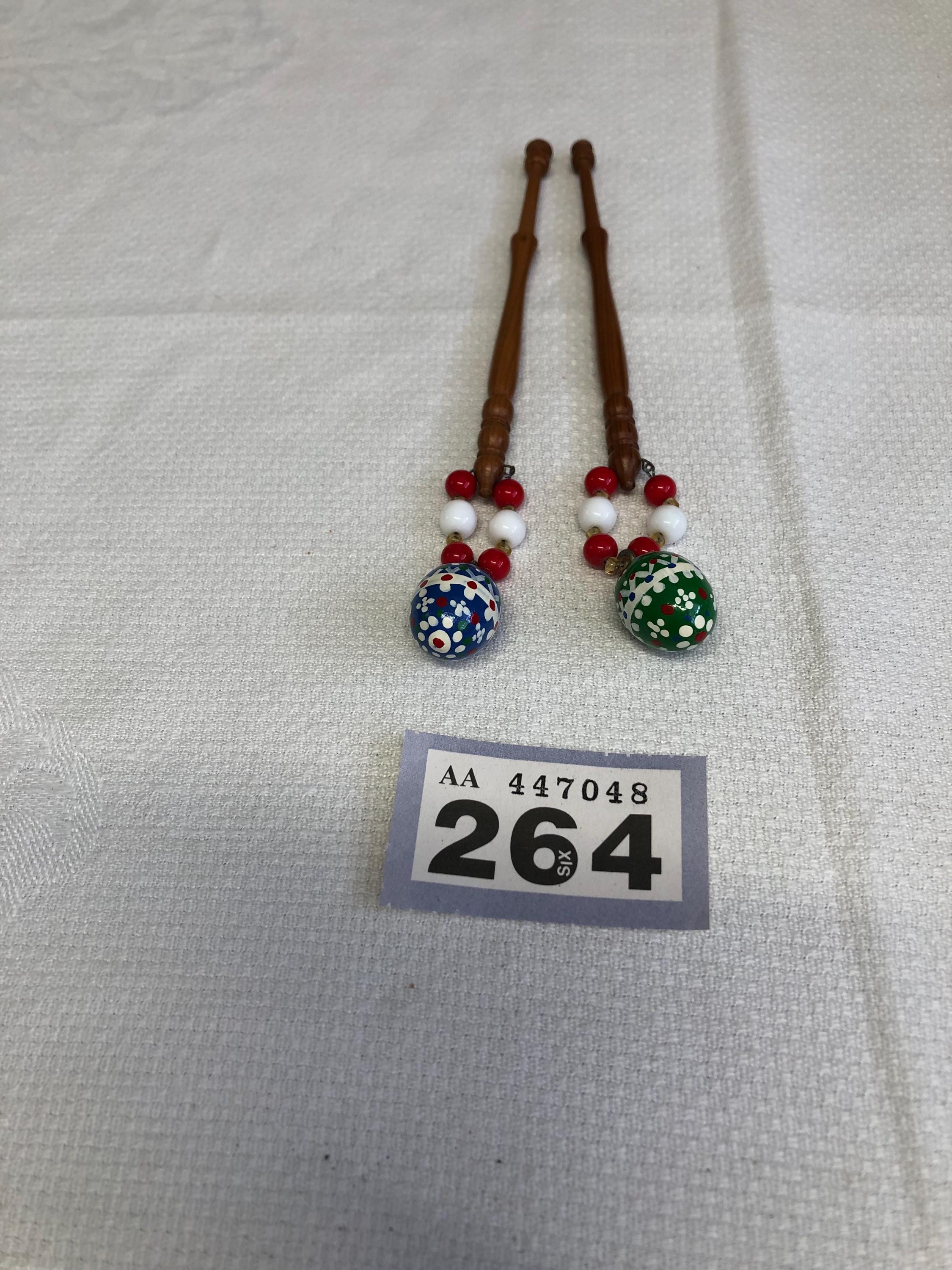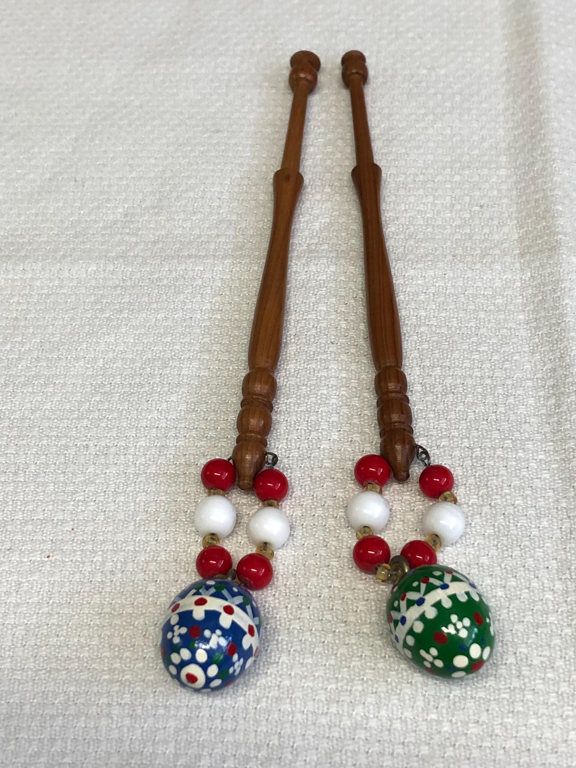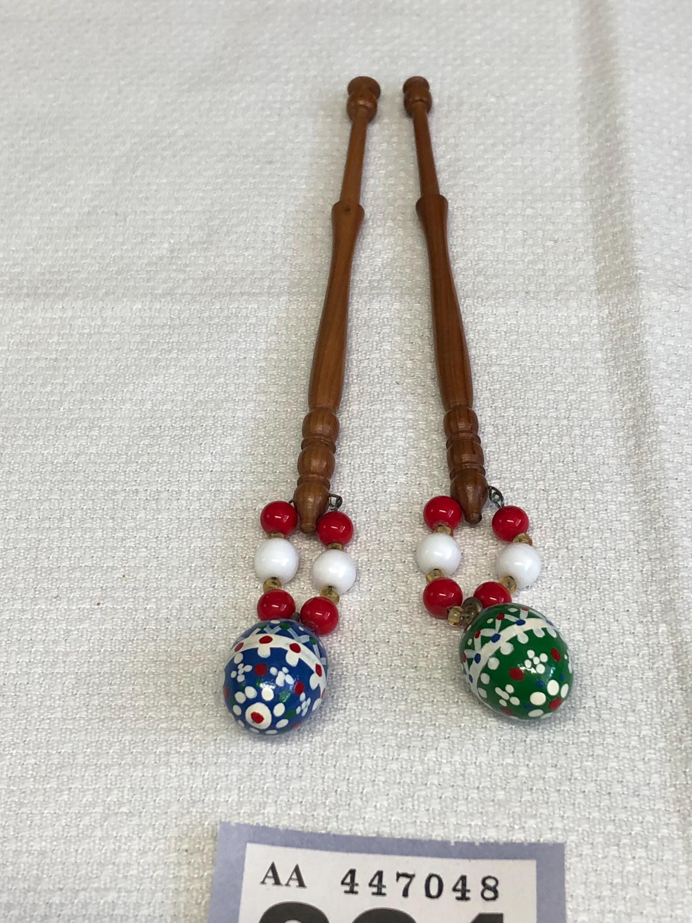 1 pair of wooden lacemaking bobbins, with easter egg spangles