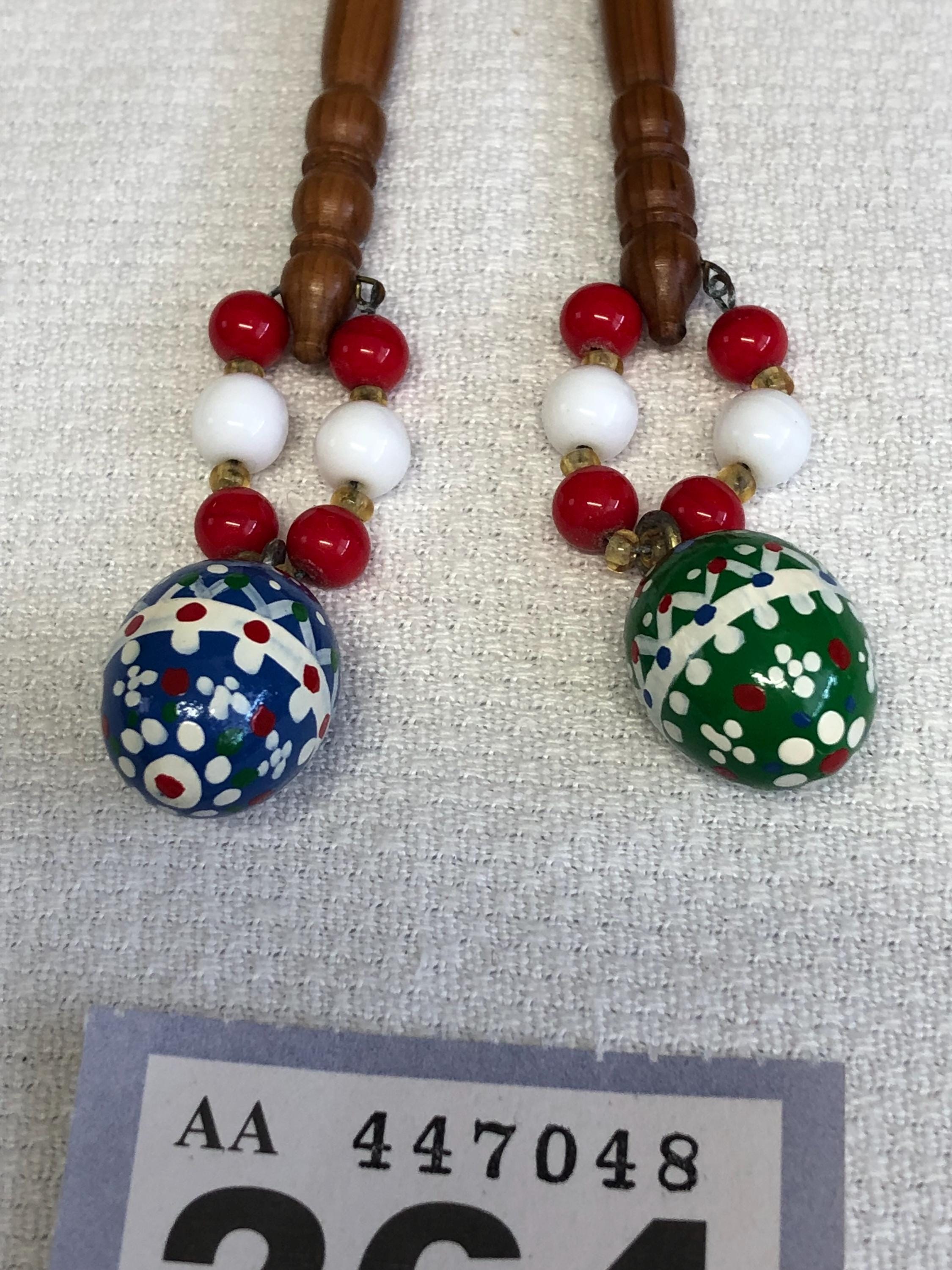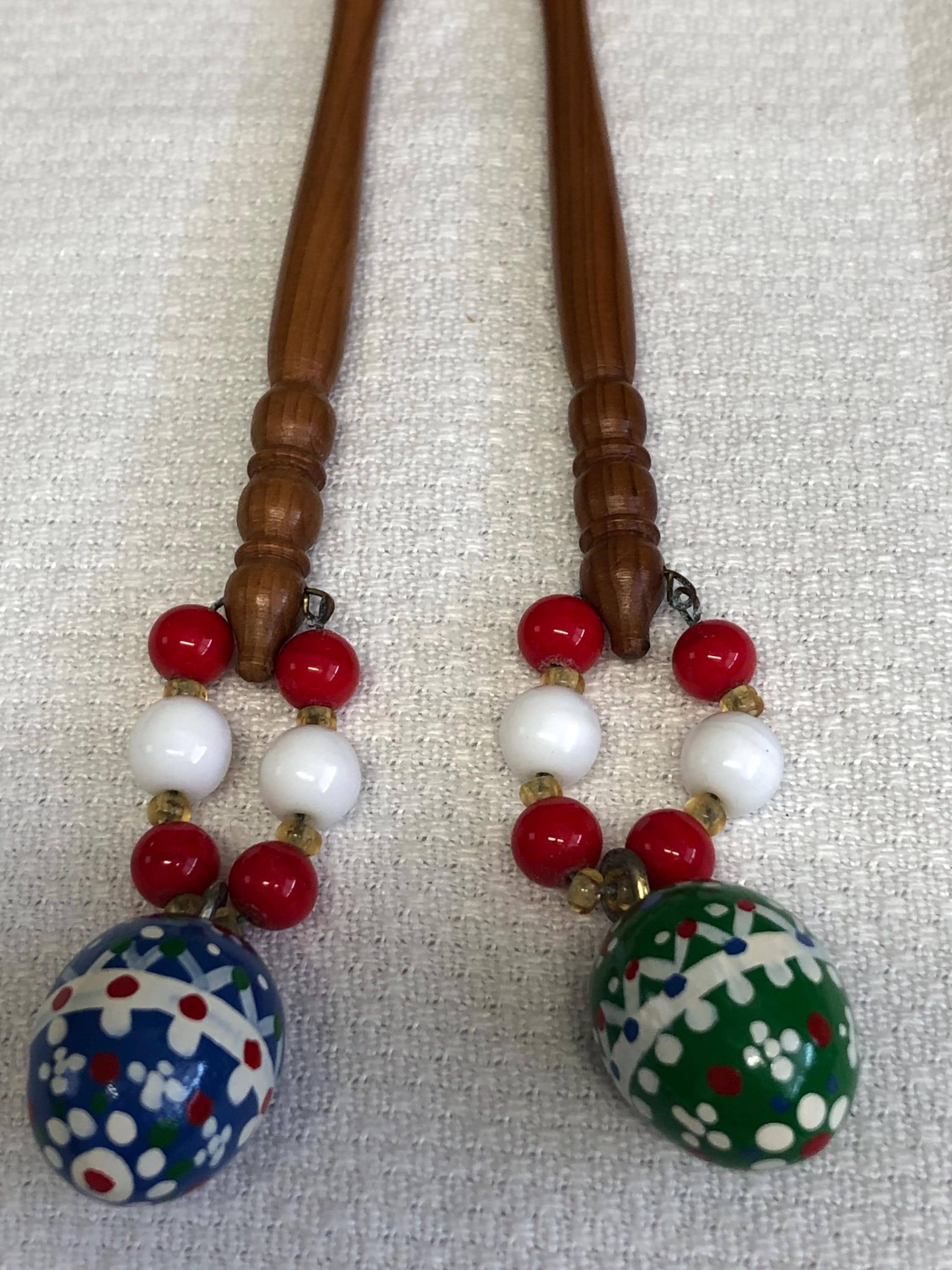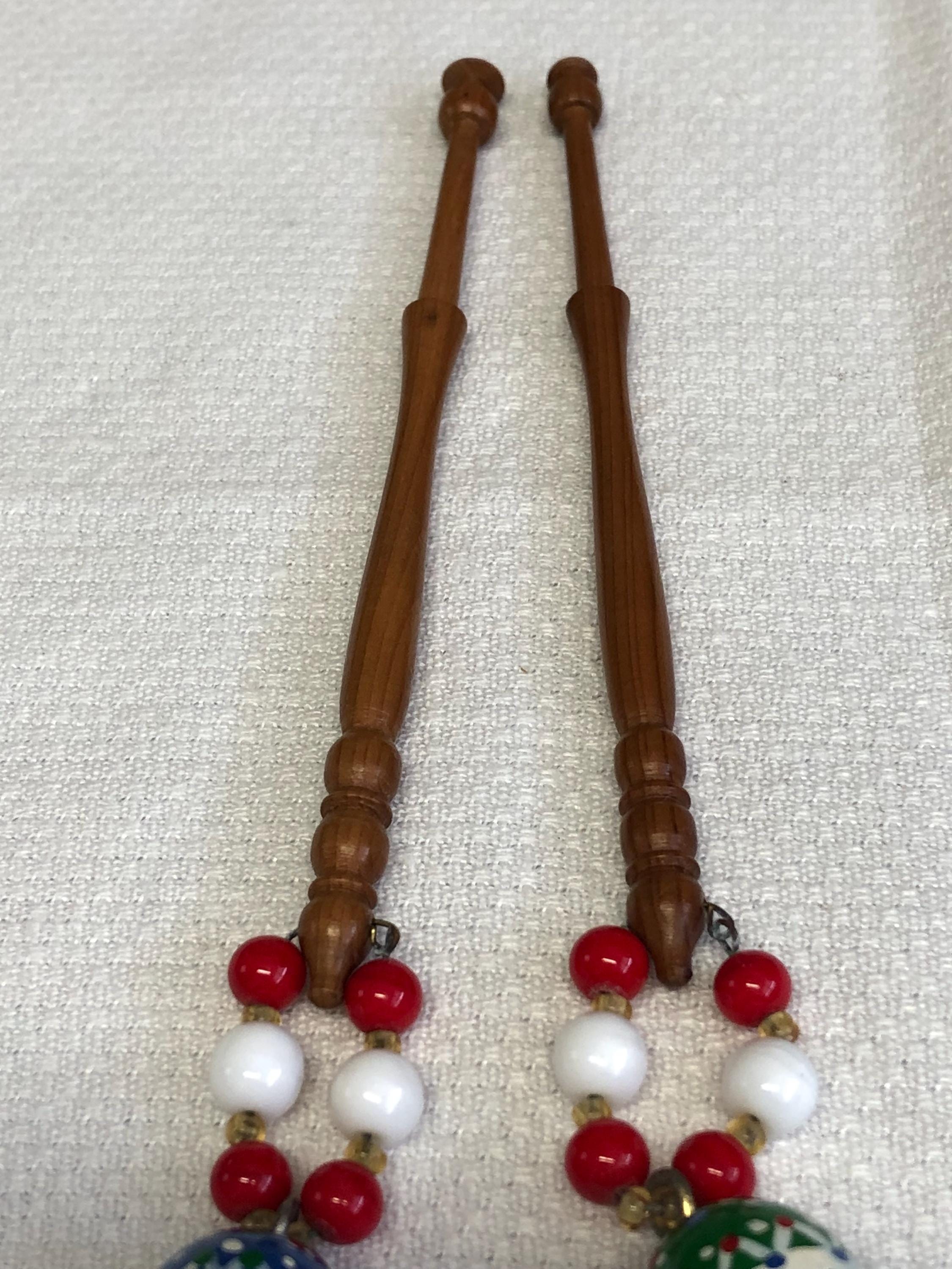 1 pair of wooden lacemaking bobbins, with easter egg spangles