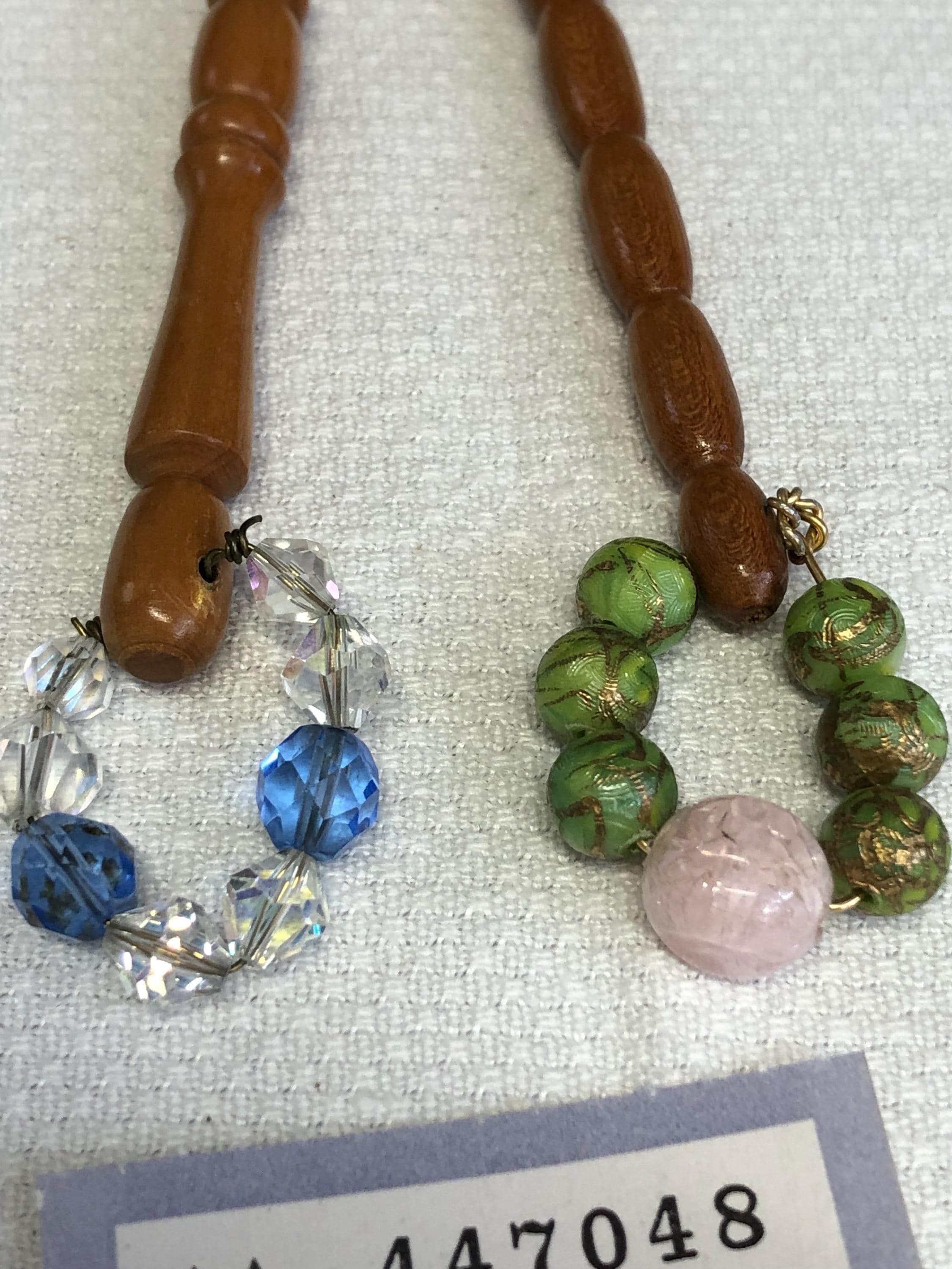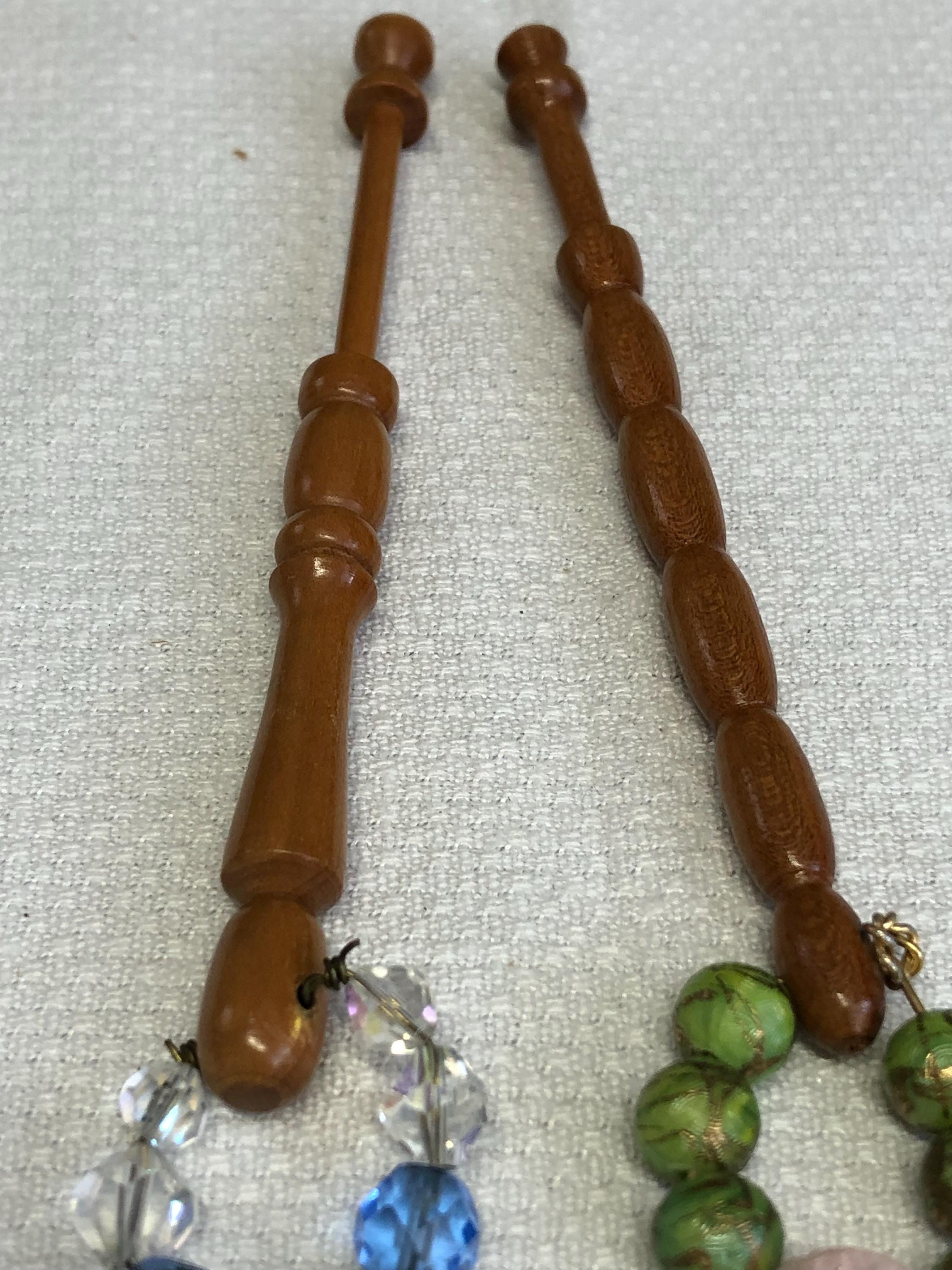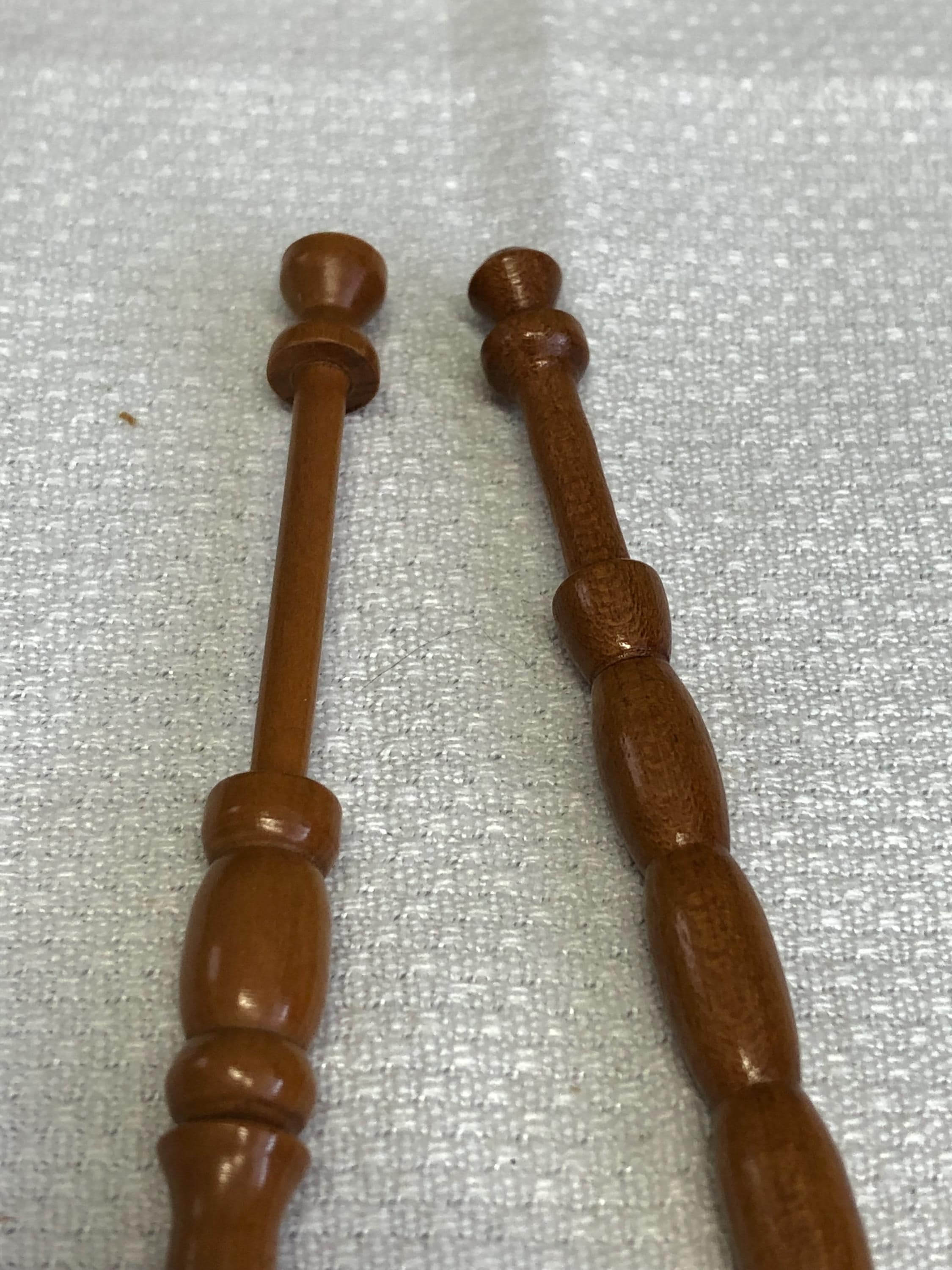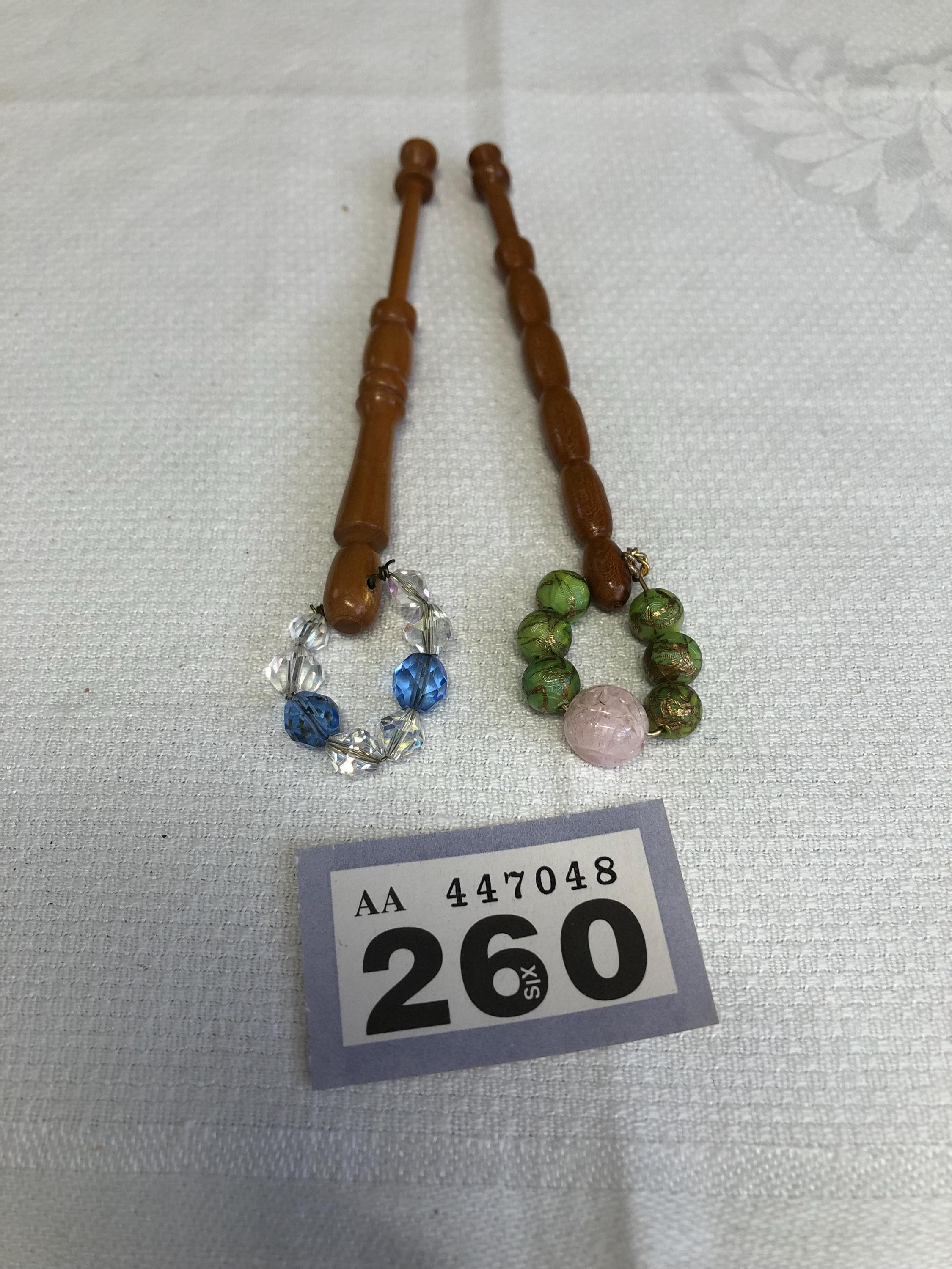 Selling as 1 pair of small wooden lacemaking bobbins with spangles