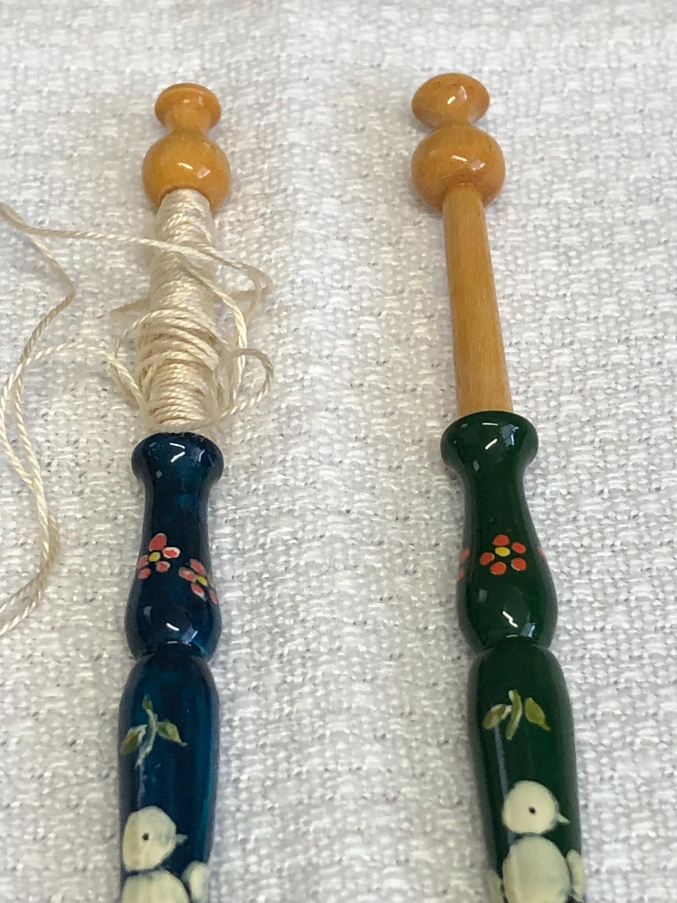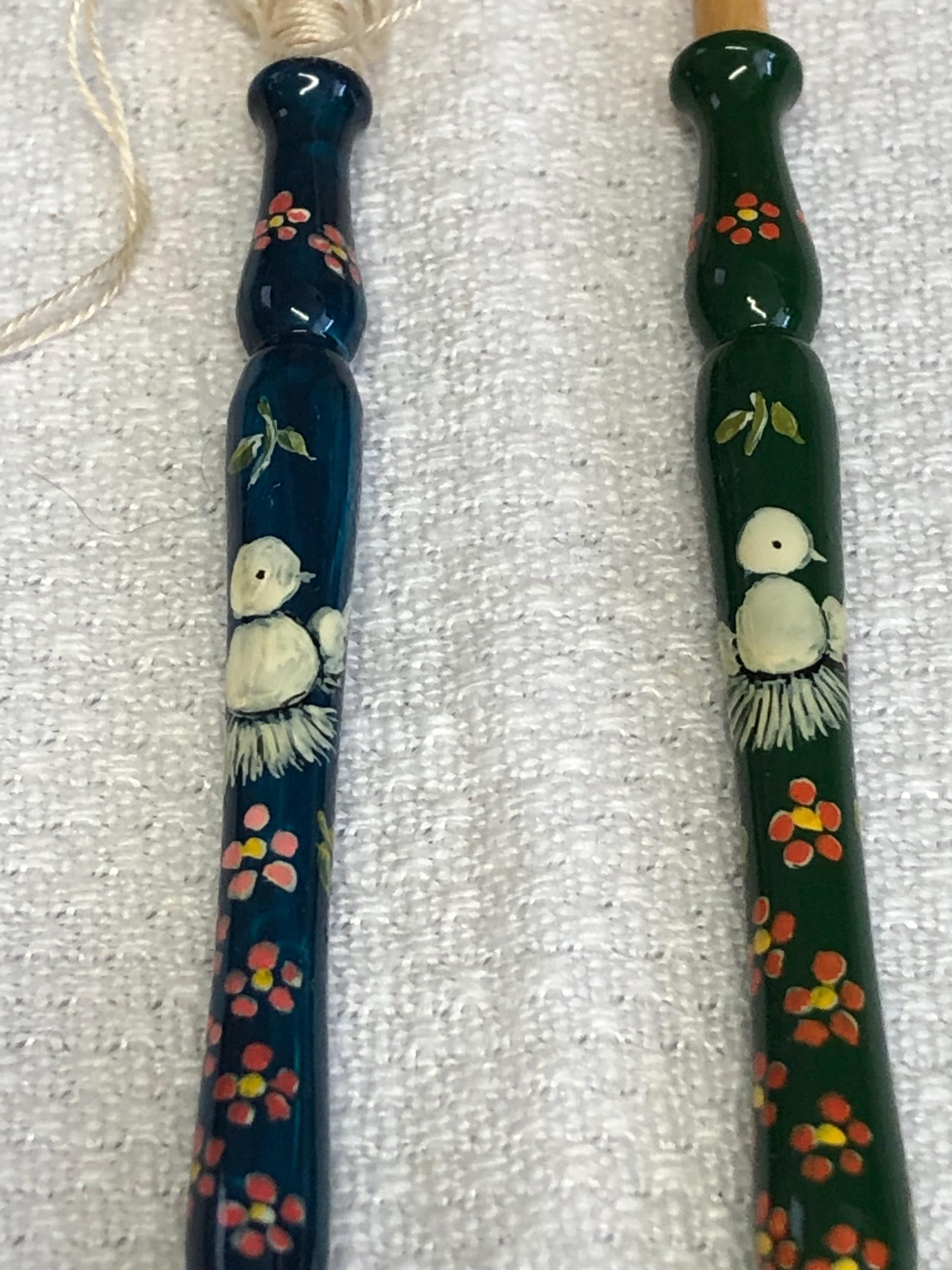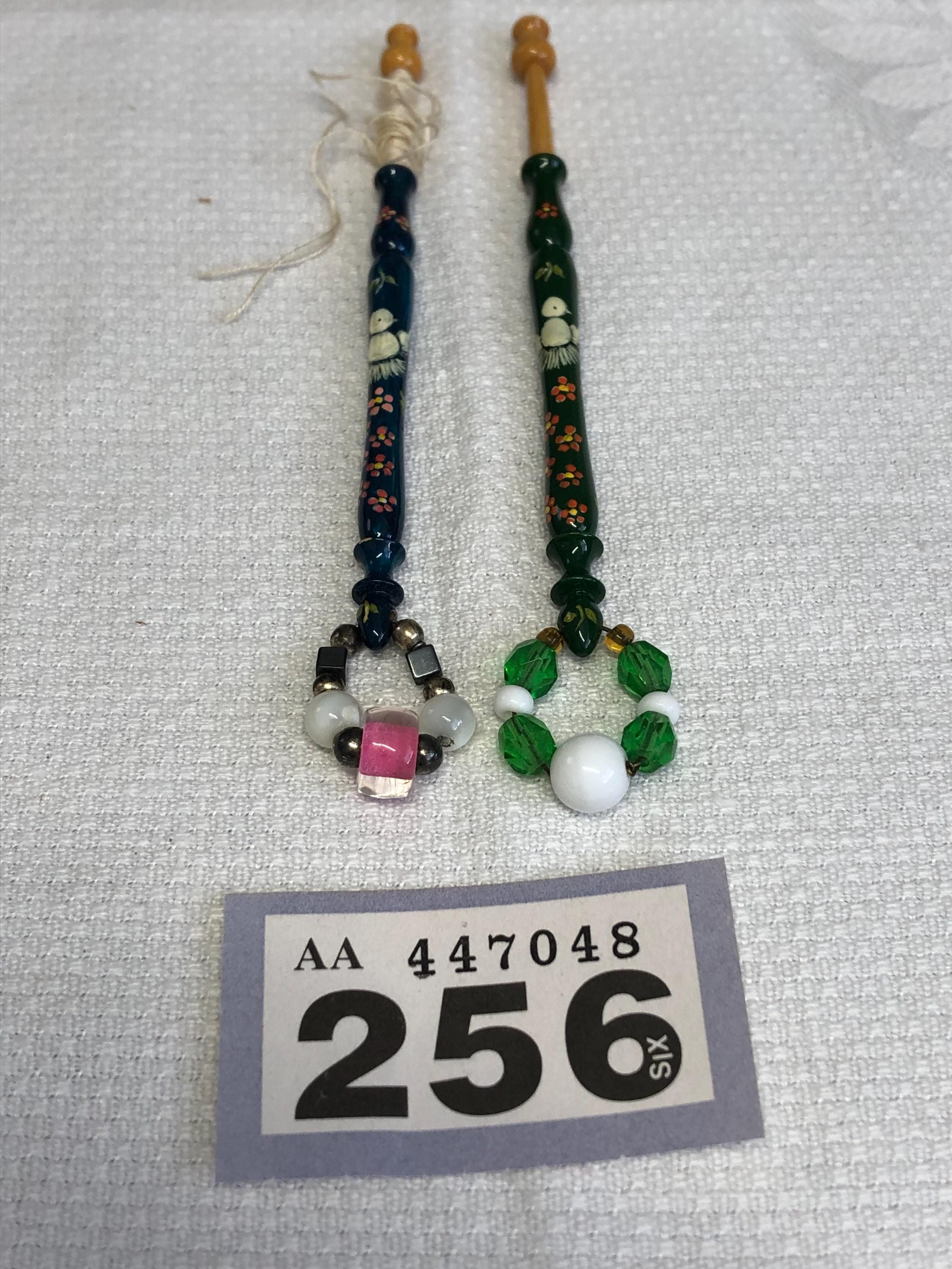 One pair of hand painted wood lacemaking bobbins with spangles.