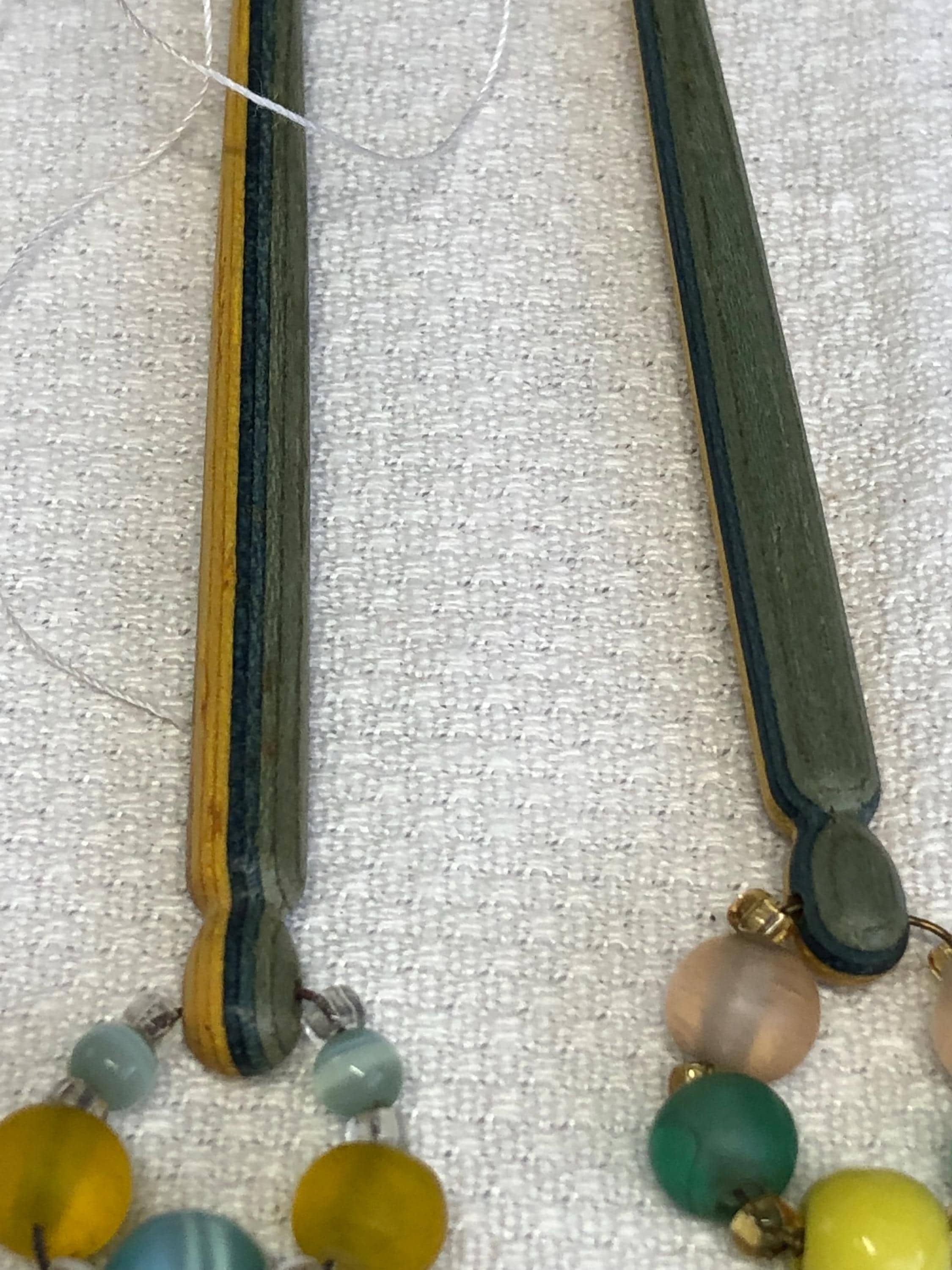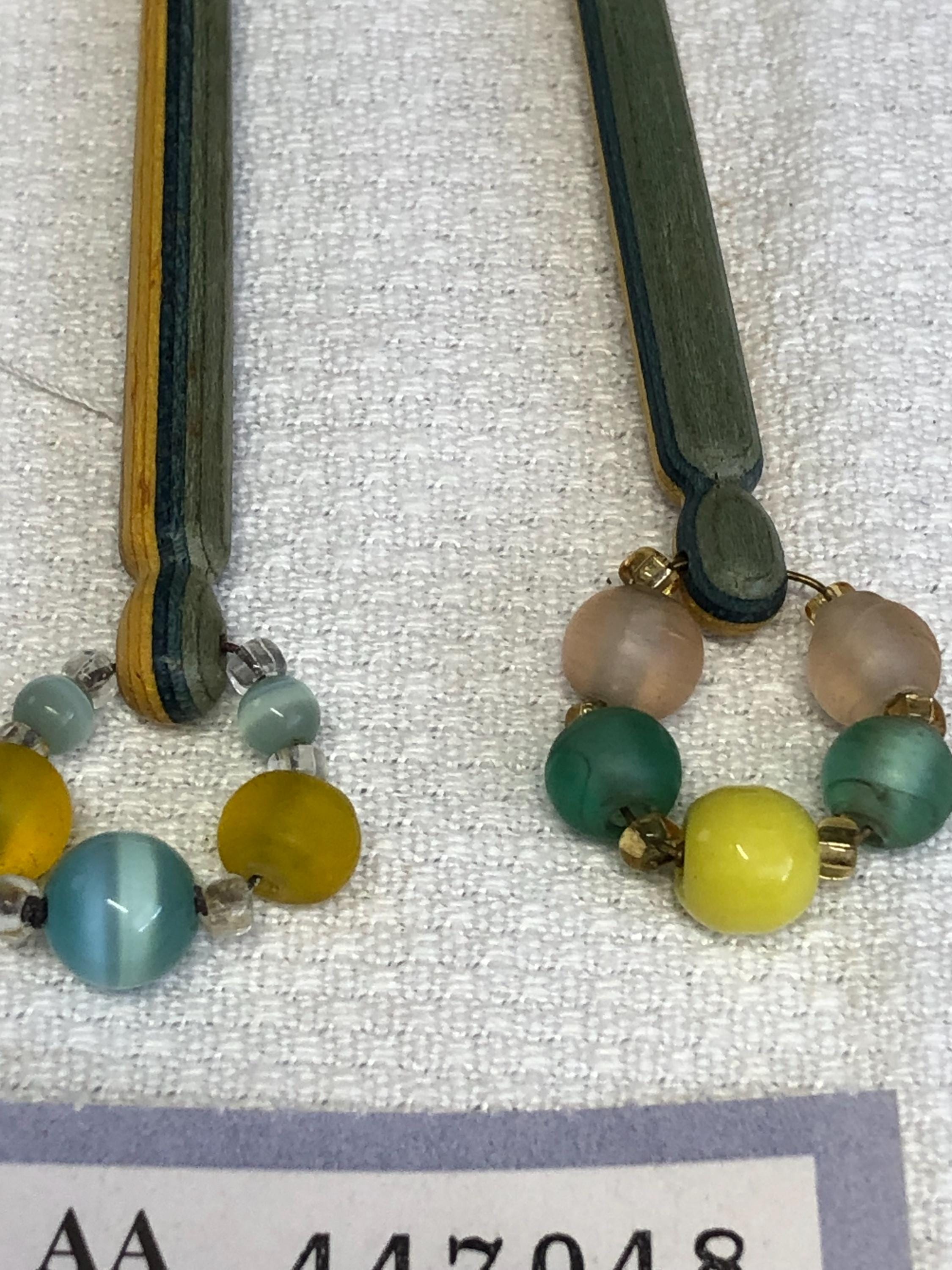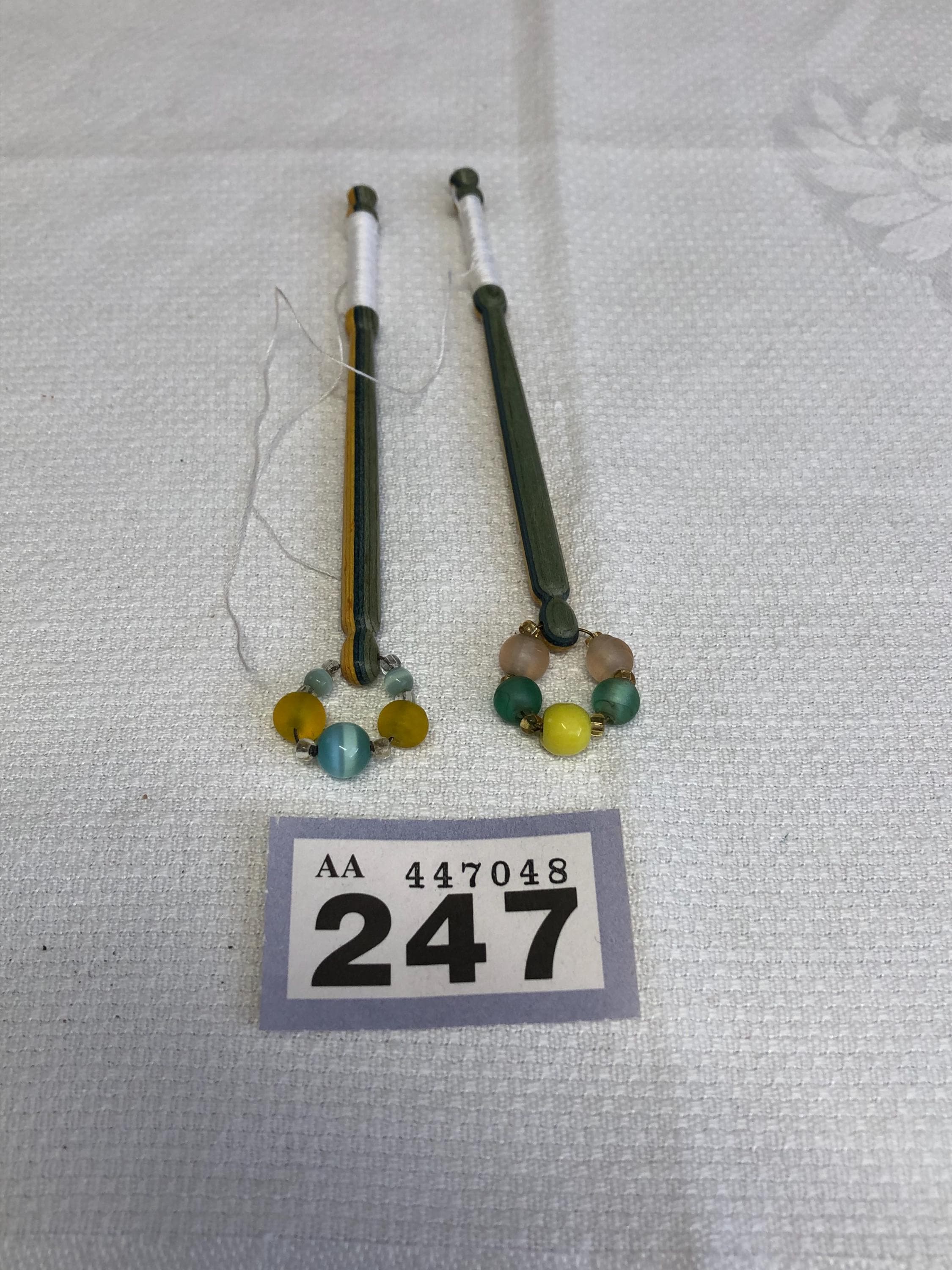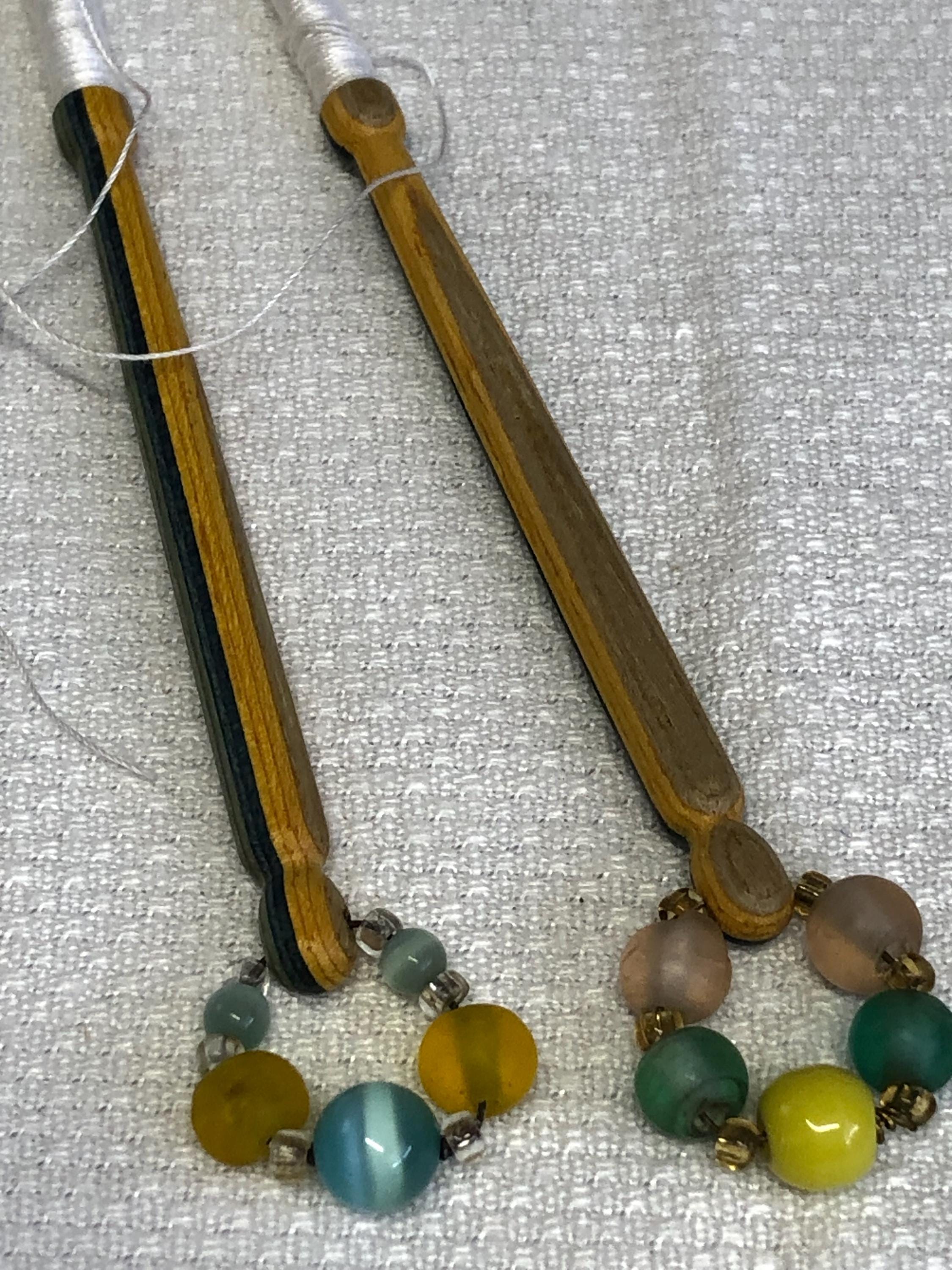 One pair of lacemaking bobbins with spangles. These have been dyed blue and yellow.