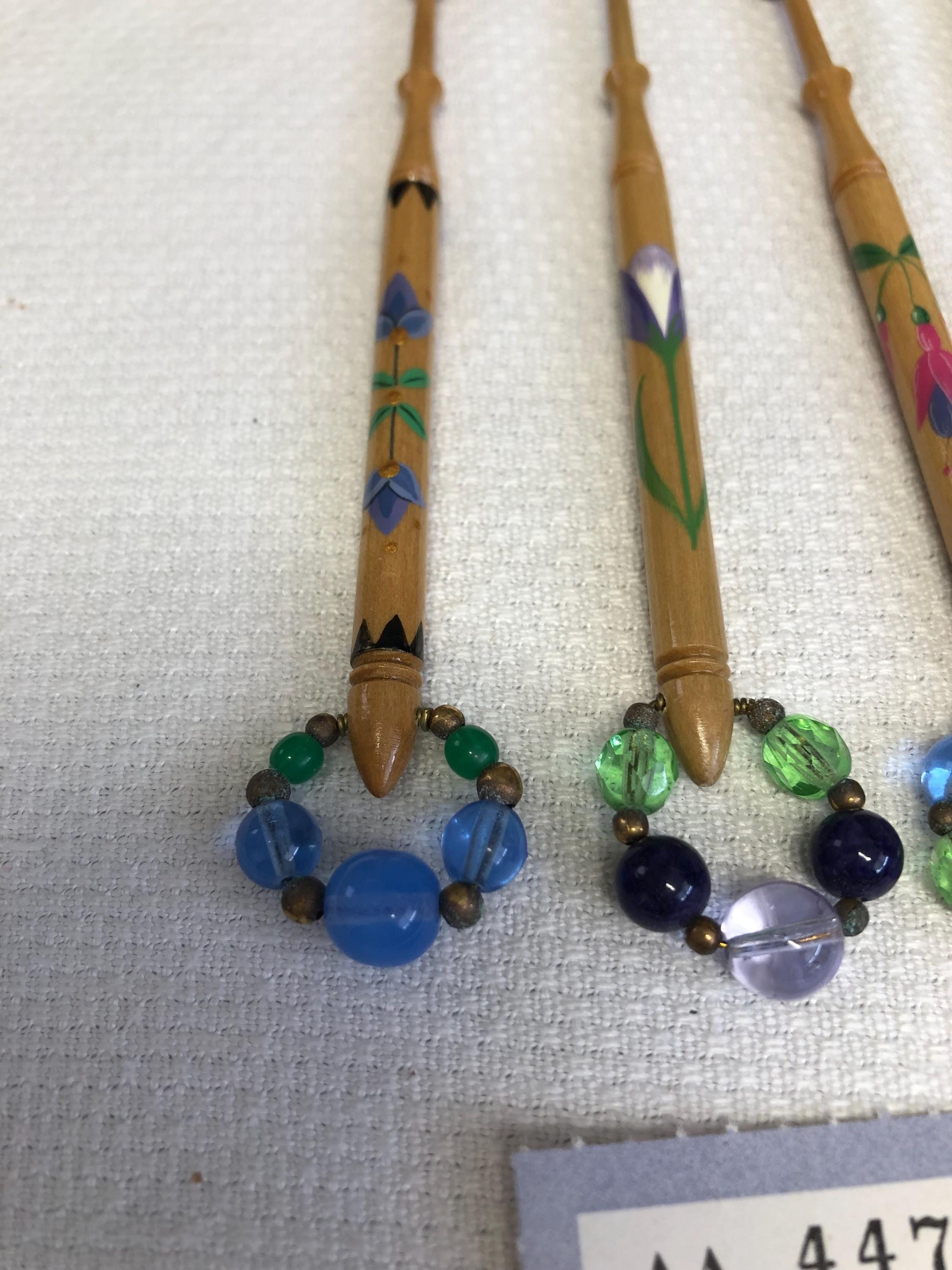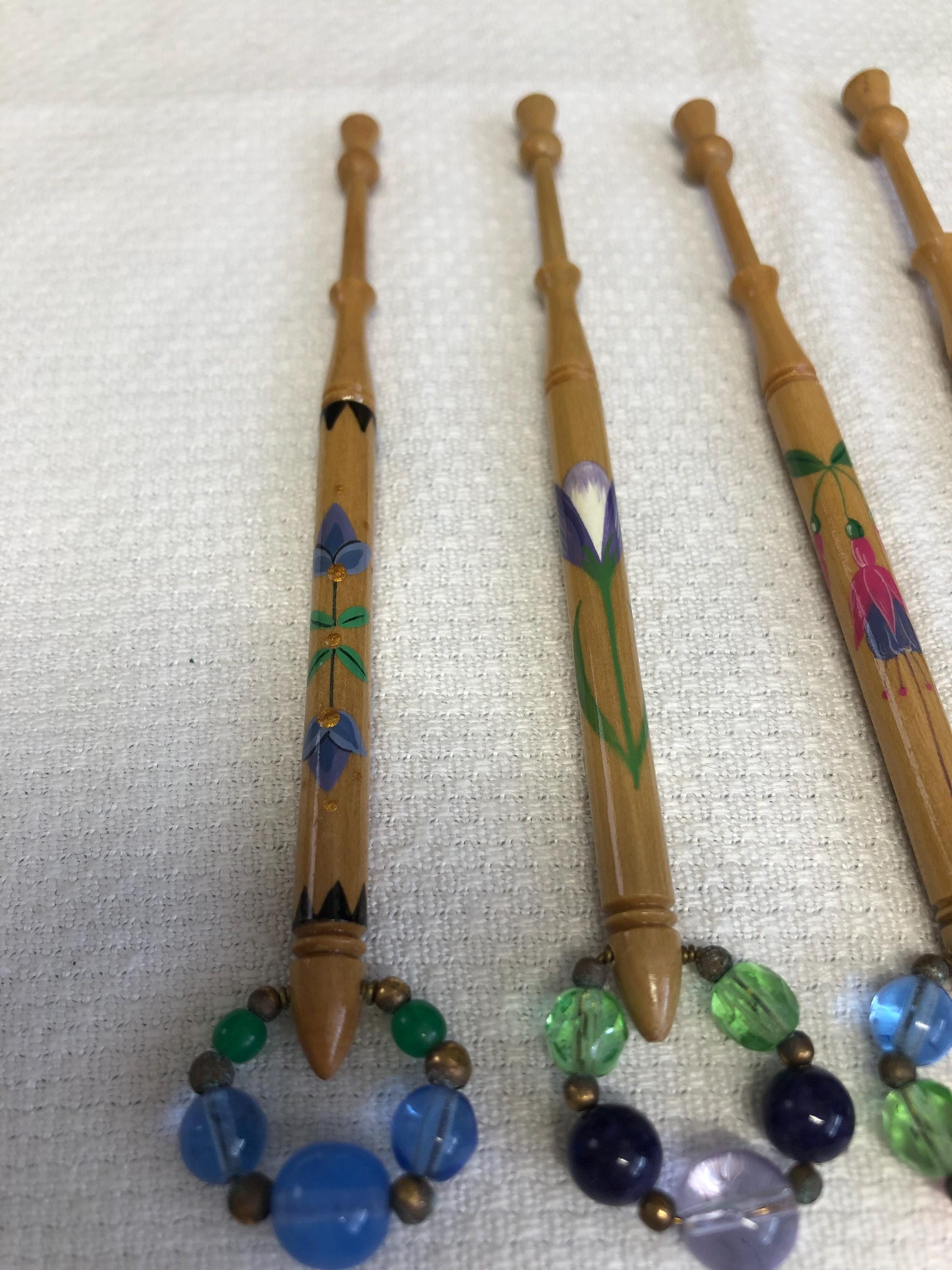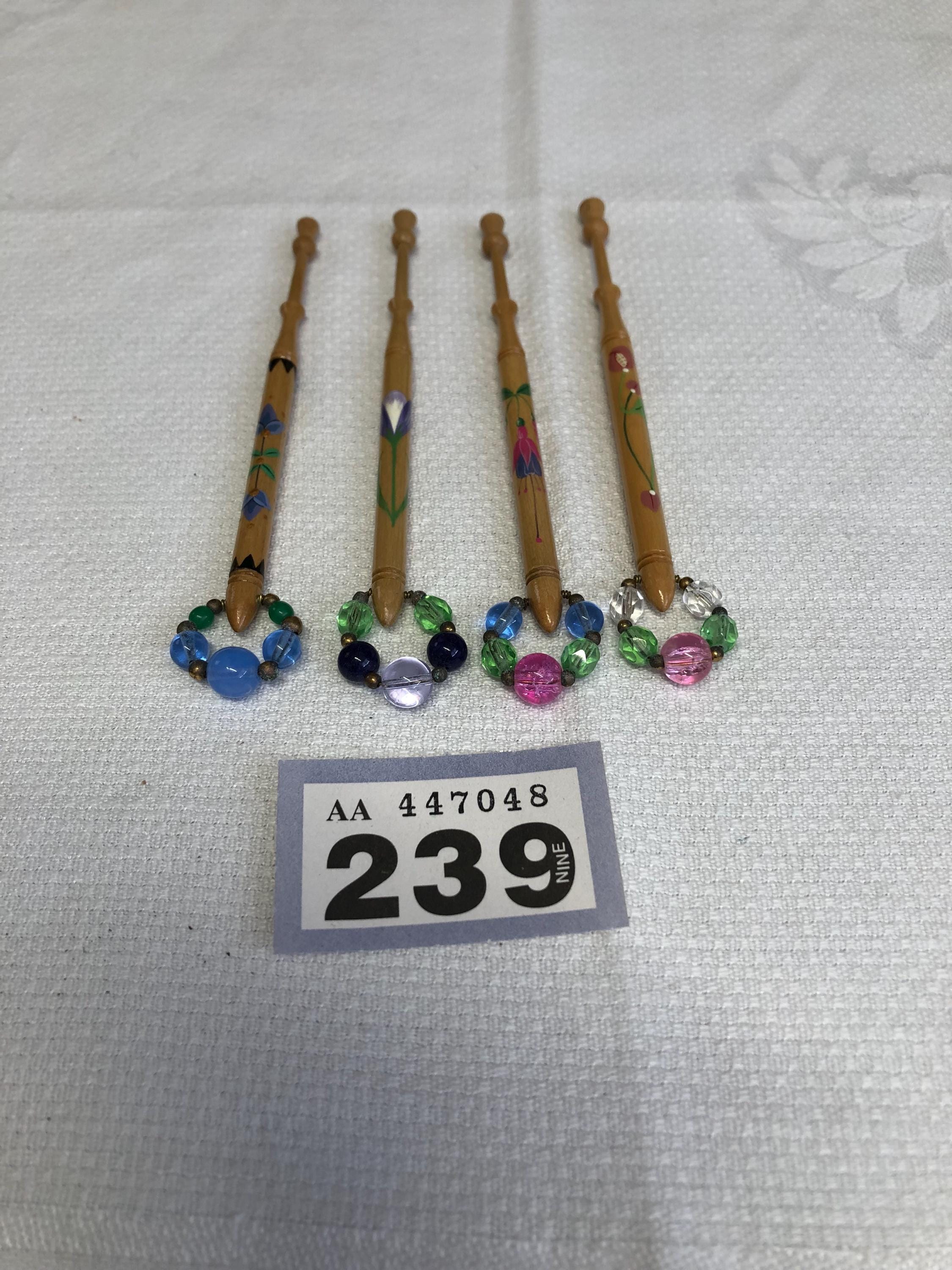 One set of 4 hand painted lacemaking bobbins with spangles.