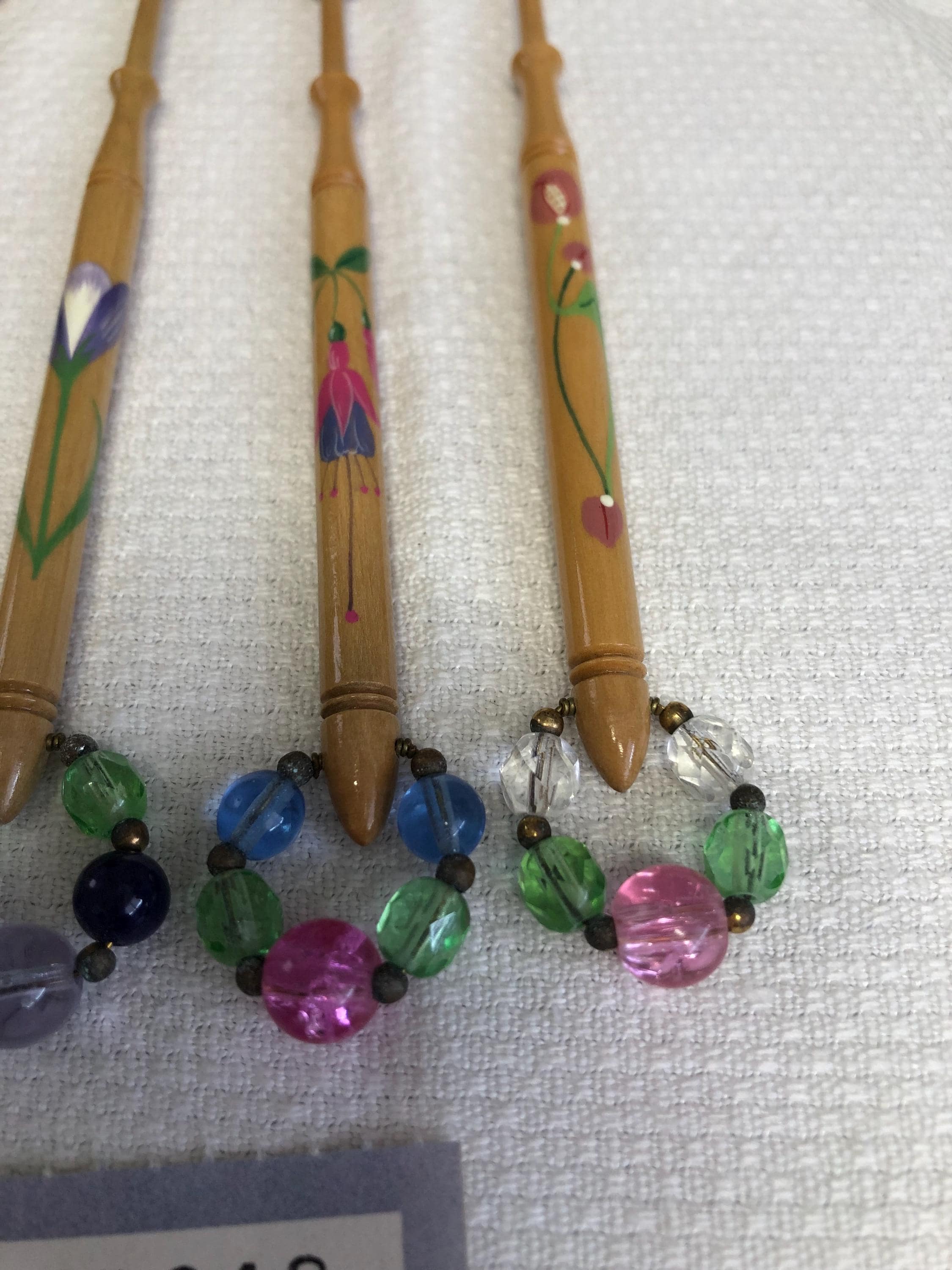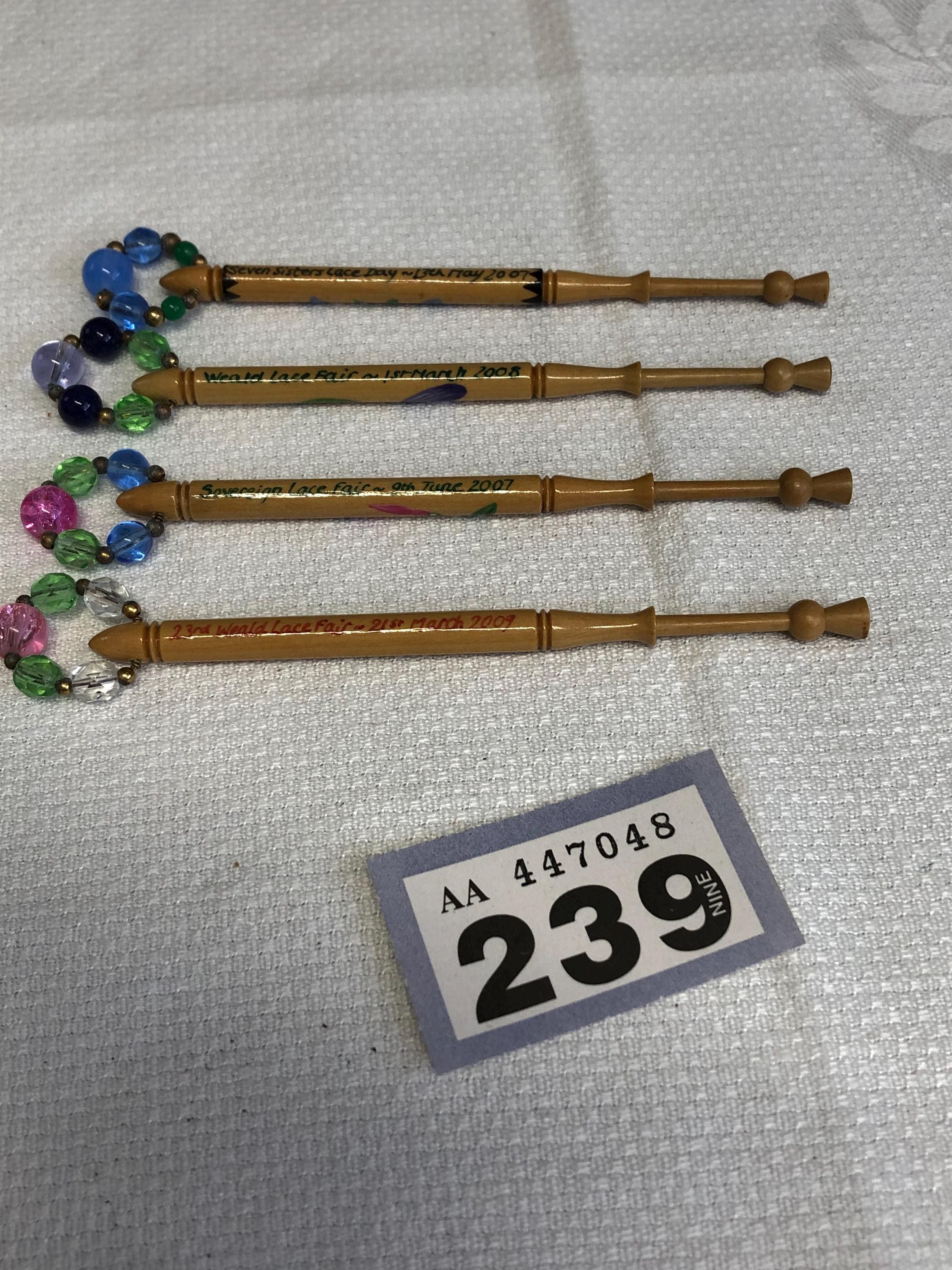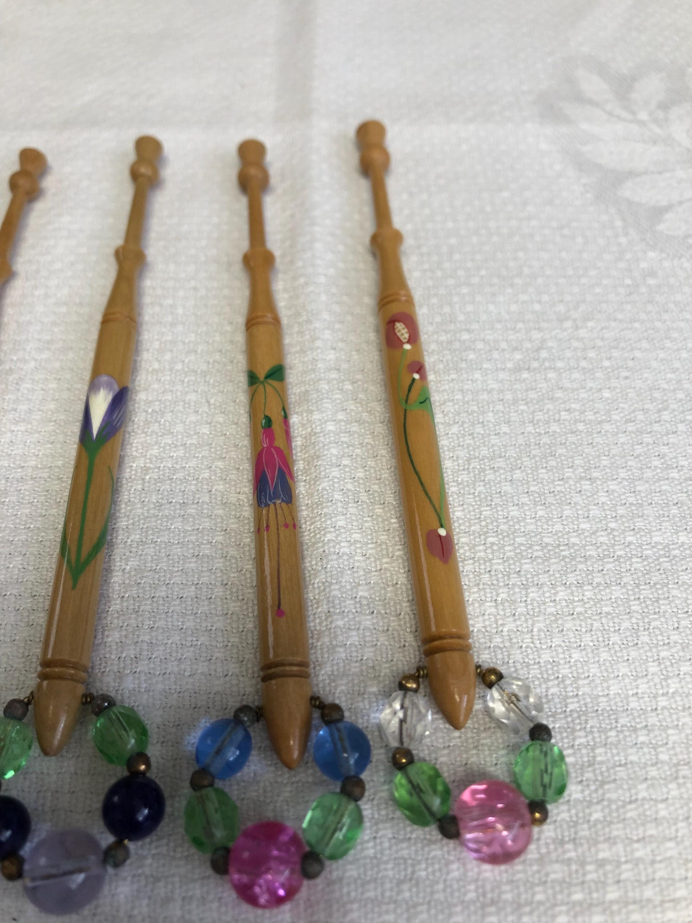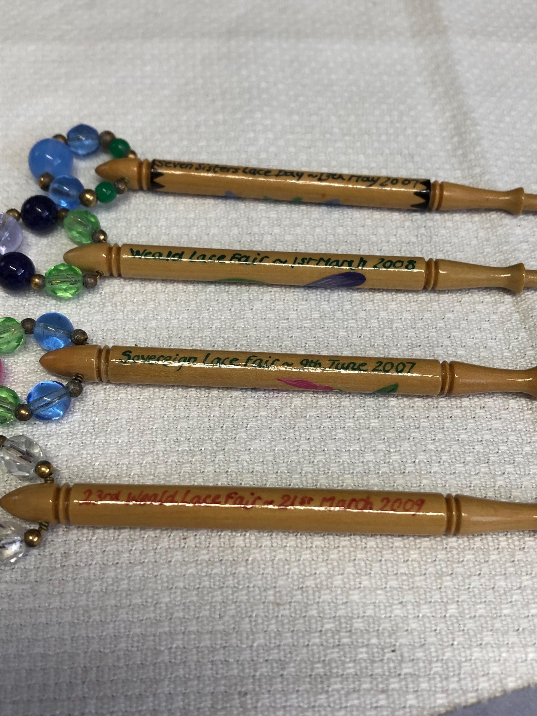 One set of 4 hand painted lacemaking bobbins with spangles.