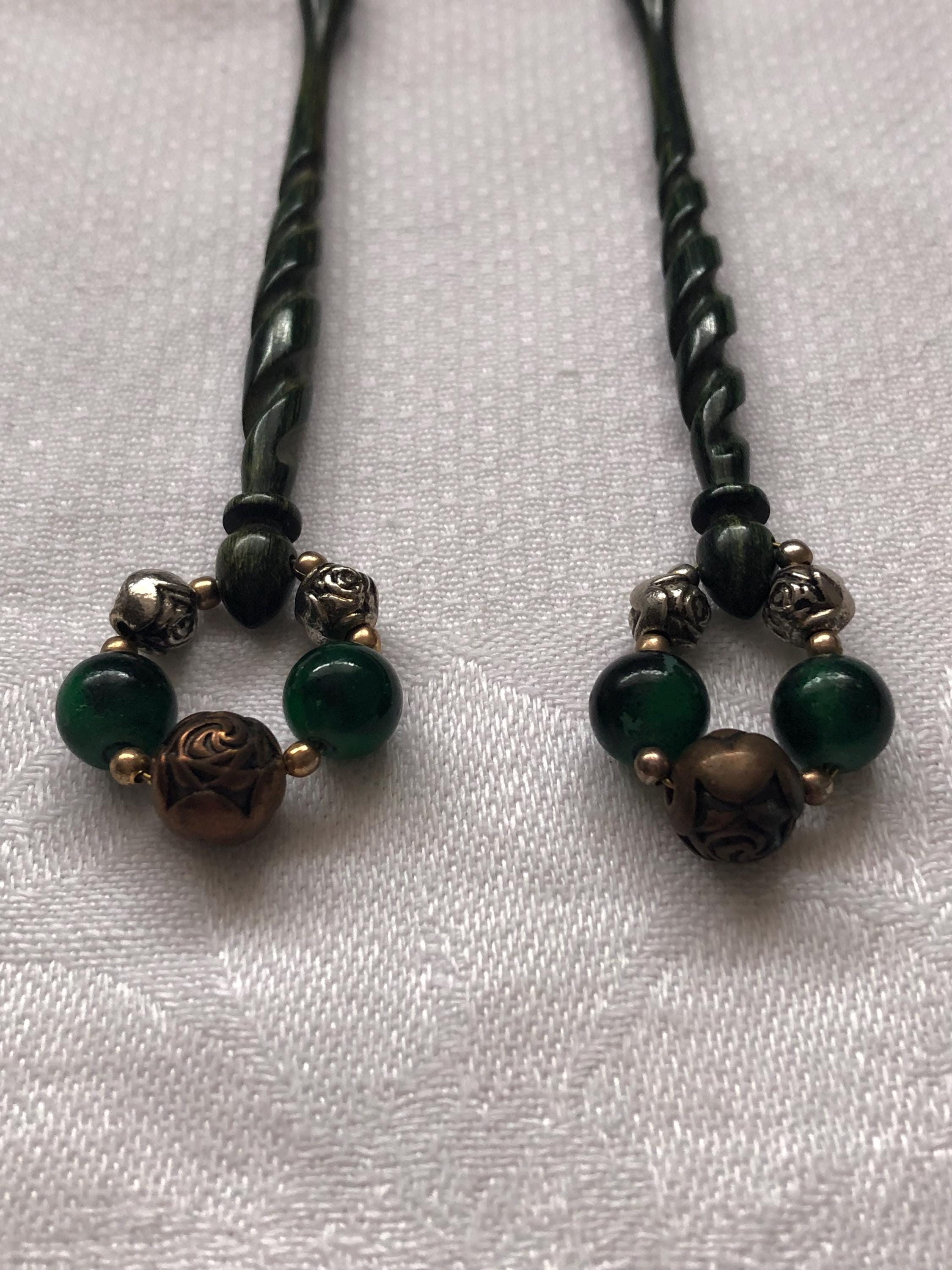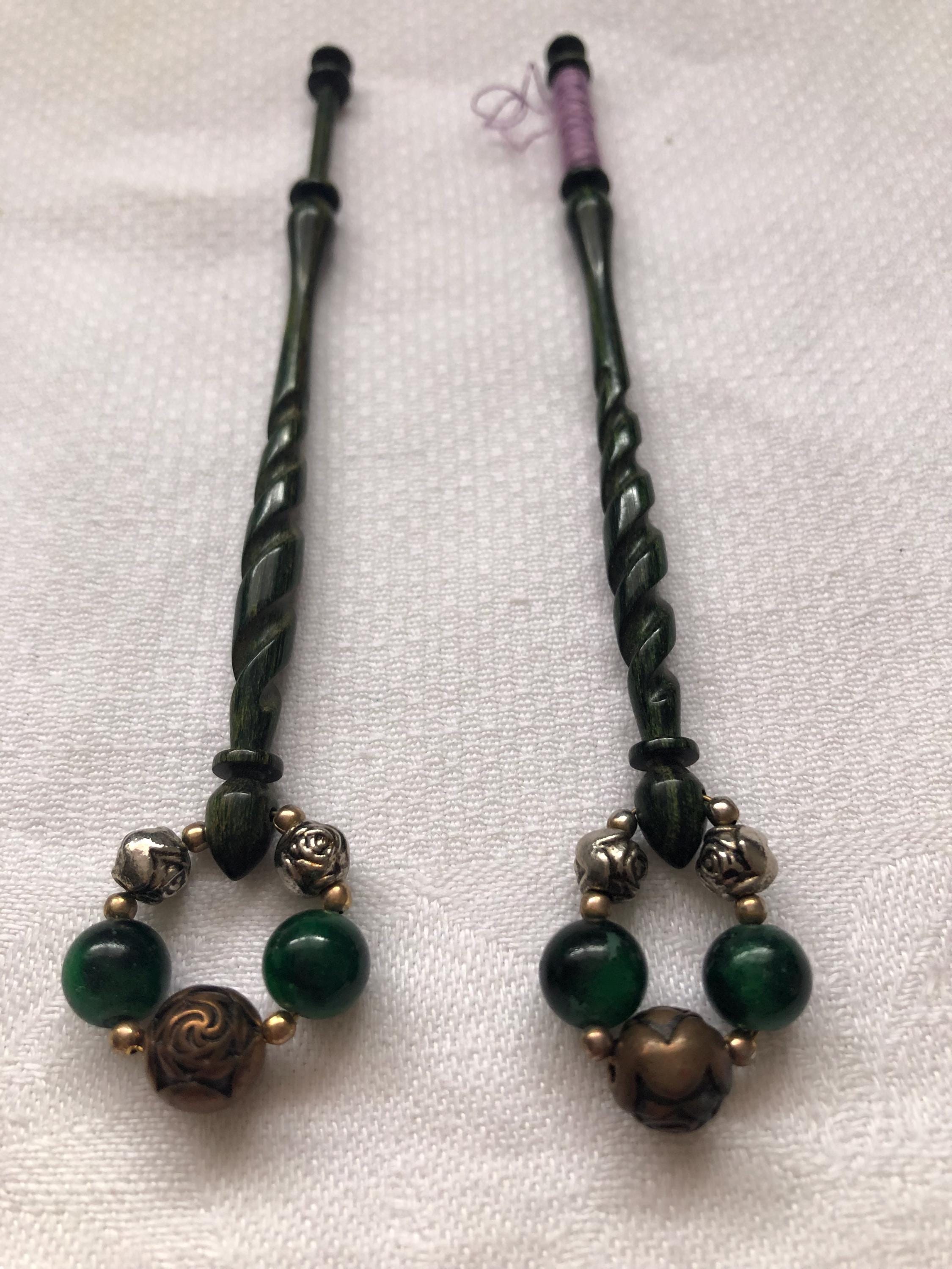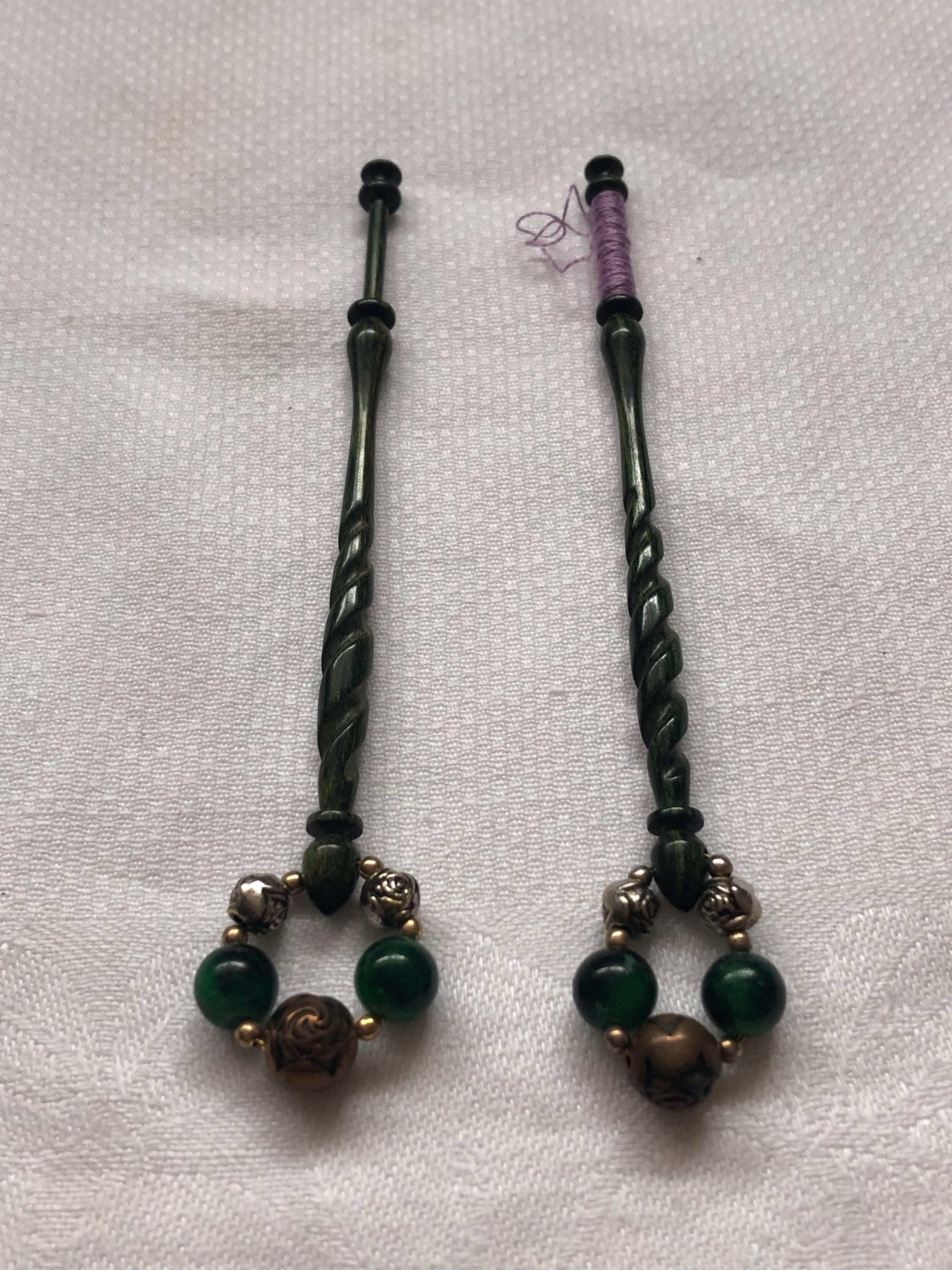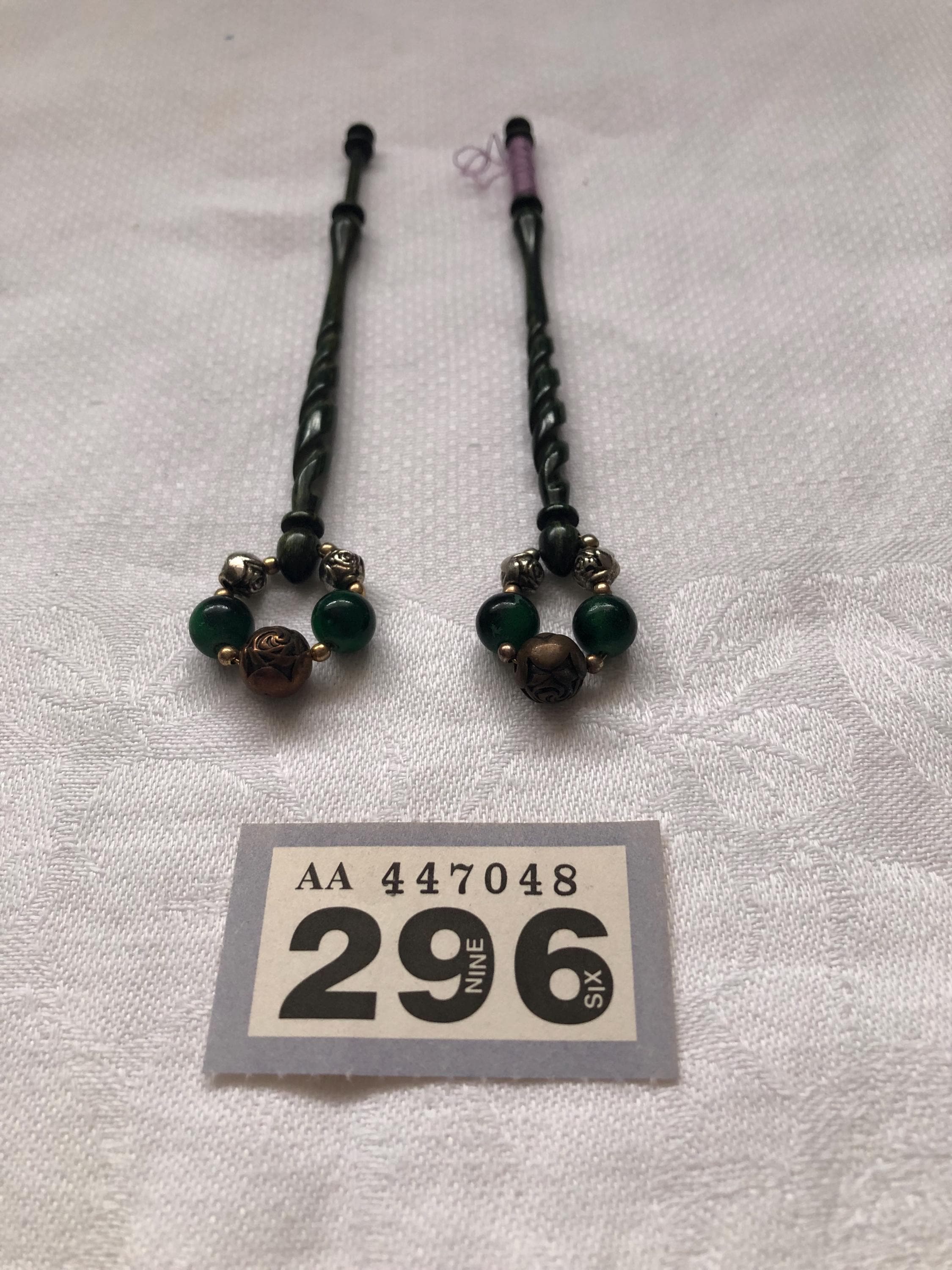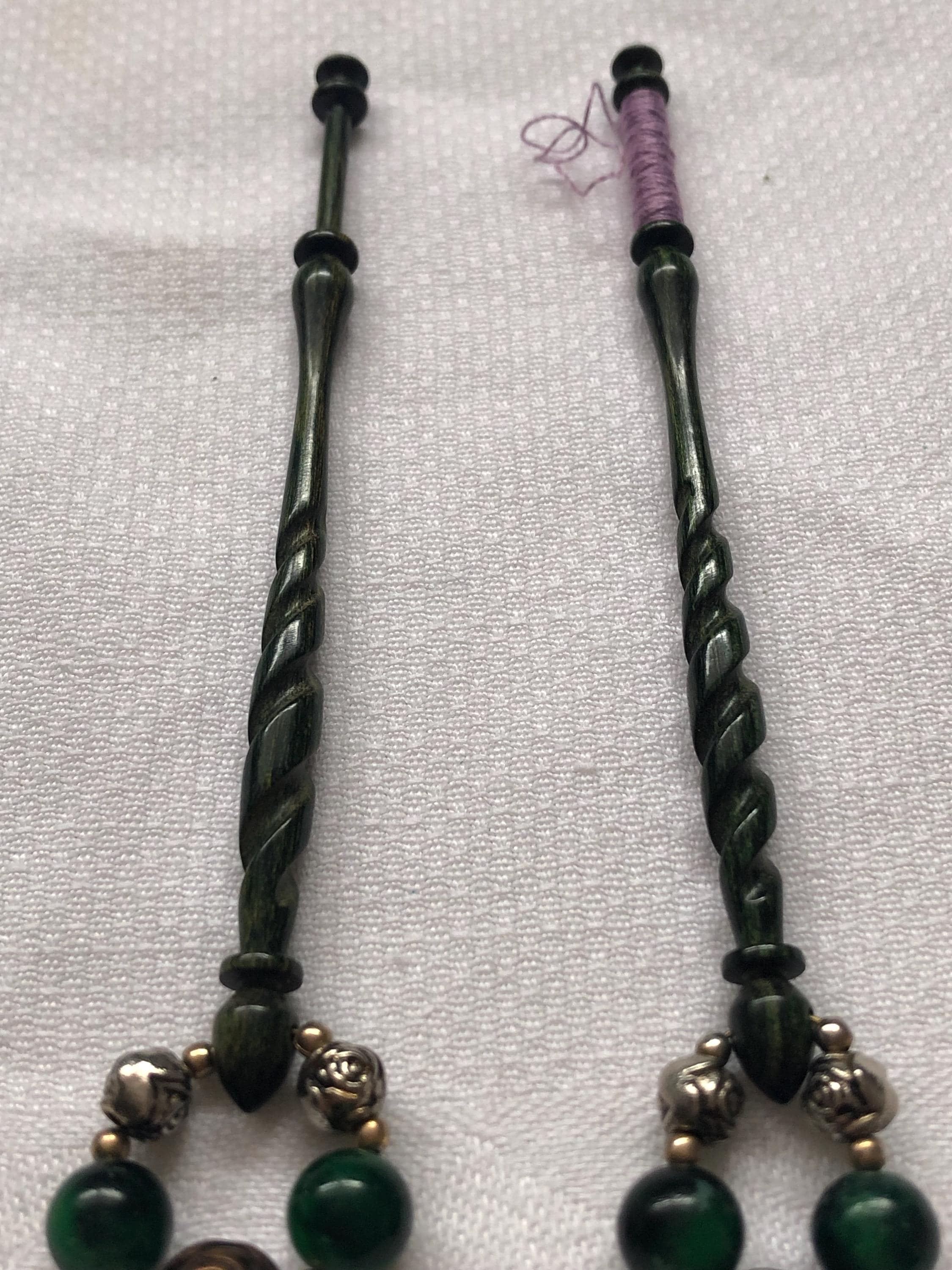 Here we have a pair of green engraved lacemaking bobbins. I am not sure what they are made of, possibly a marble effect resin?