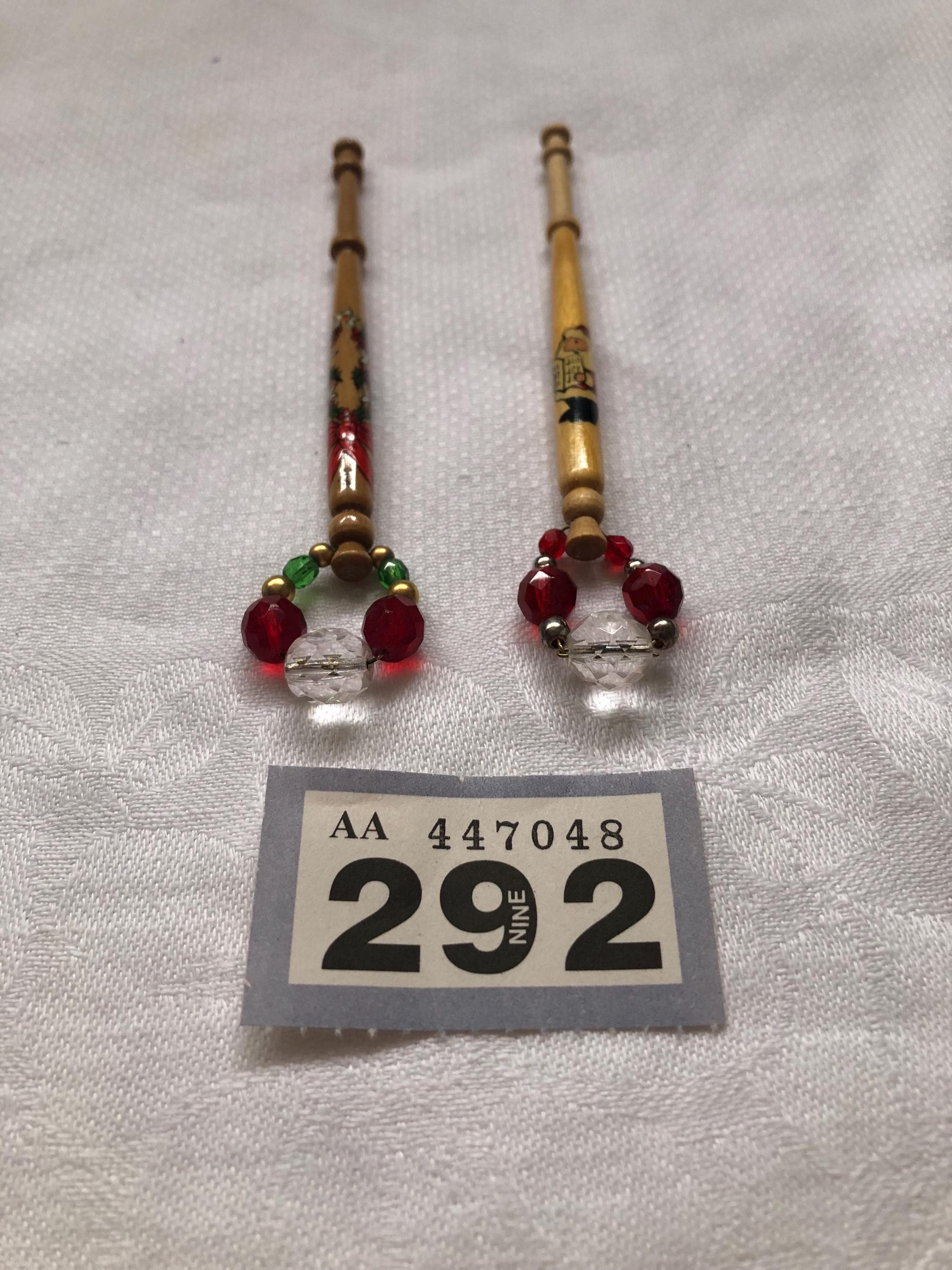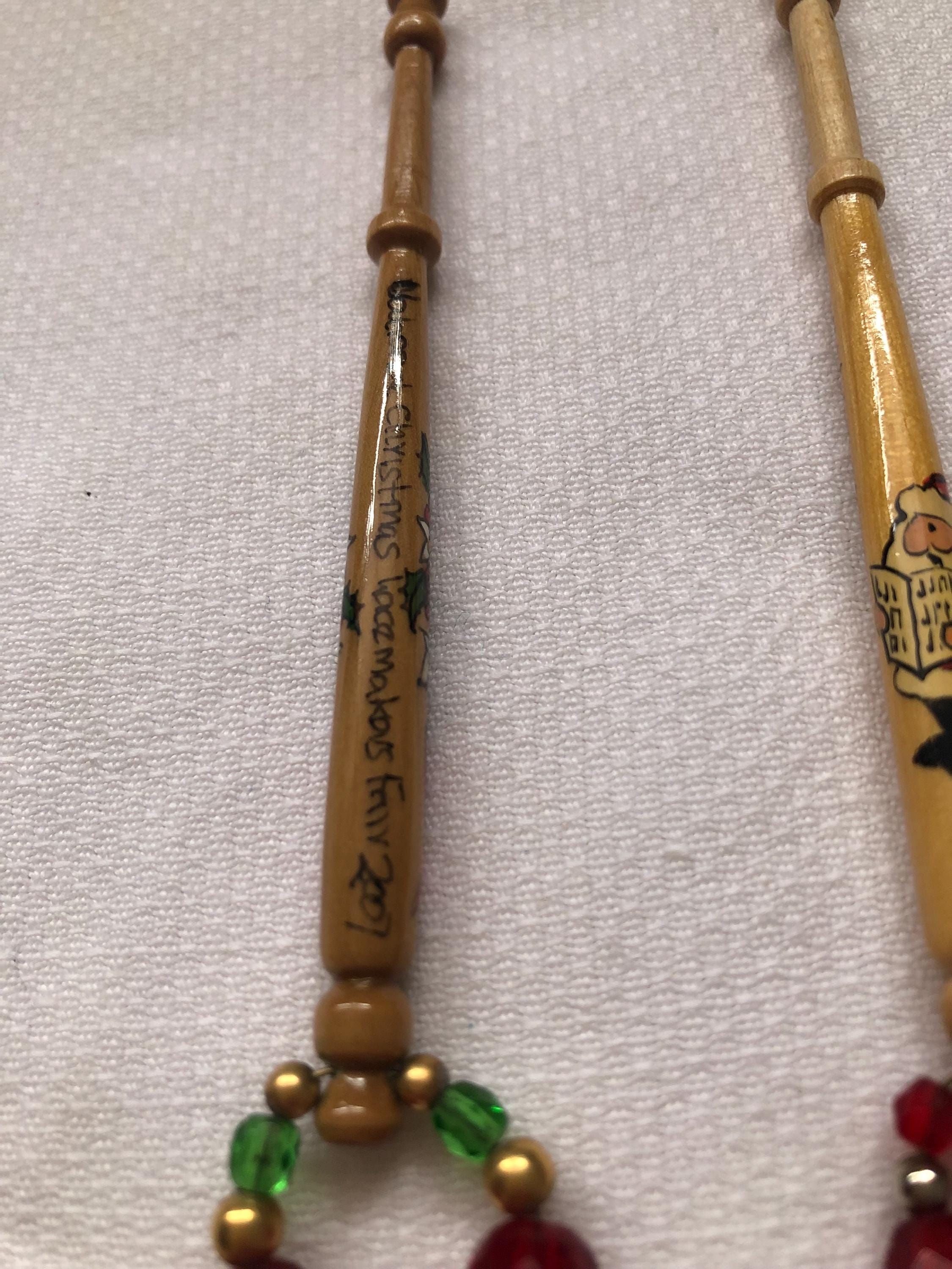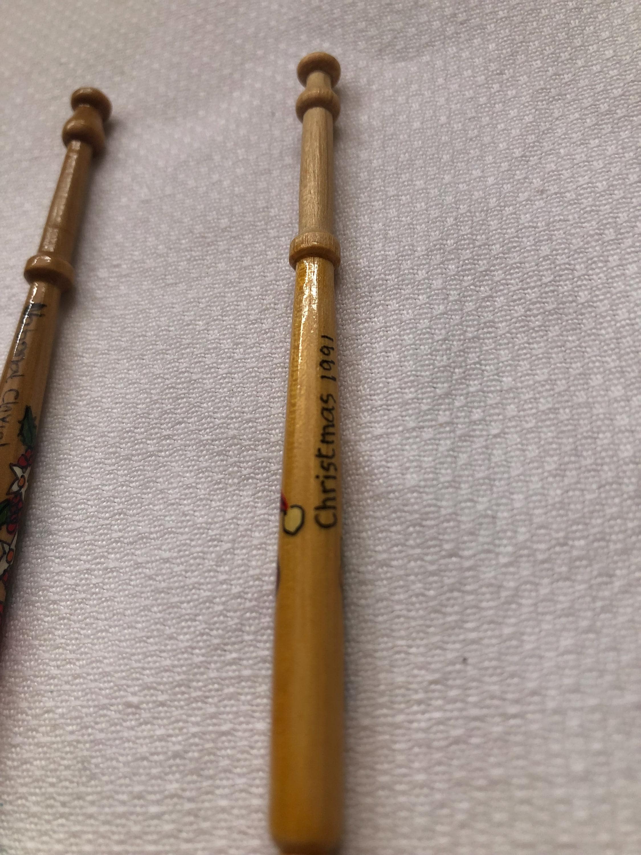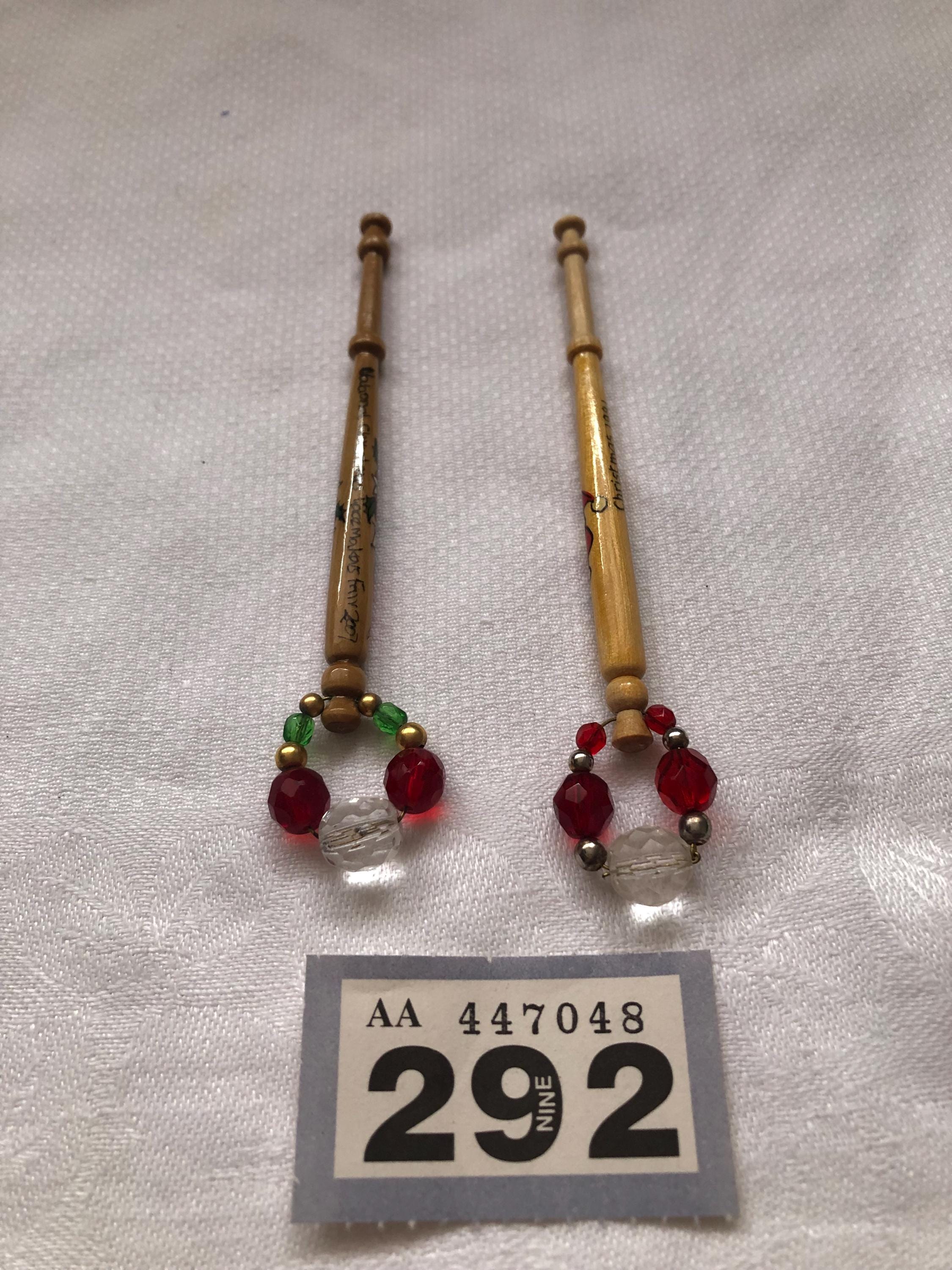 Here we have a pair of decorated wooden lacemaking bobbins.