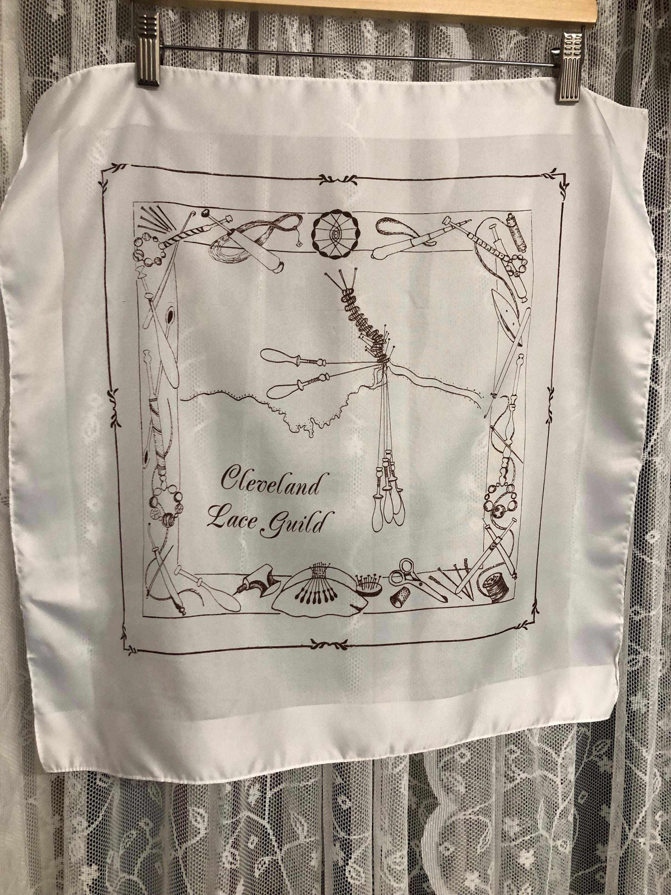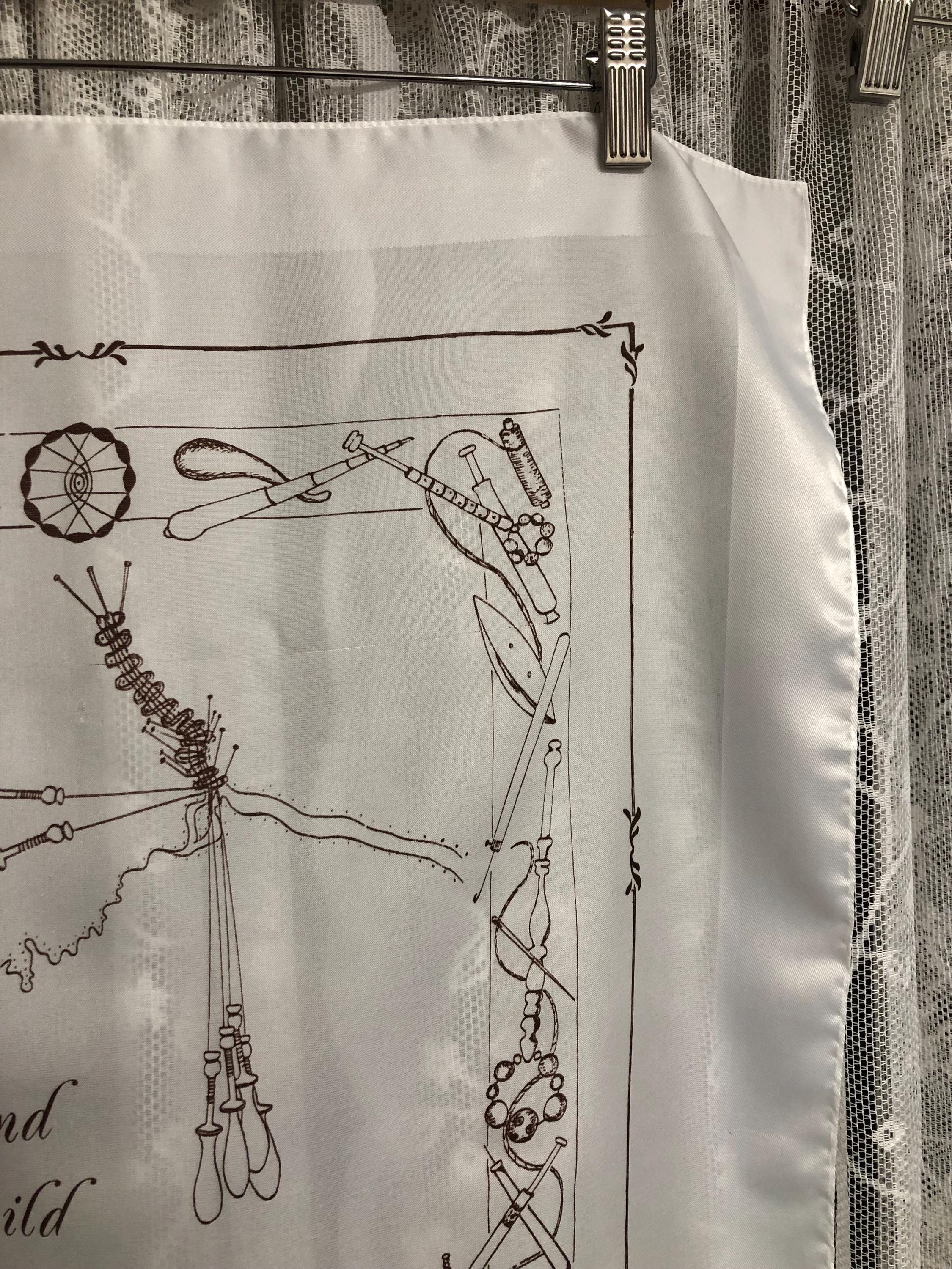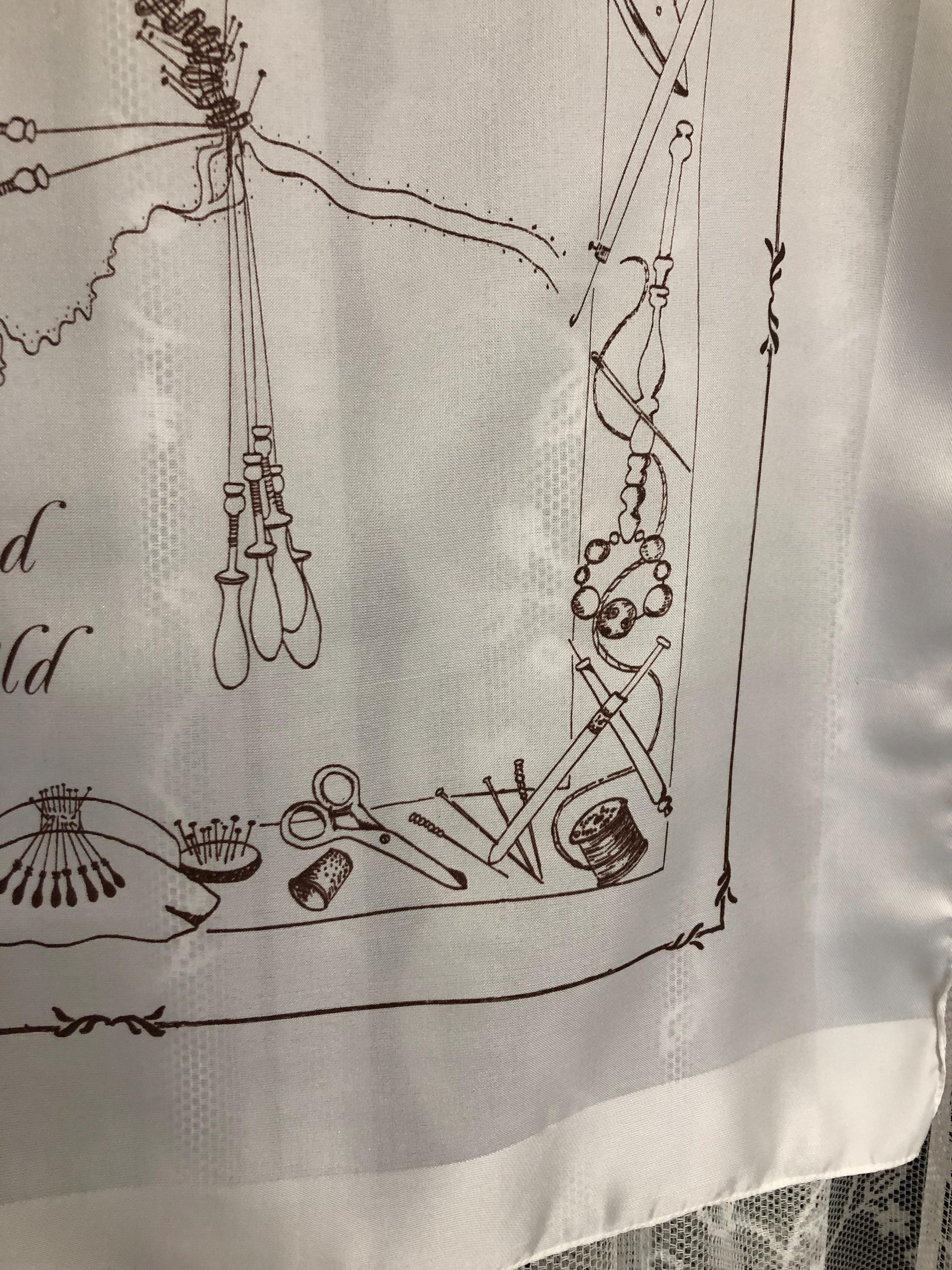 Here we have a vintage polyester ladies scarf in white with brown pictures of lace makers equipment on.