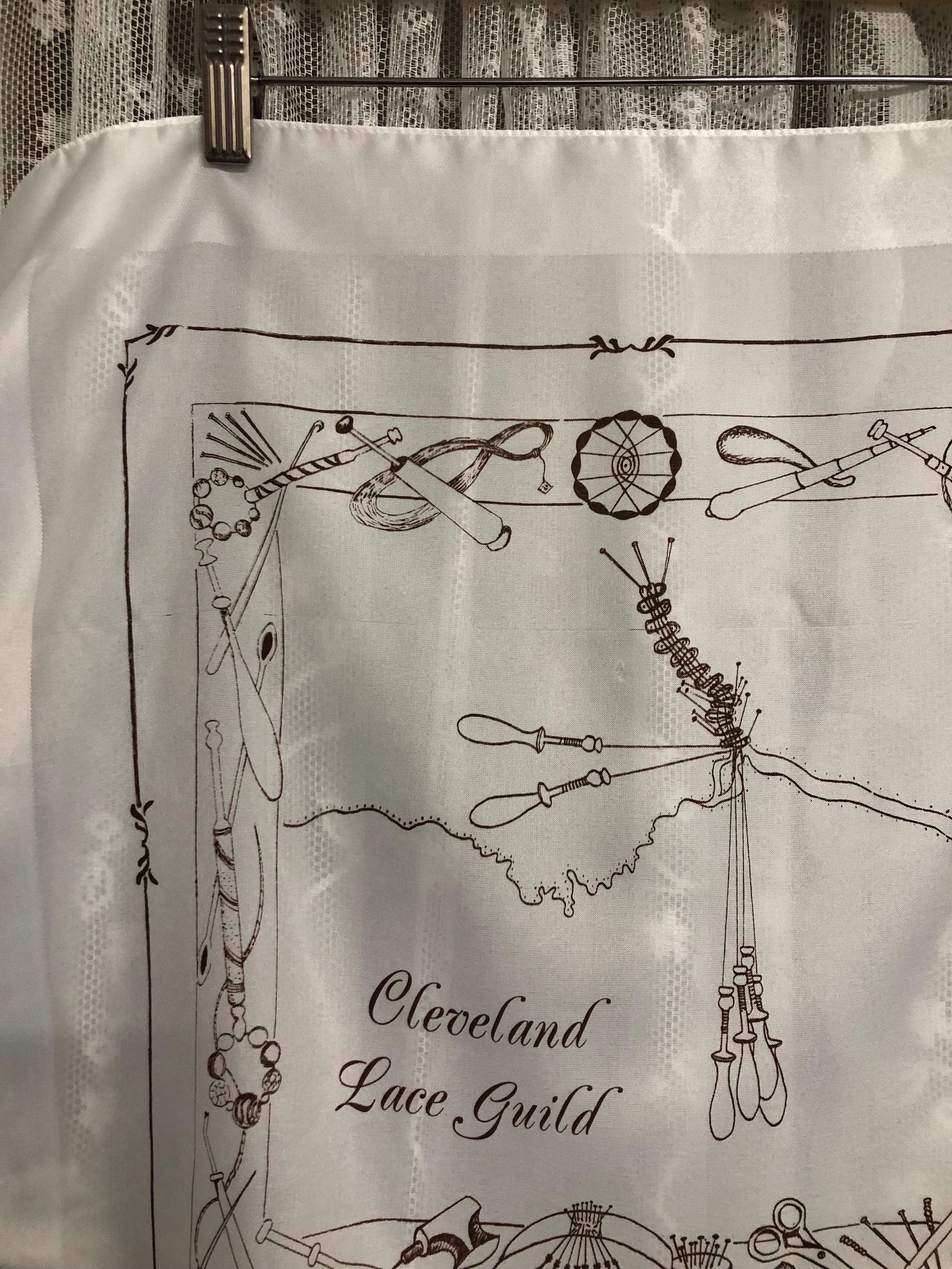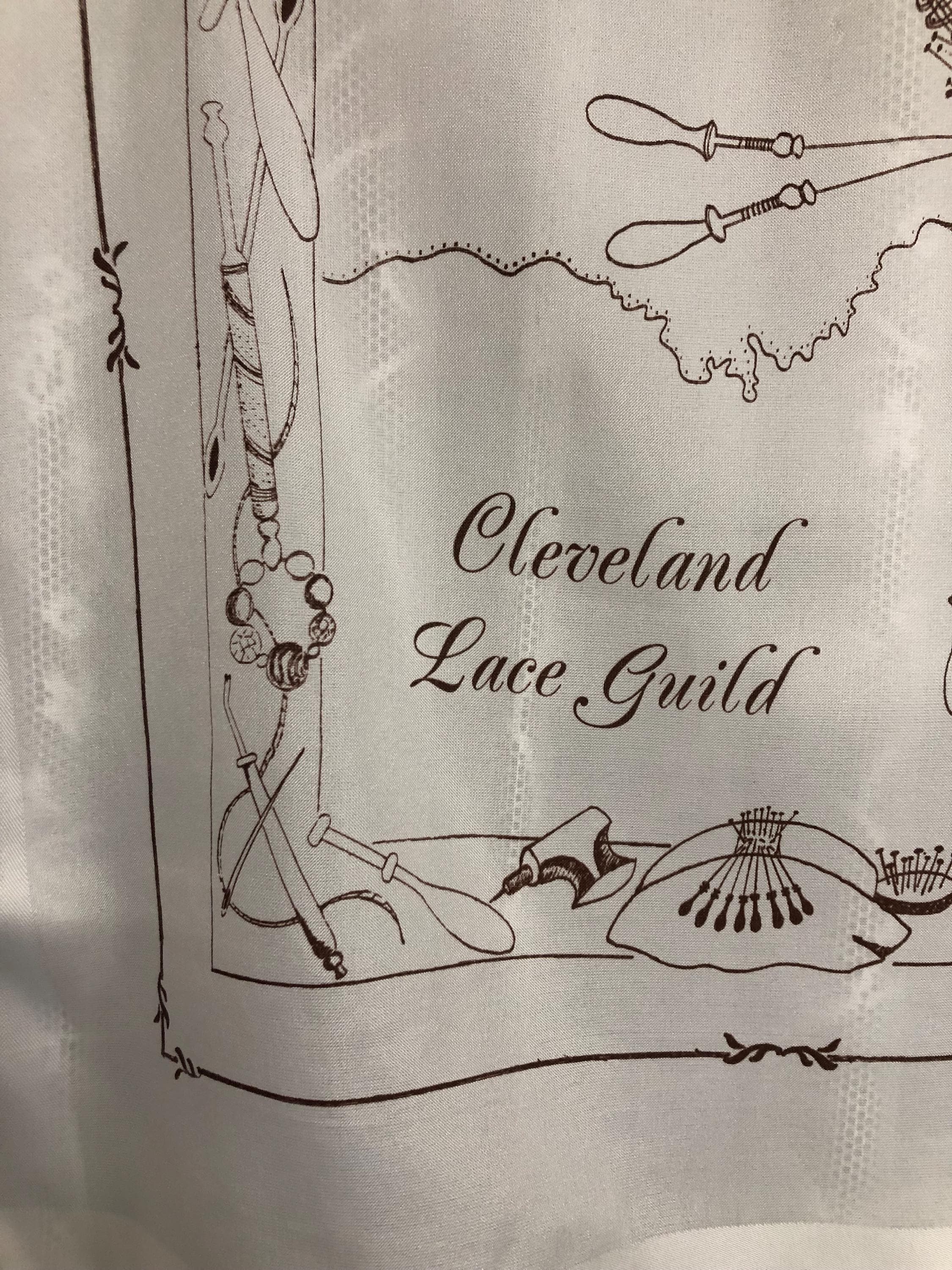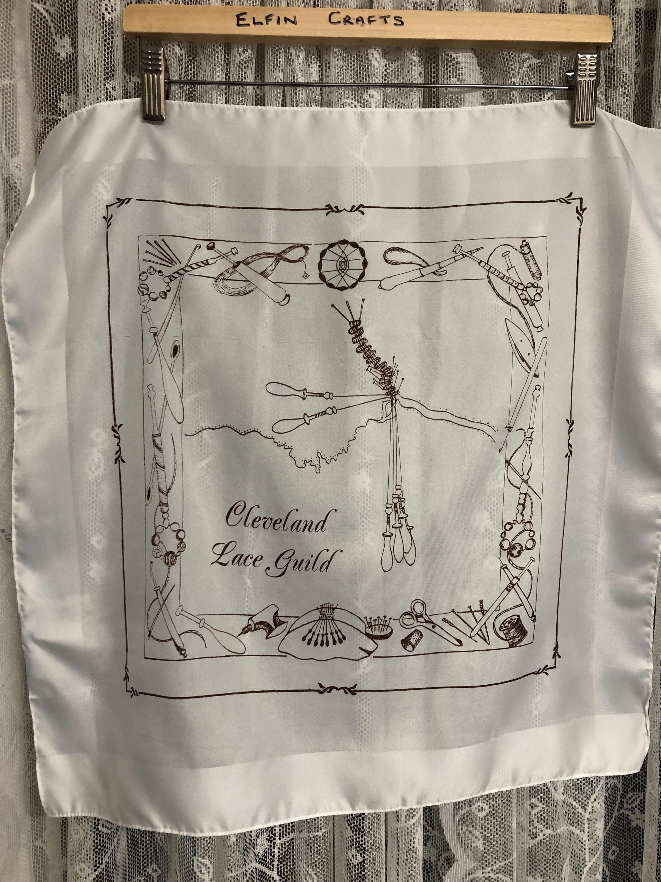 Here we have a vintage polyester ladies scarf in white with brown pictures of lace makers equipment on.