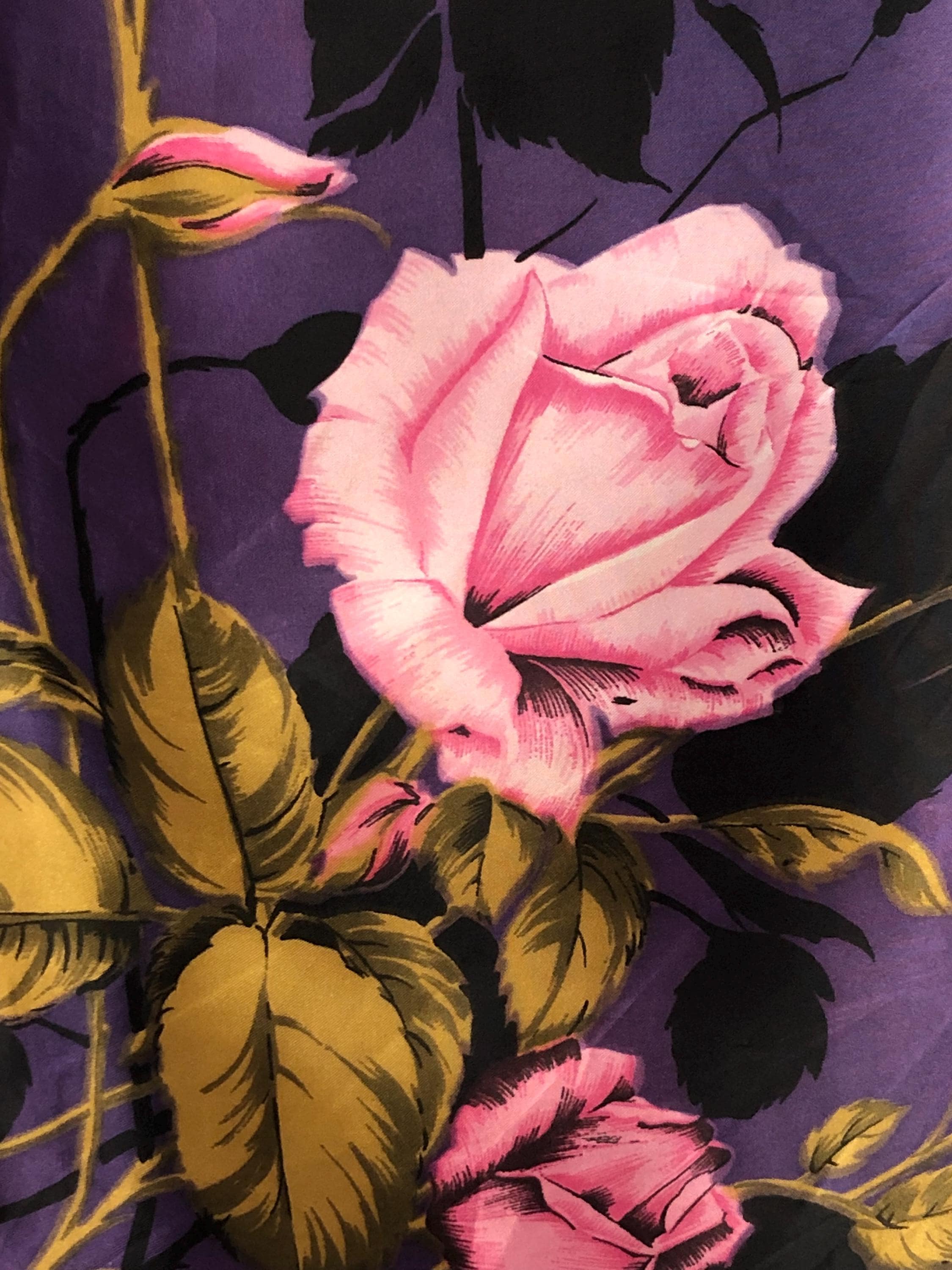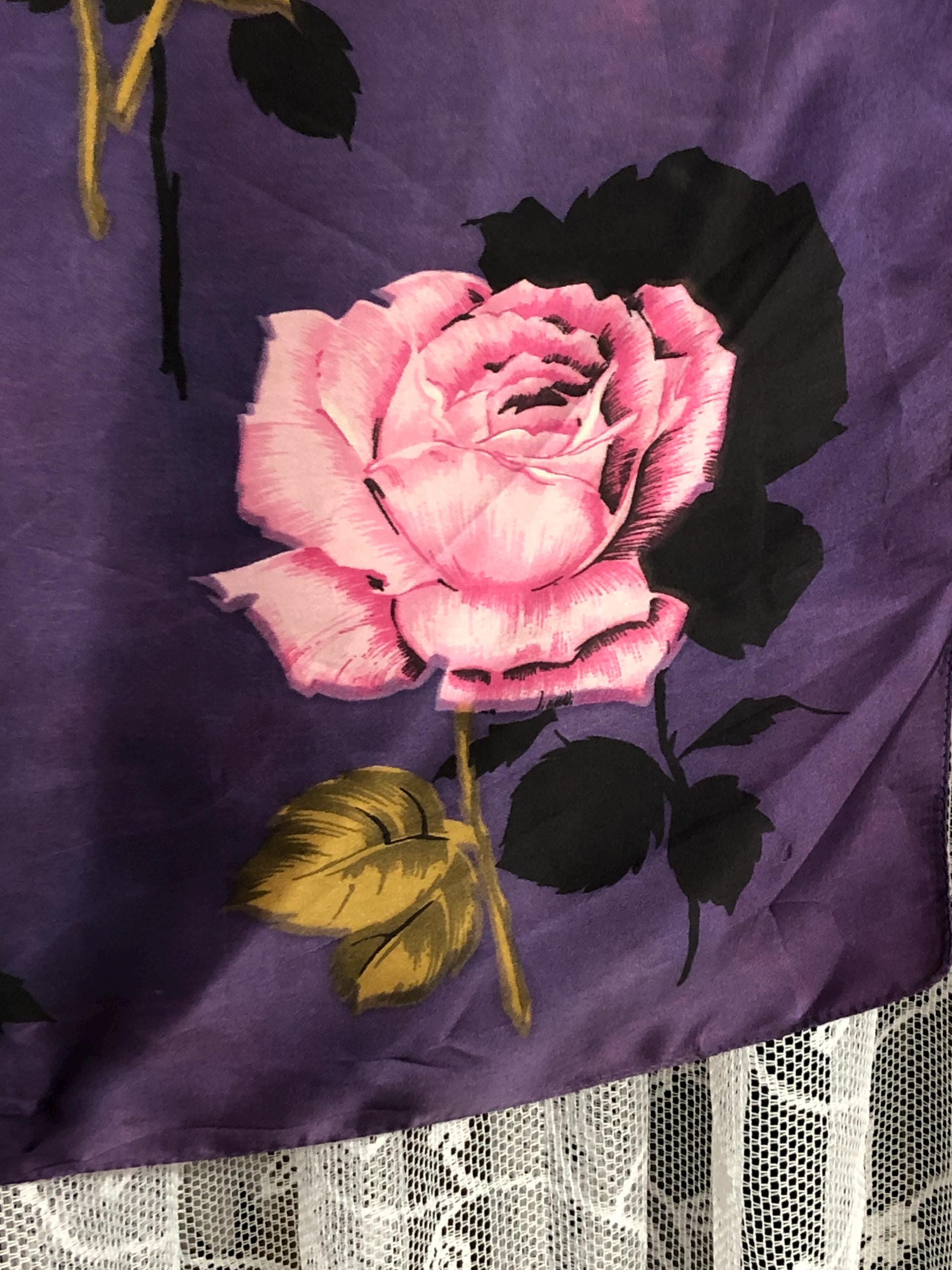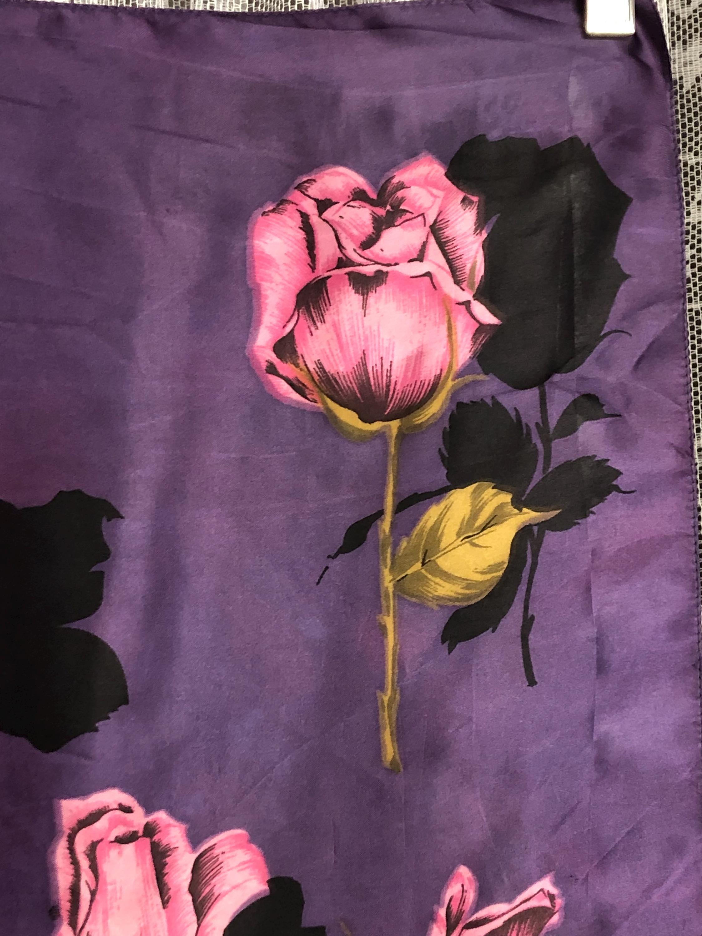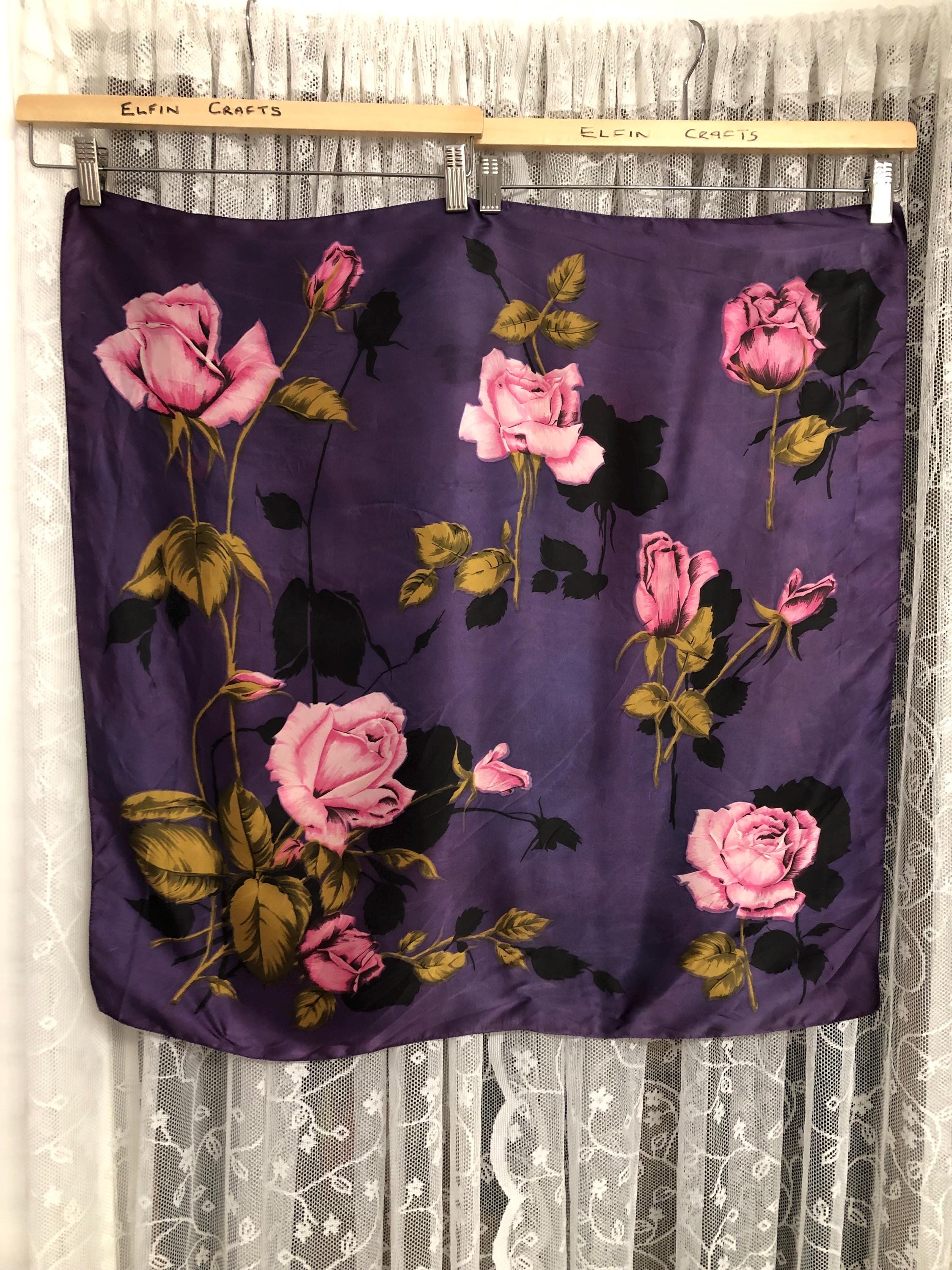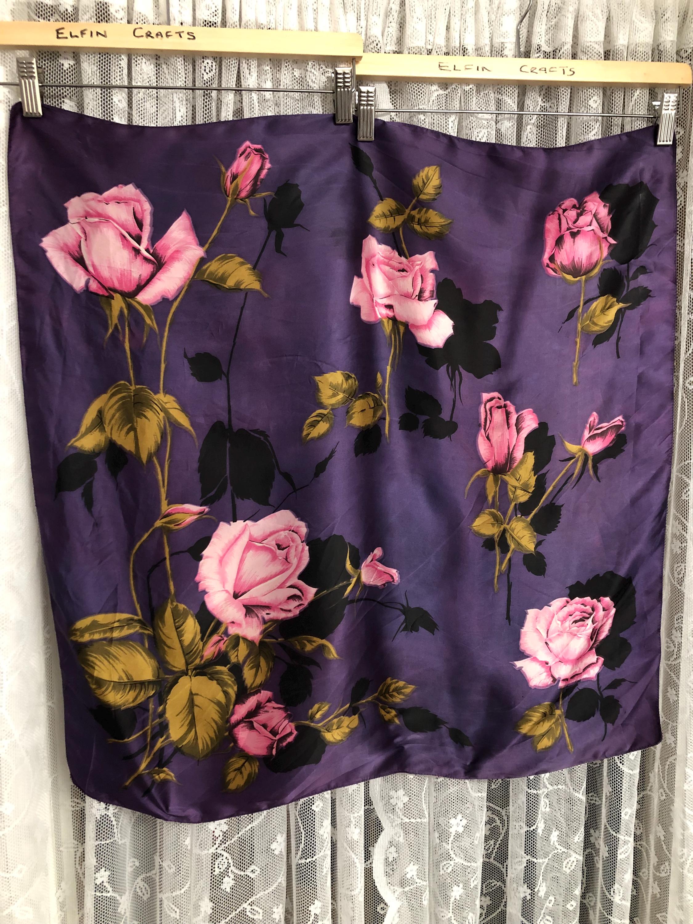 Here we have a vintage satin or rayon ladies scarf in deep purple with pink roses.