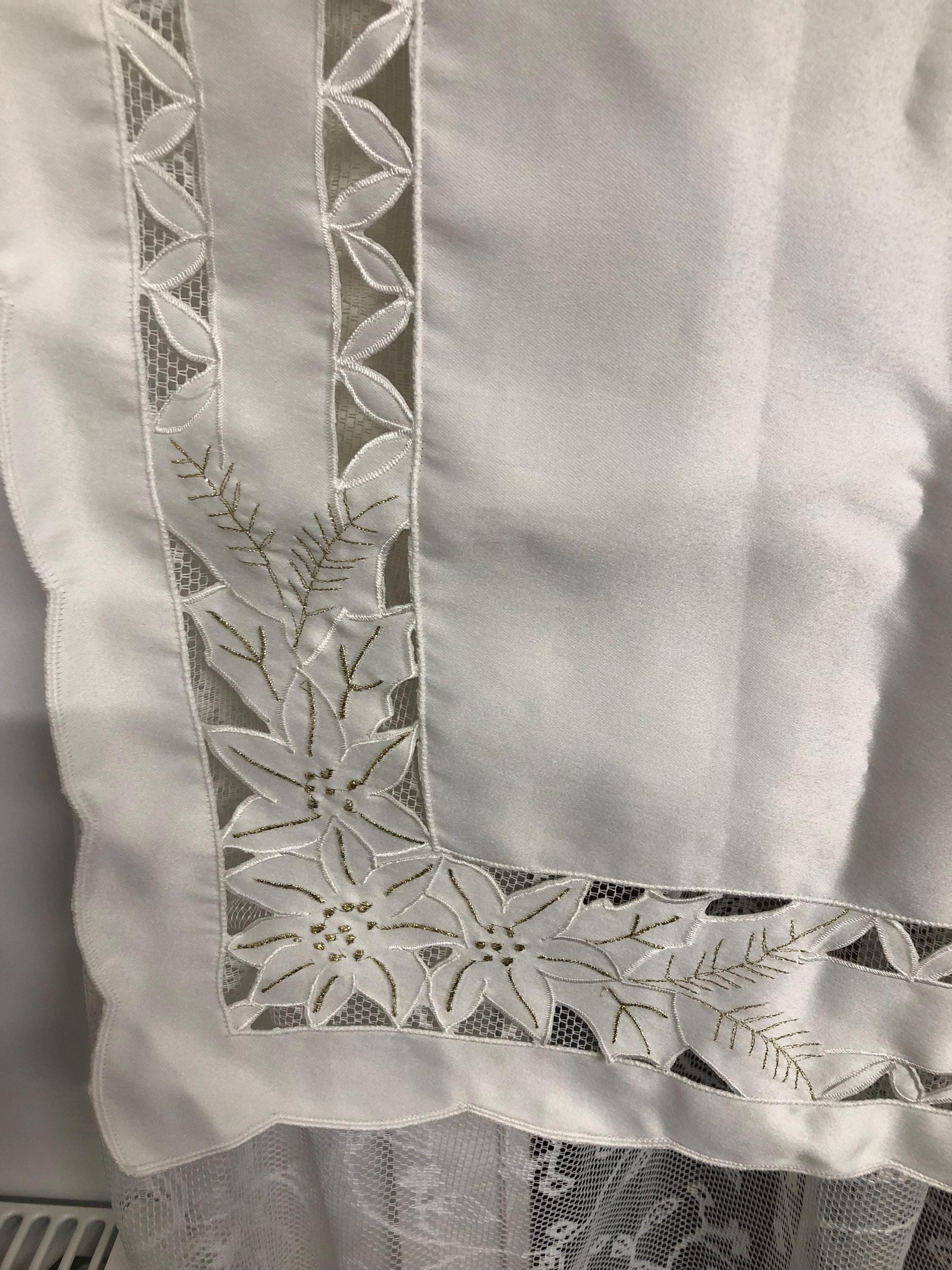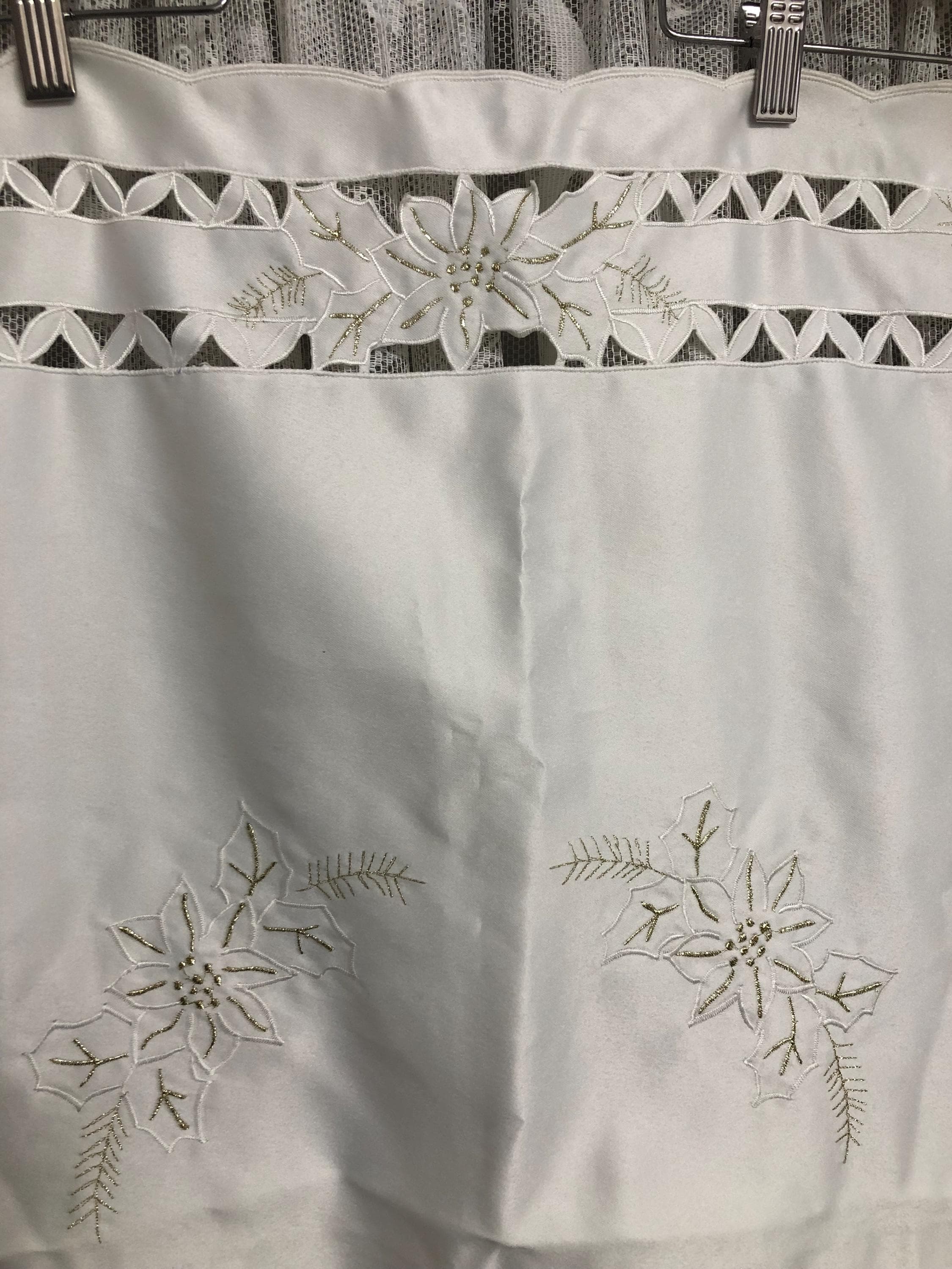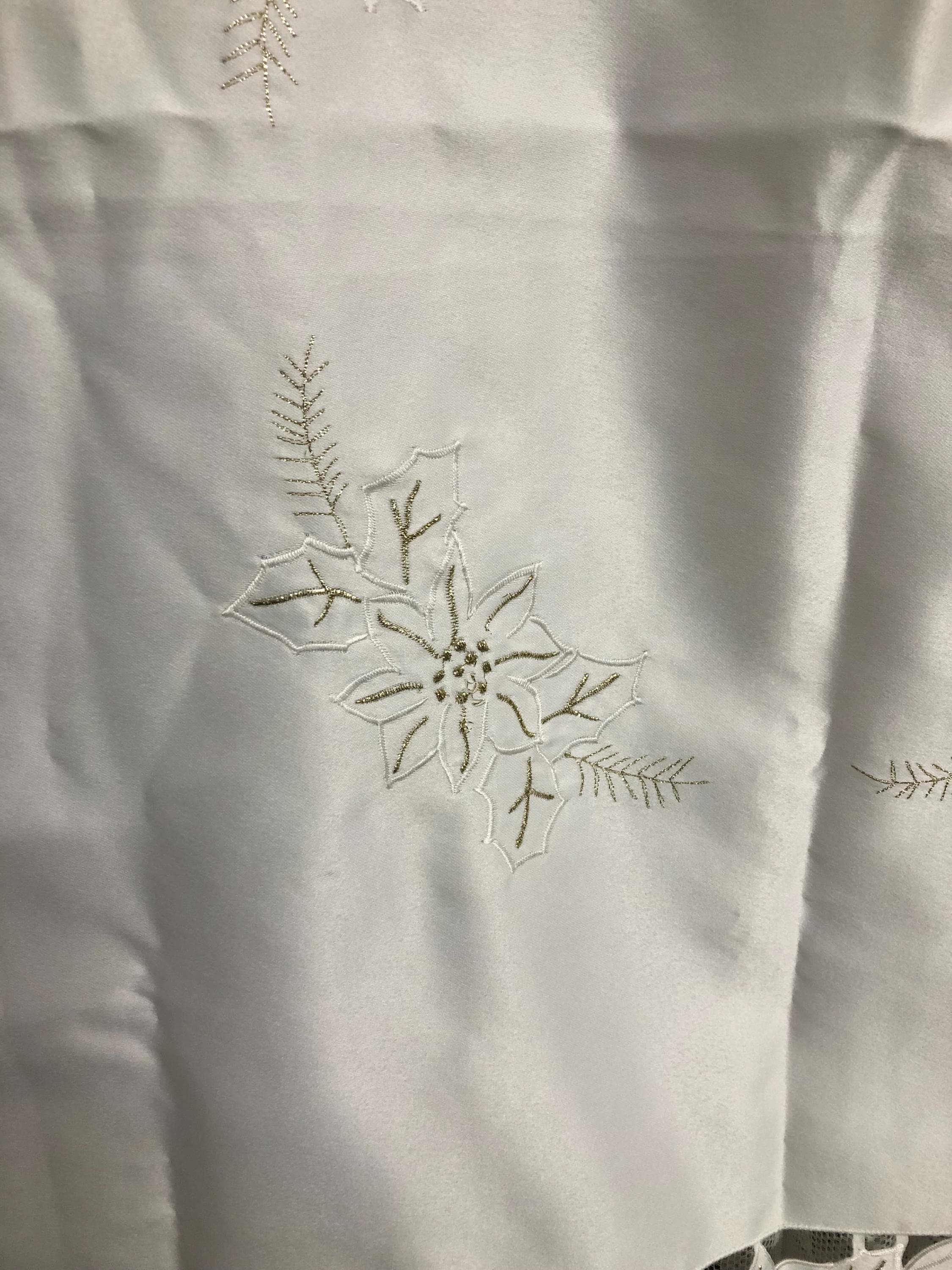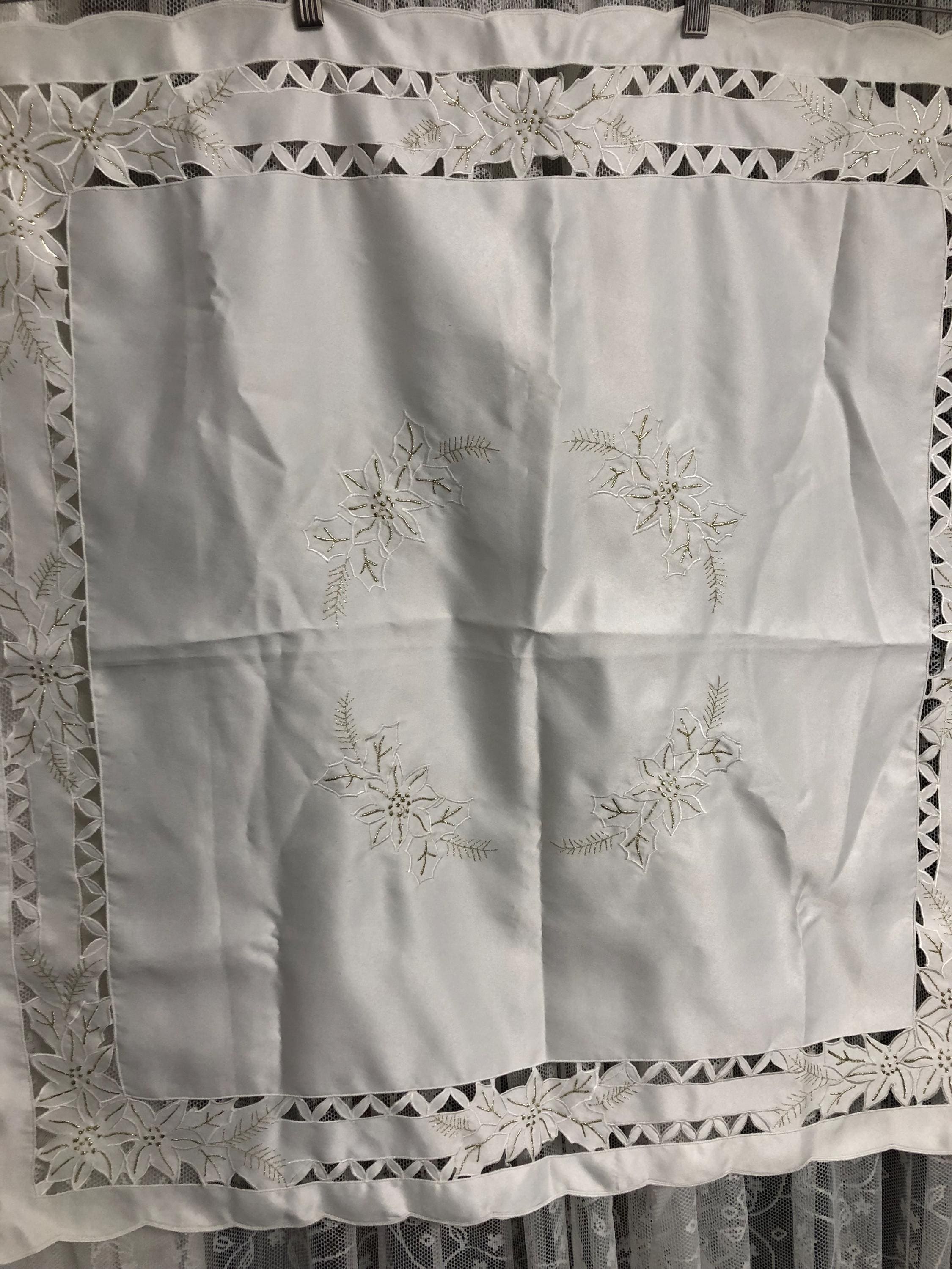 Here is a small satin polyester vintage tablecloth with Christmas roses.