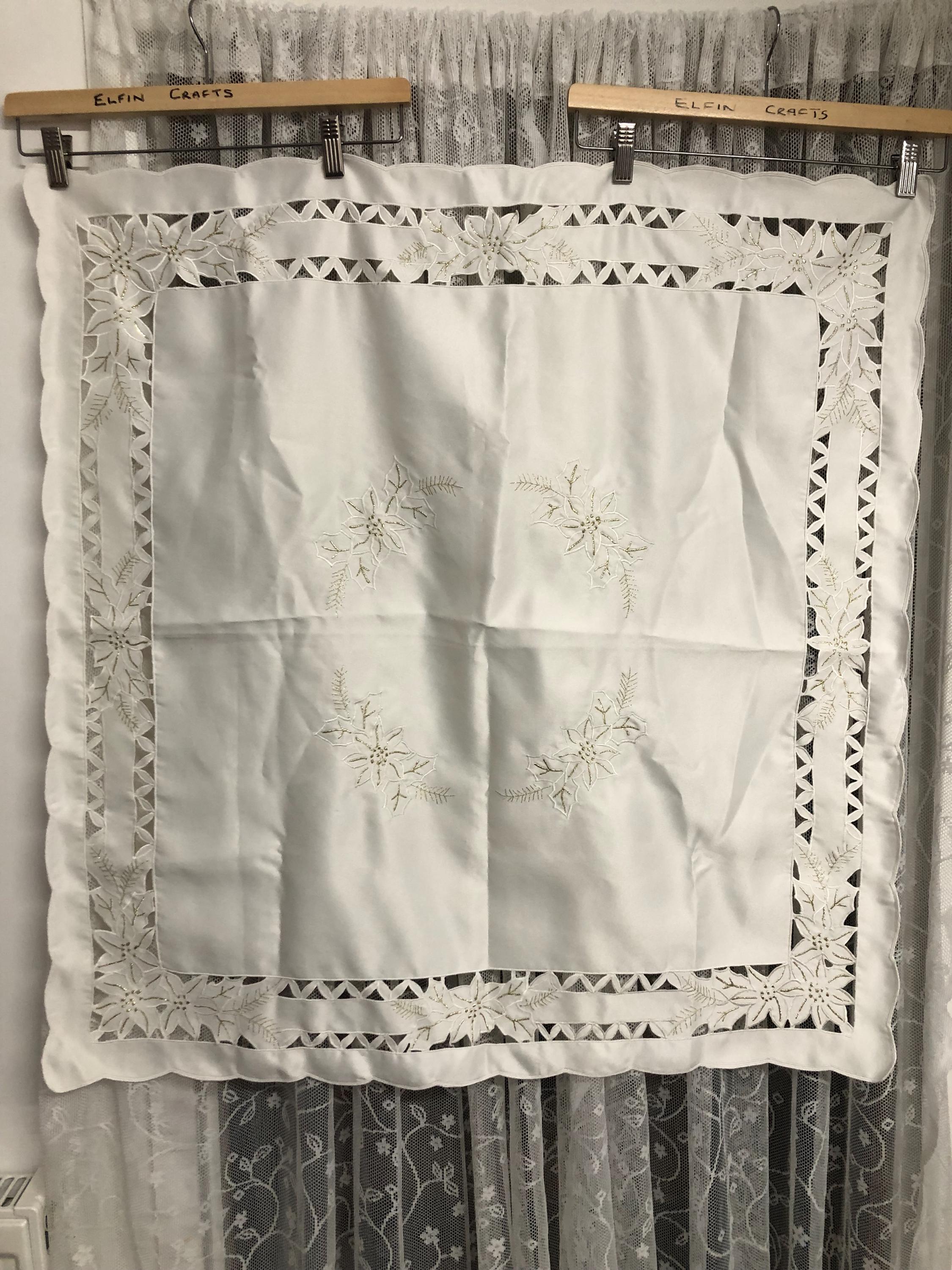 The tablecloth is in perfect condition, and measures 86cm by 84cm.