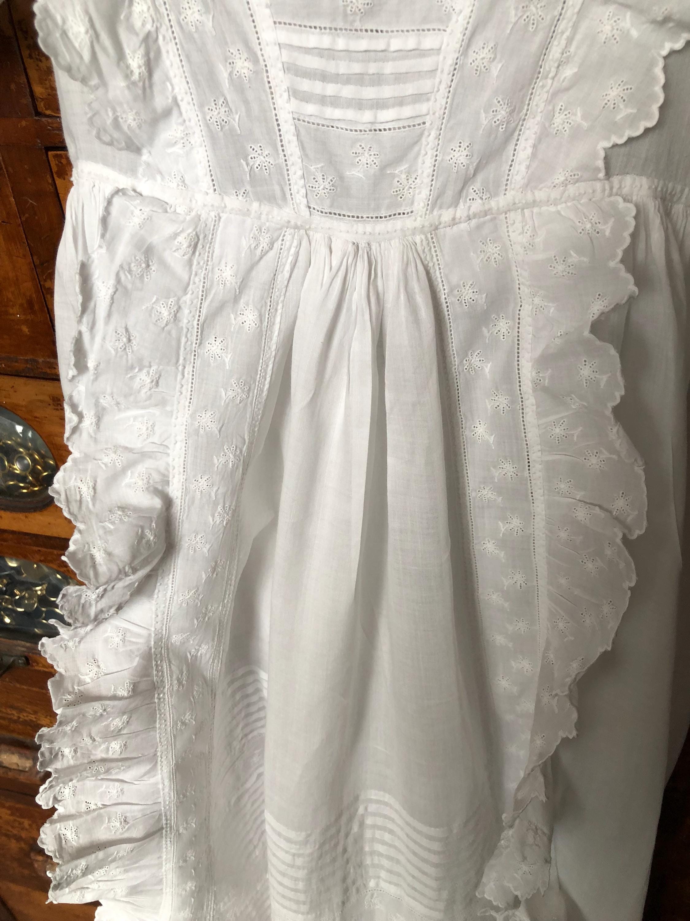 The front has a beautiful embroidery with pin tucks, and a long gathered skirt from the waist.