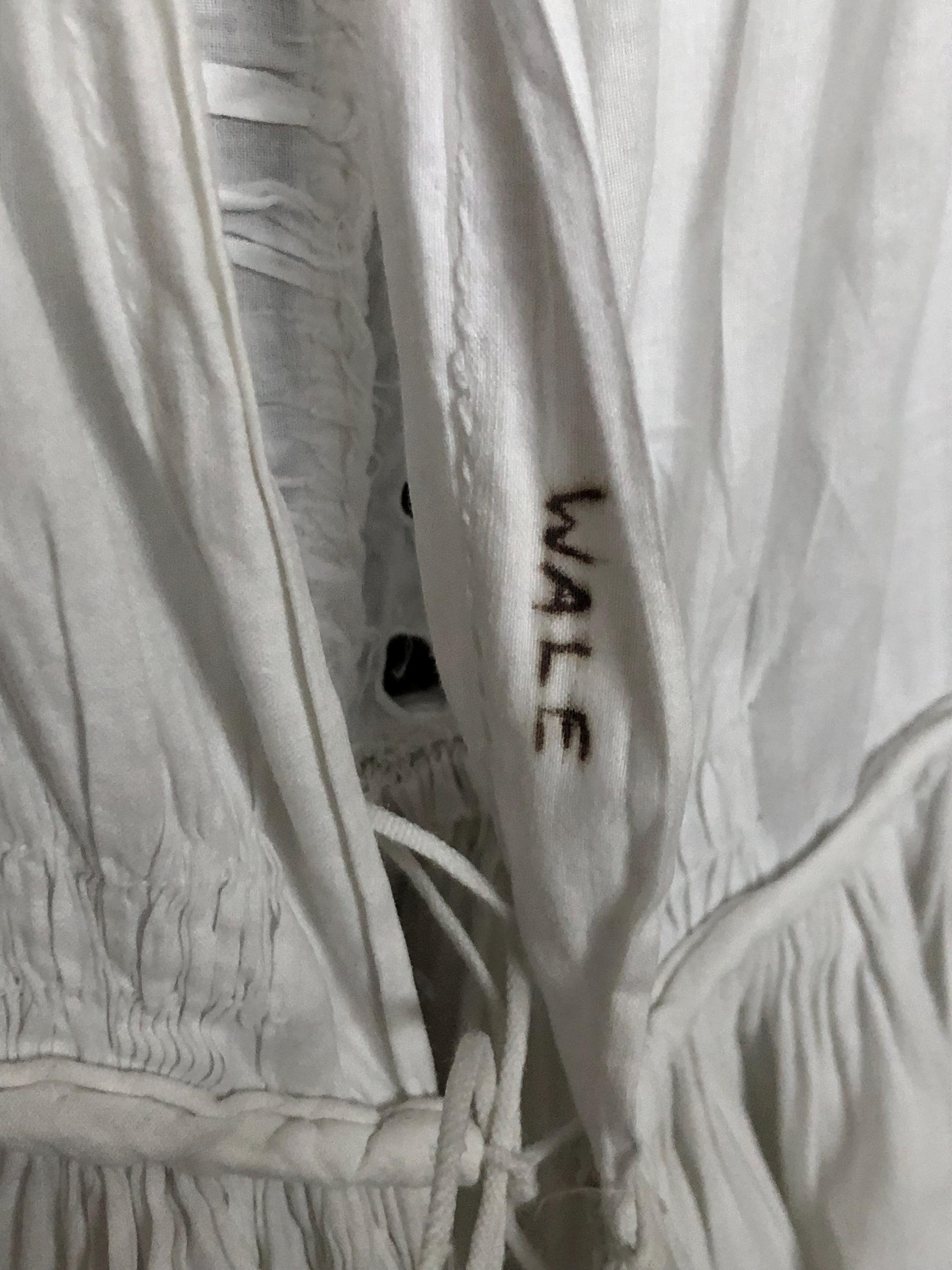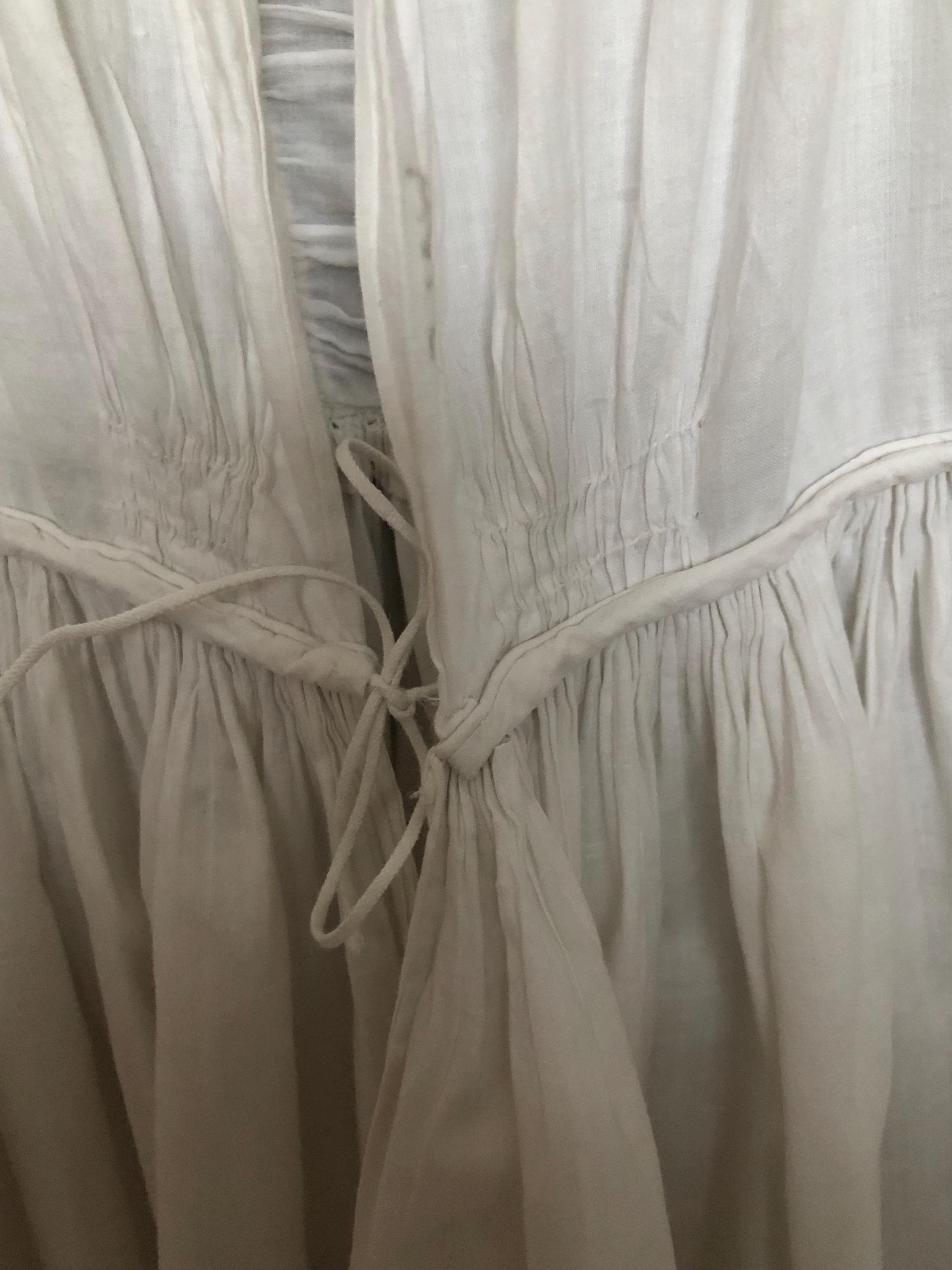 The neck and waist are tied with a small ribbon/cord. The waist has tiny pleats which are hand sewn.