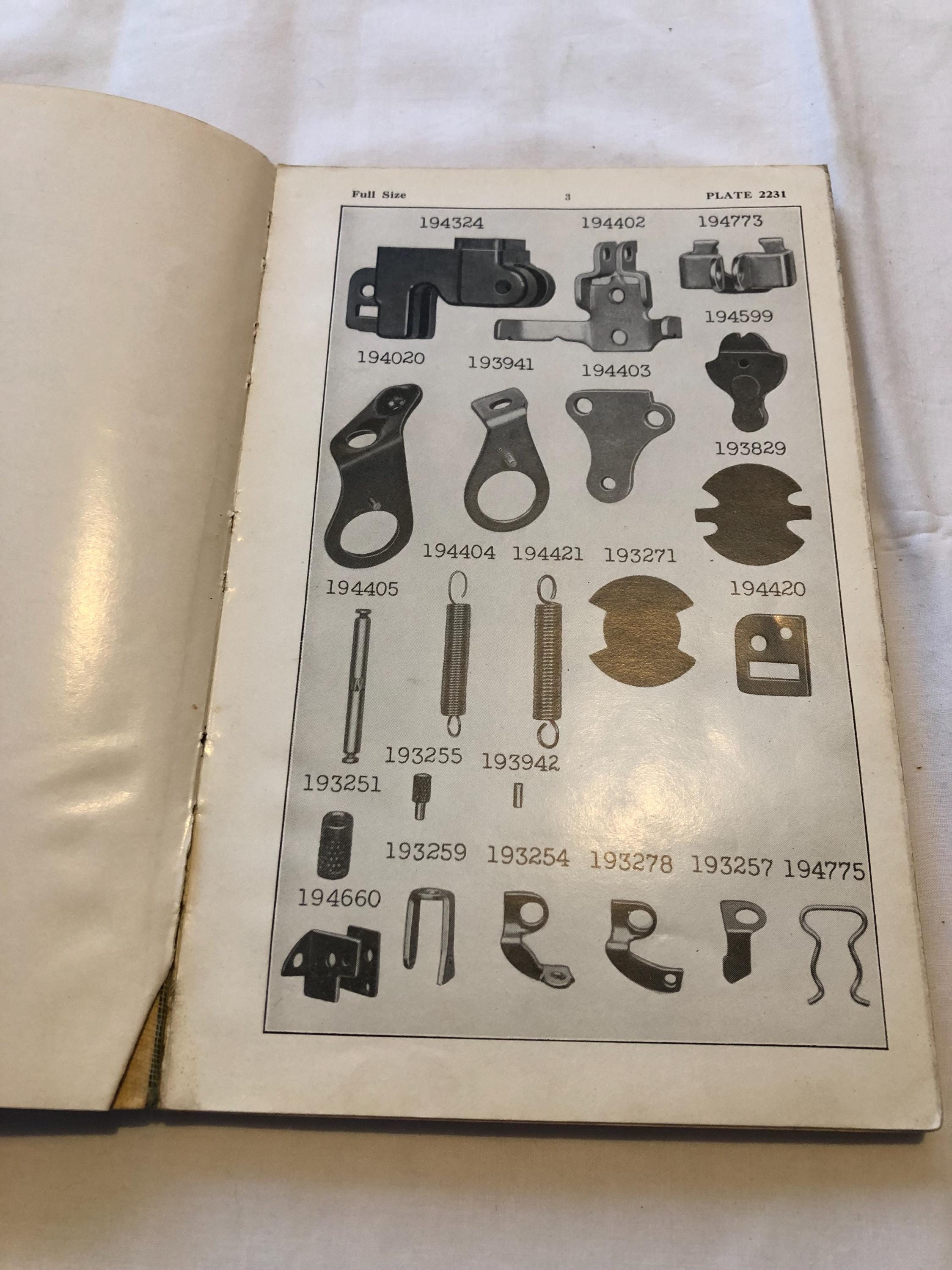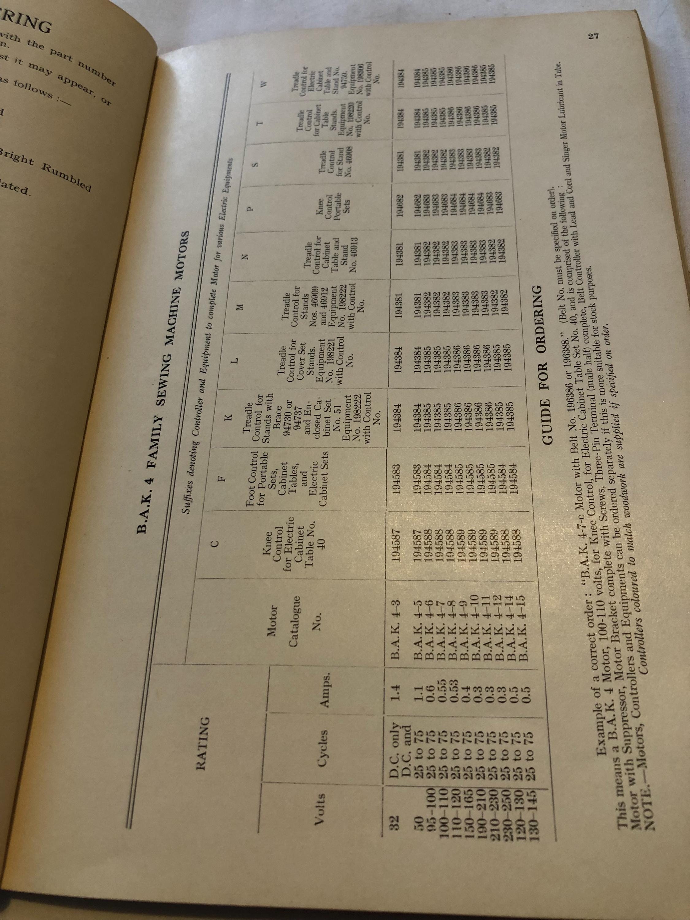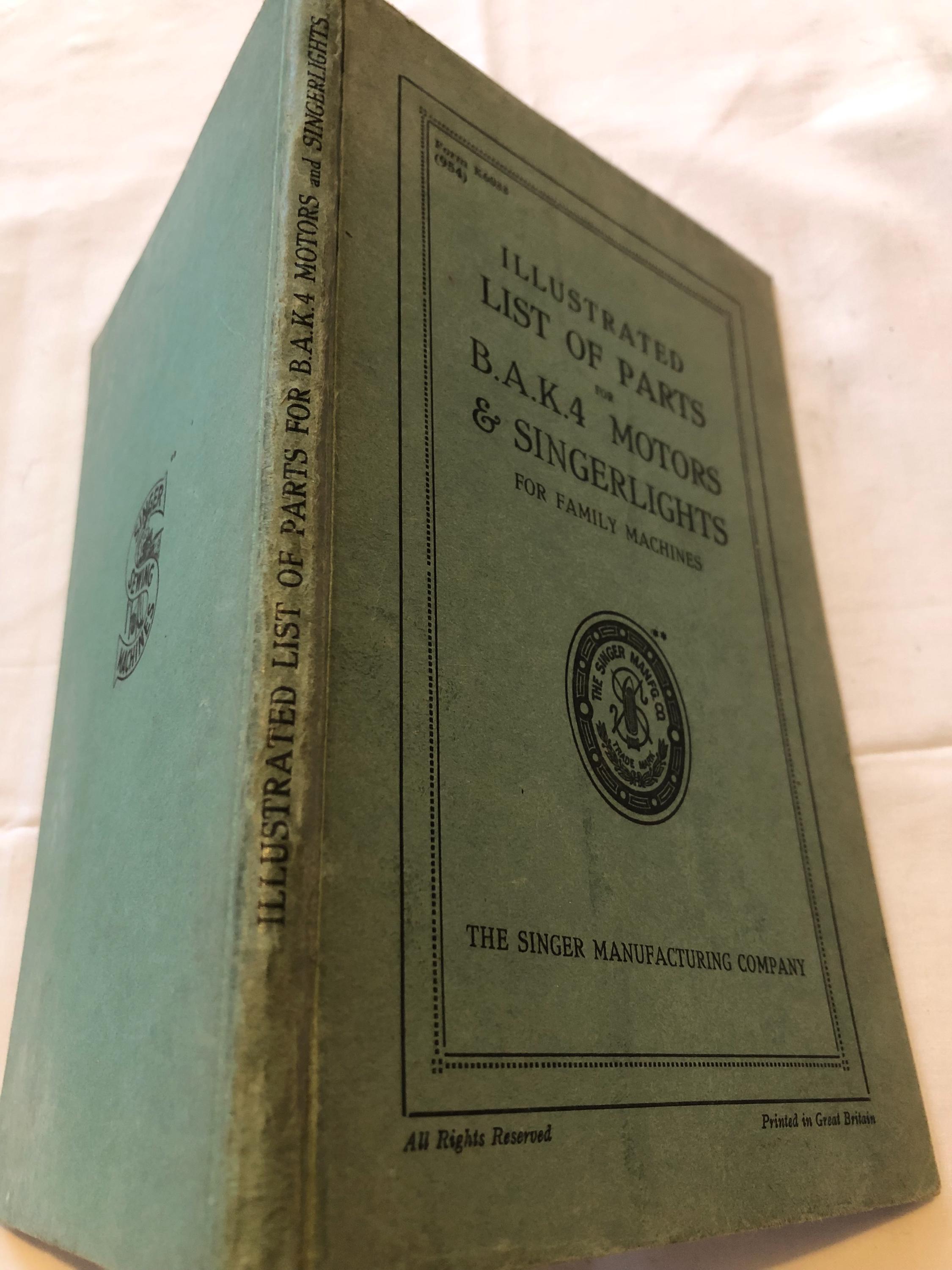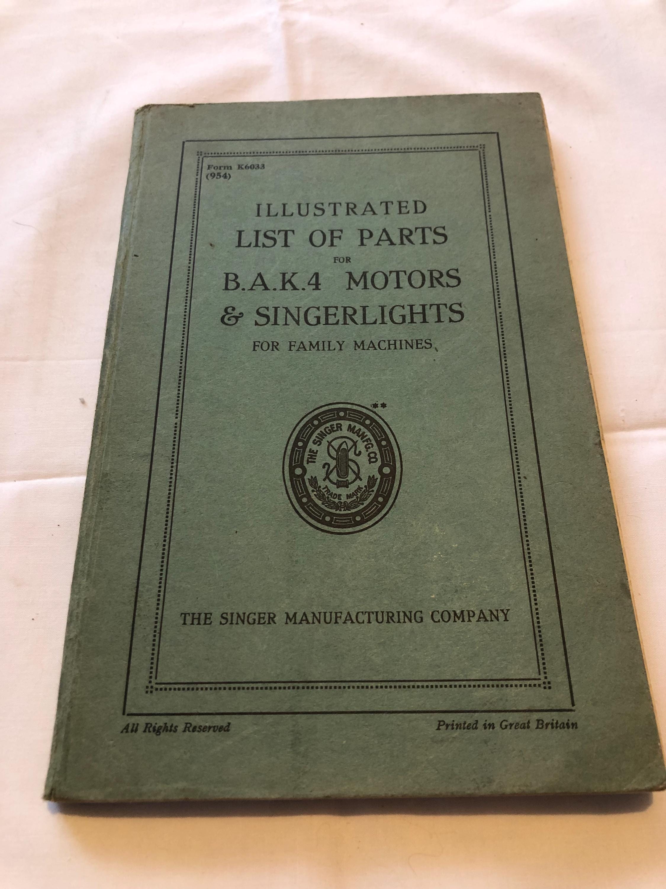 This is a rare opportunity to own an original Singer book "Illustrated list of parts for B.A.K.4 Motors and Singer lights for family machines".