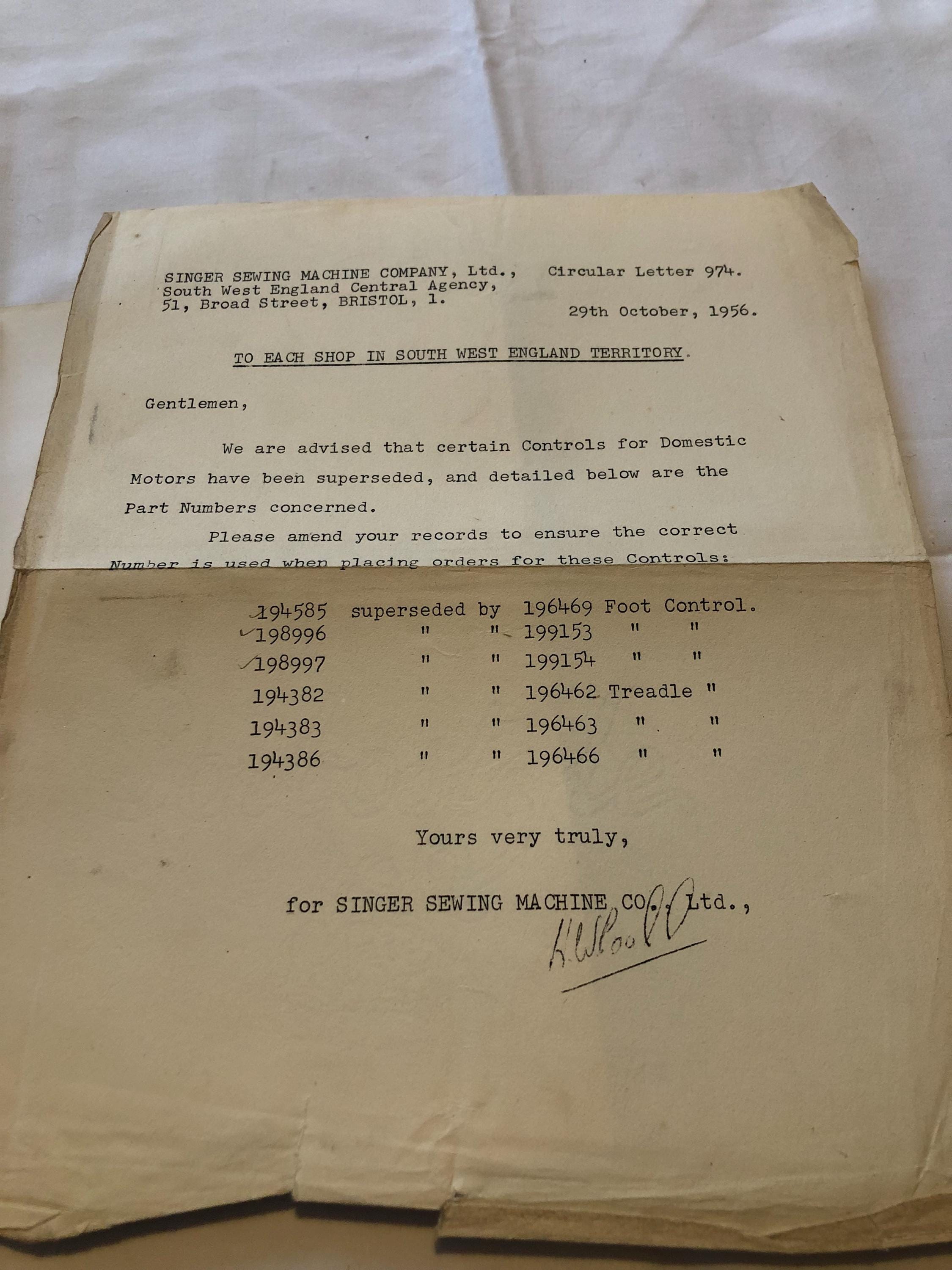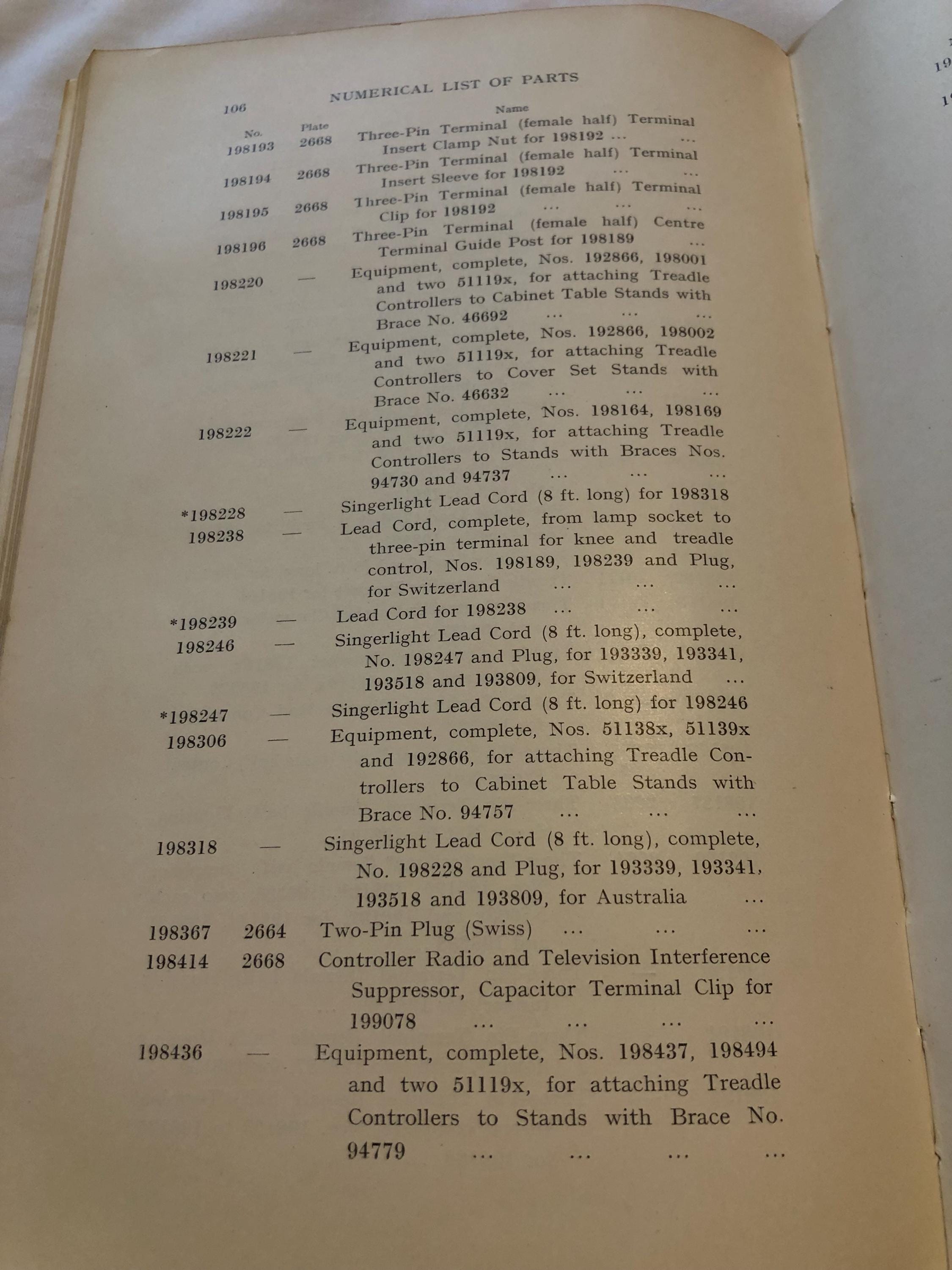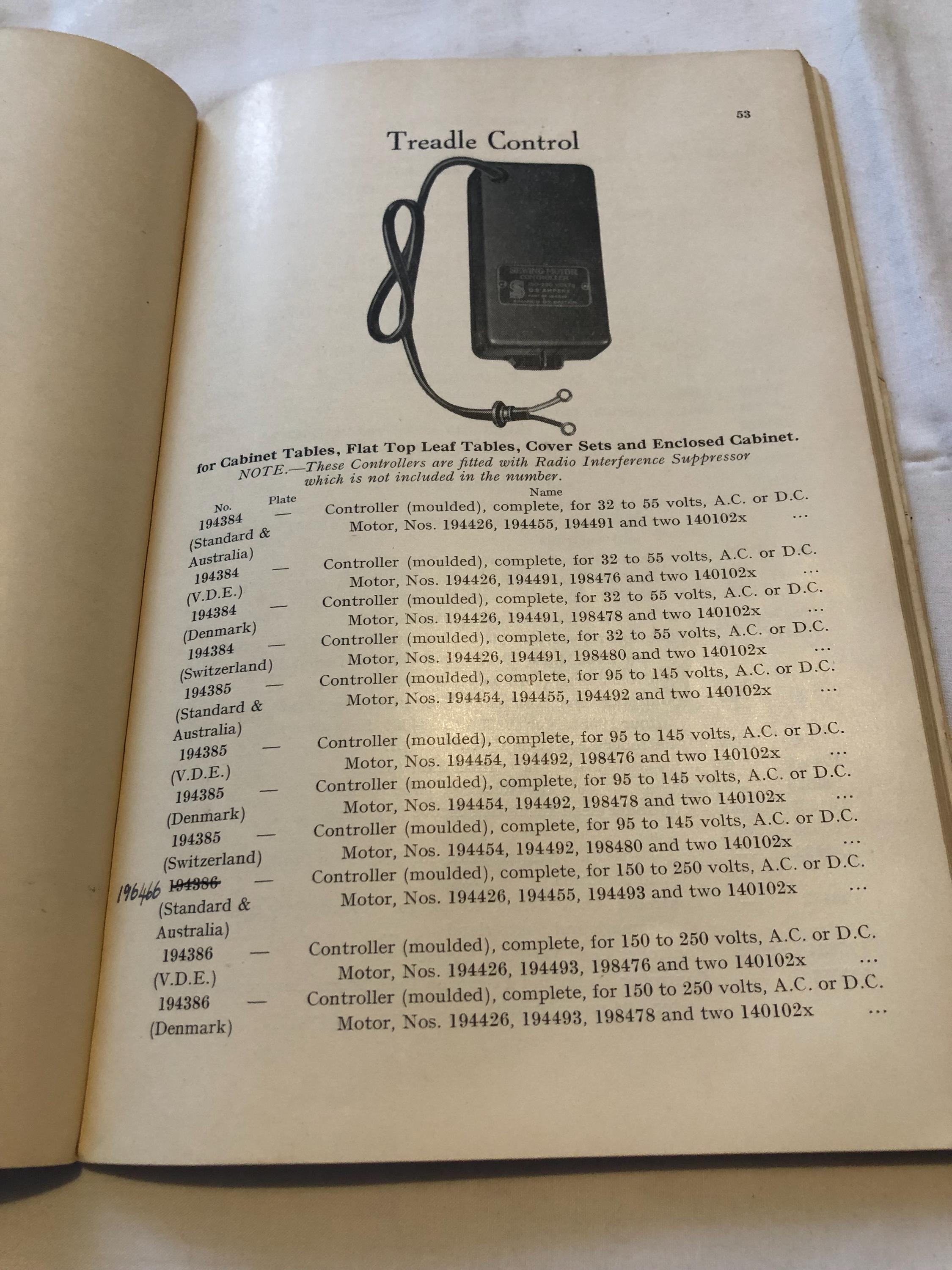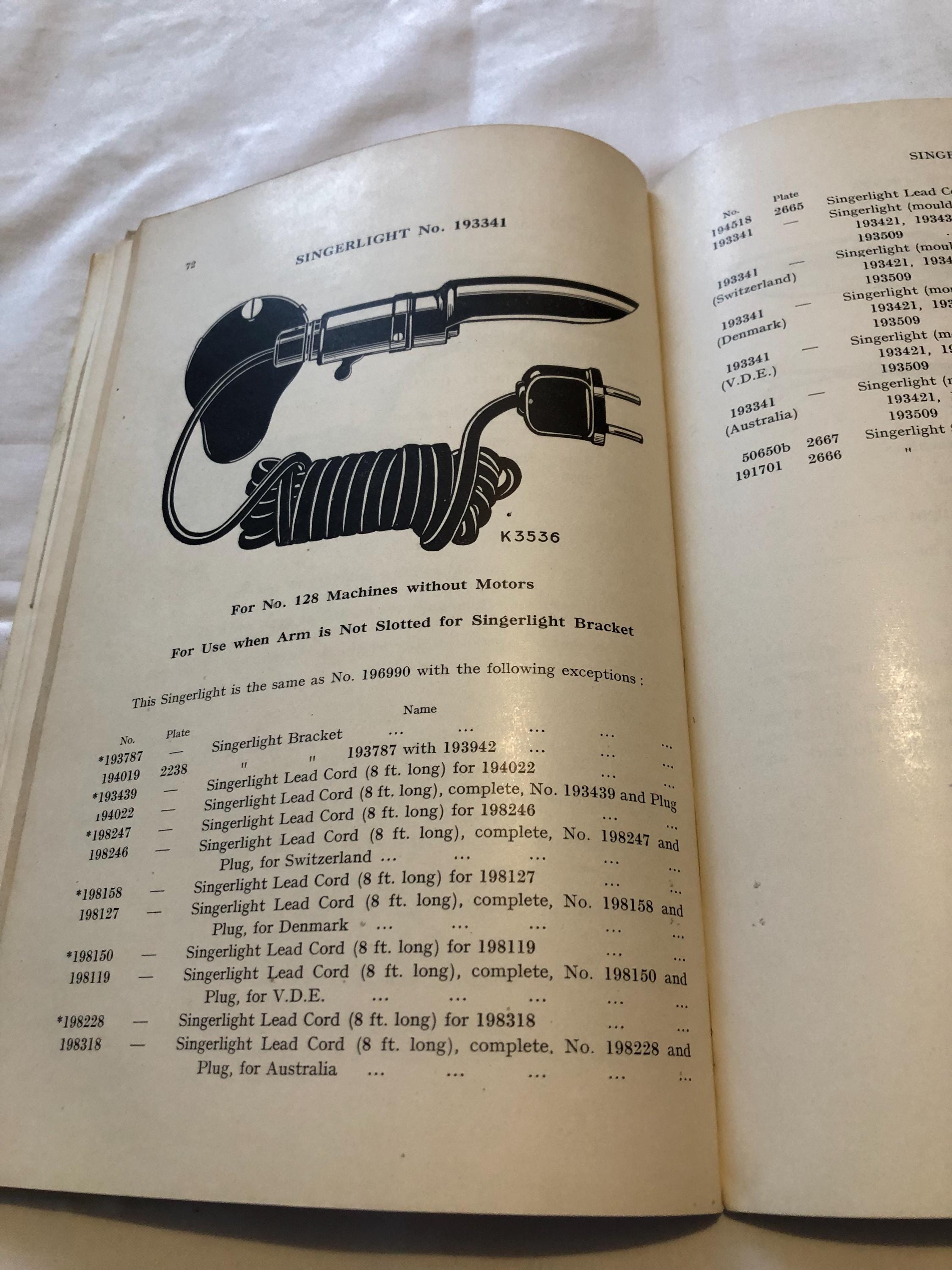 This is a rare opportunity to own an original Singer book "Illustrated list of parts for B.A.K.4 Motors and Singer lights for family machines".