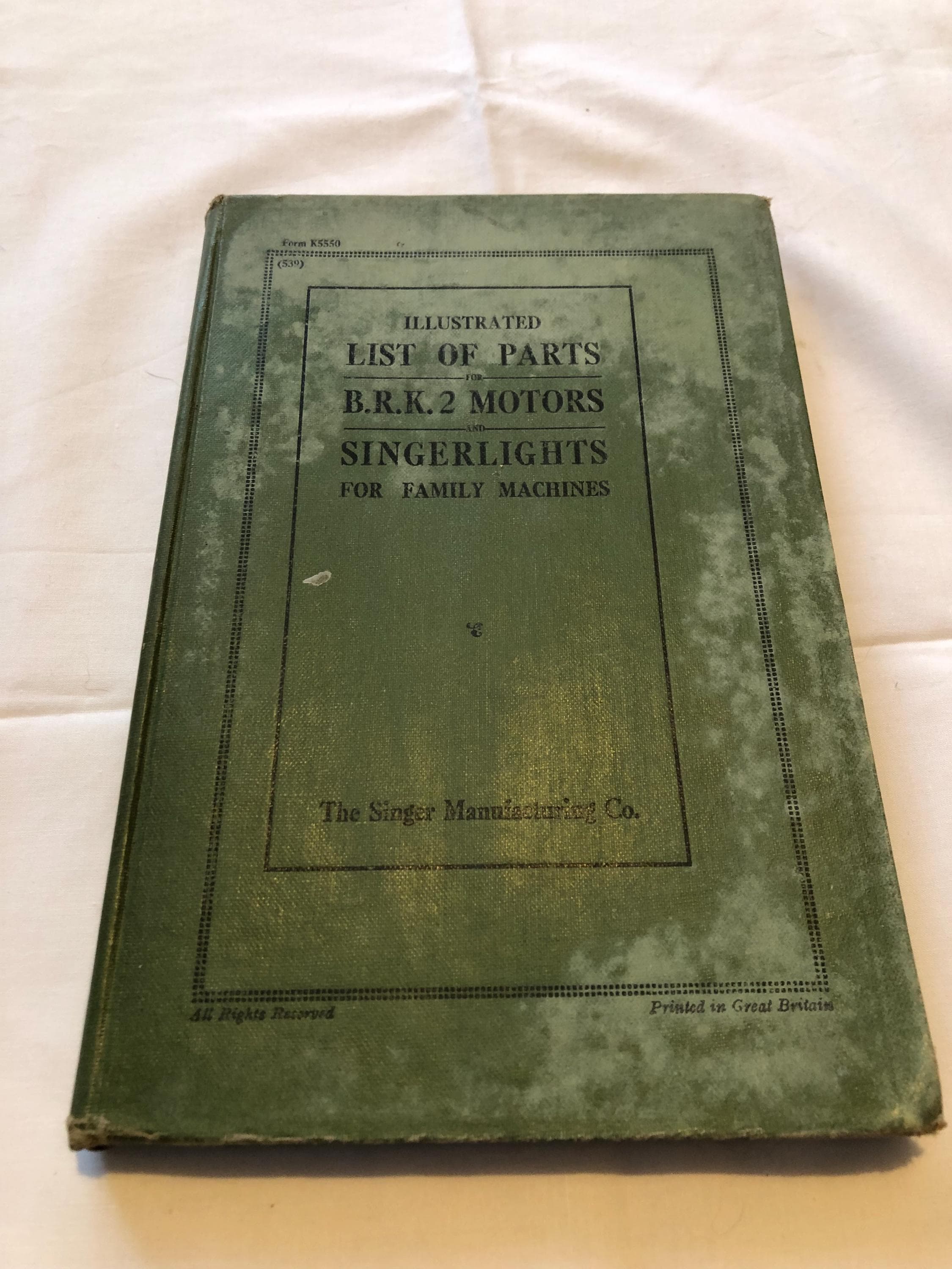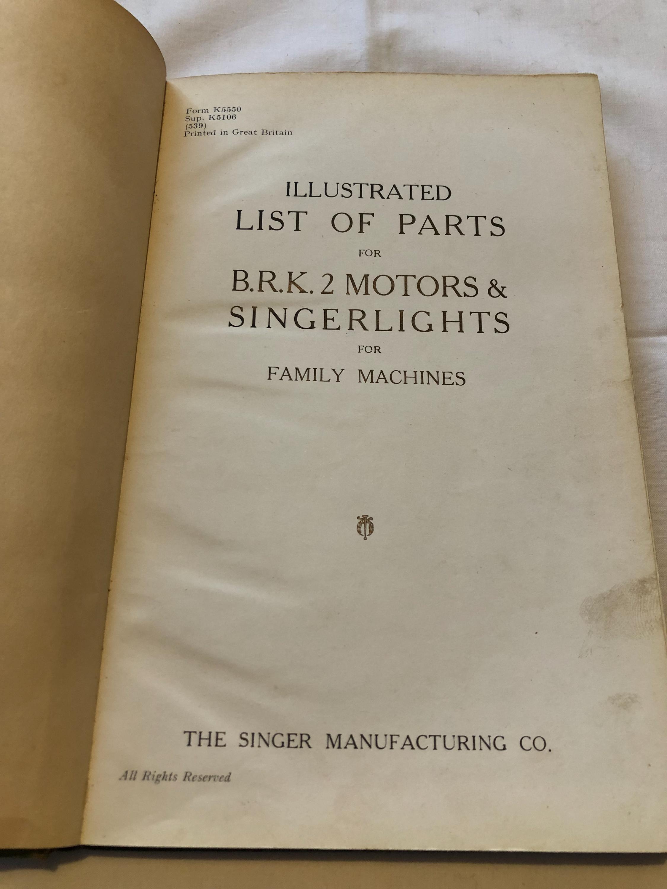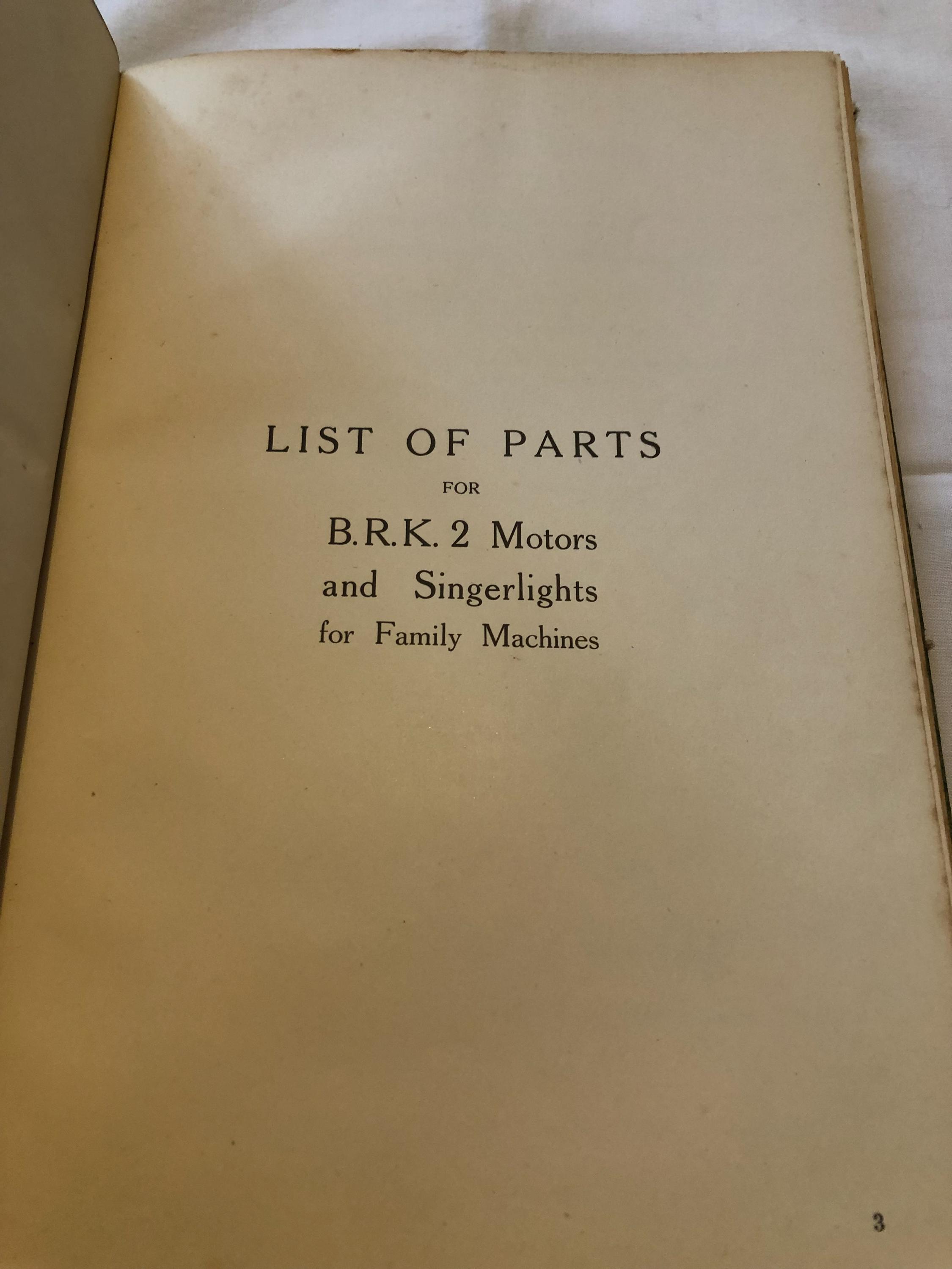 This is a rare opportunity to own an original Singer book "Illustrated List of Parts B.R.K 2 Motors Singer Lights for Family Machines" (2)