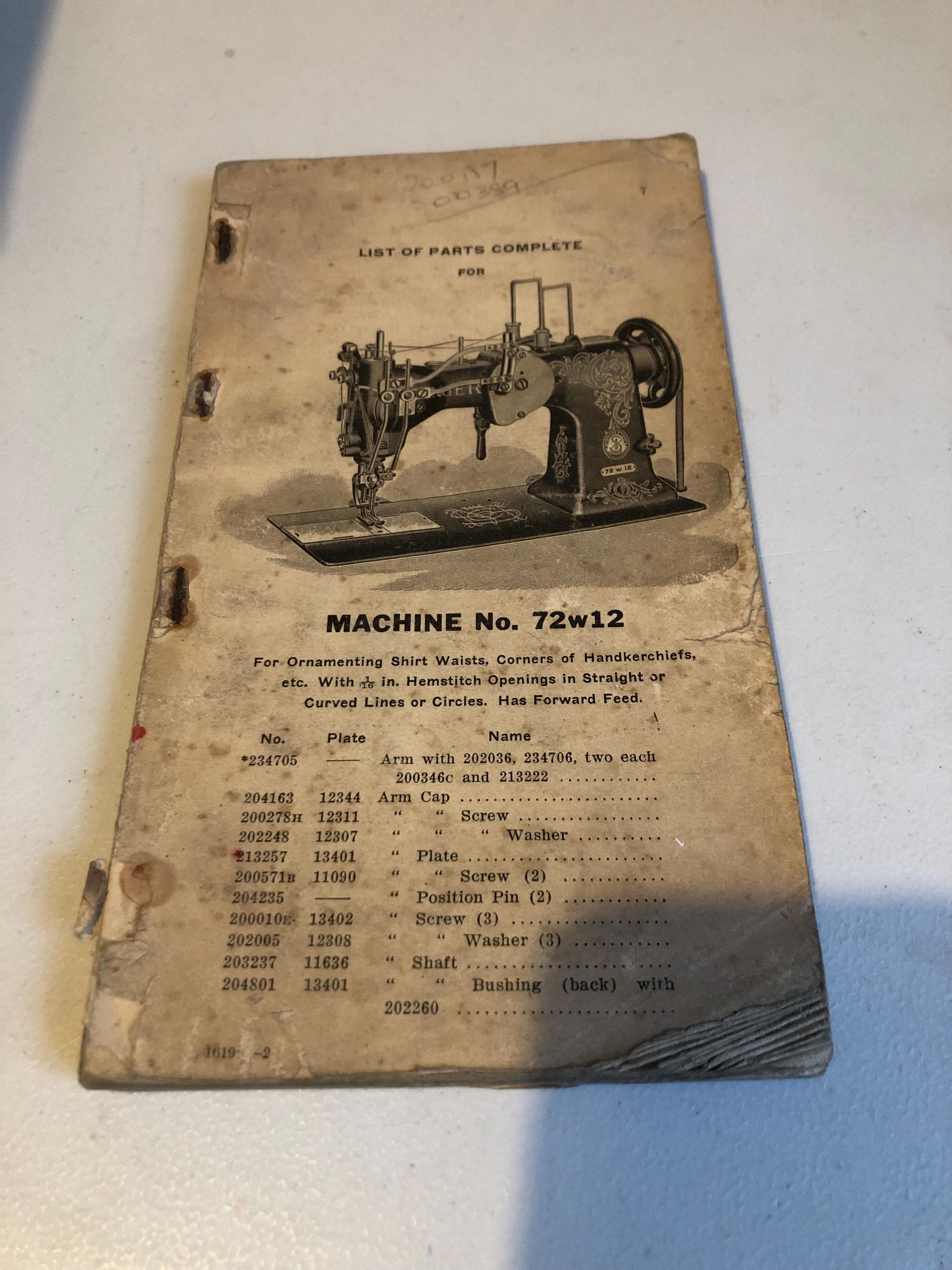 This is a rare opportunity to own an original Singer book "List of Parts Complete for Machine No.72w12.