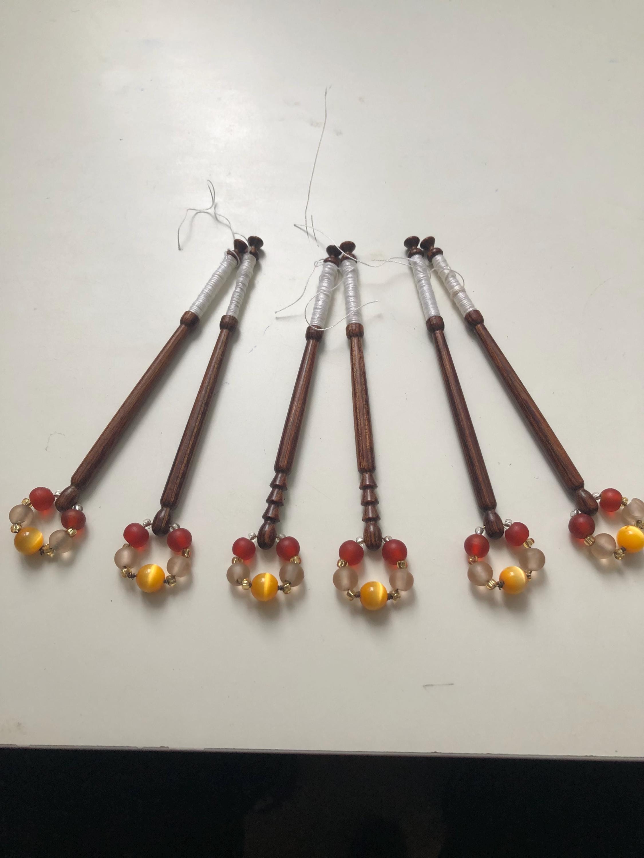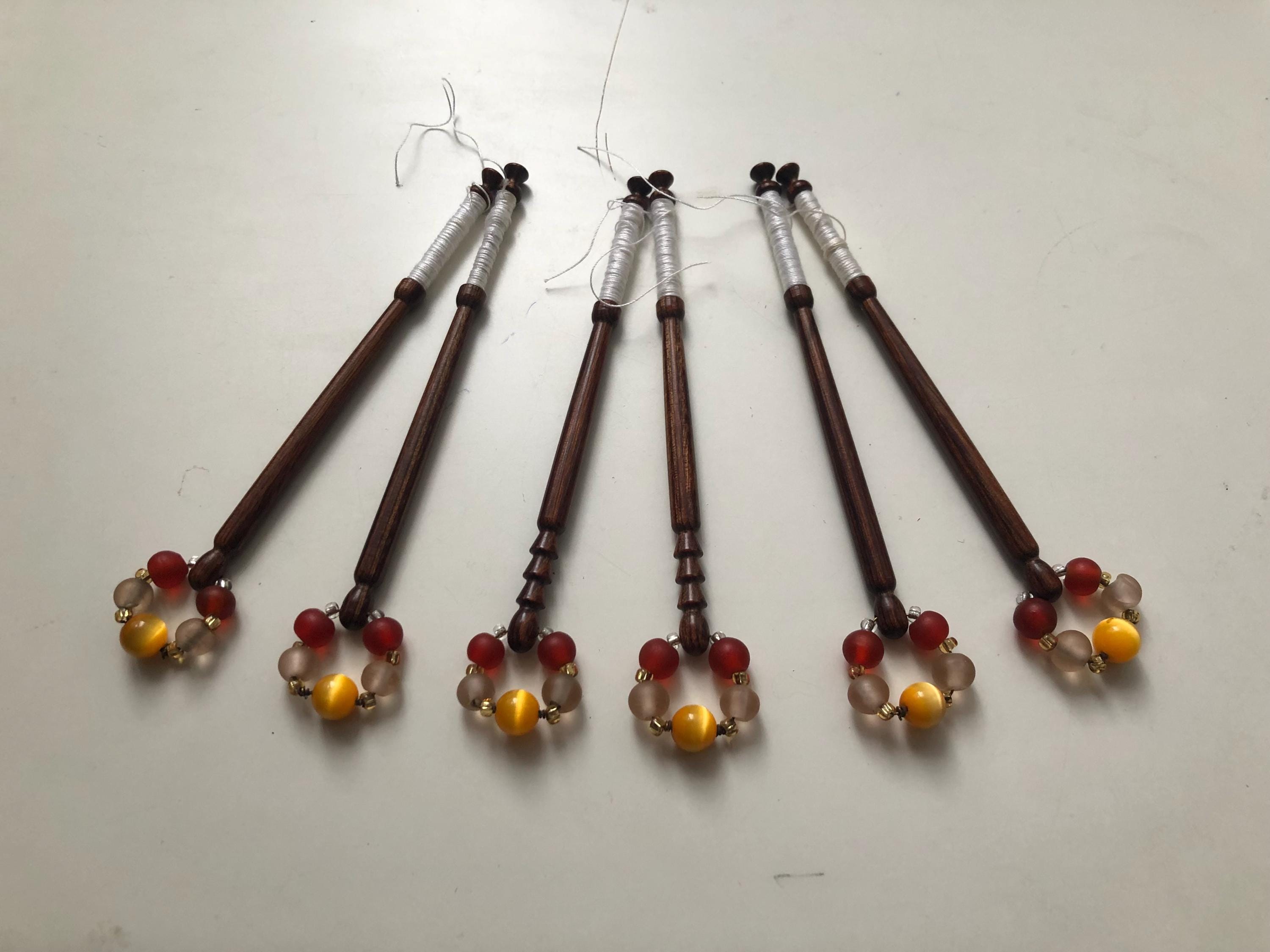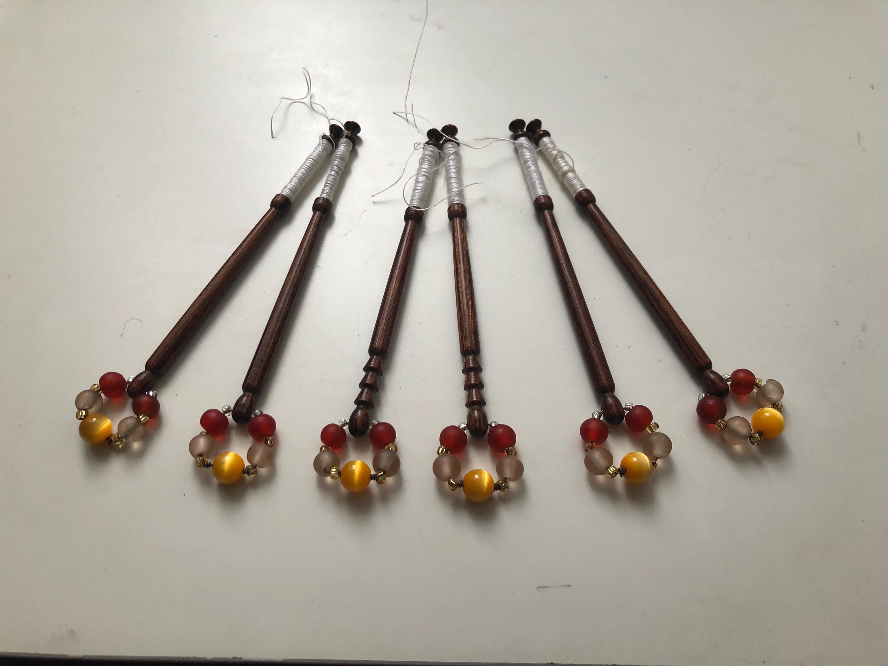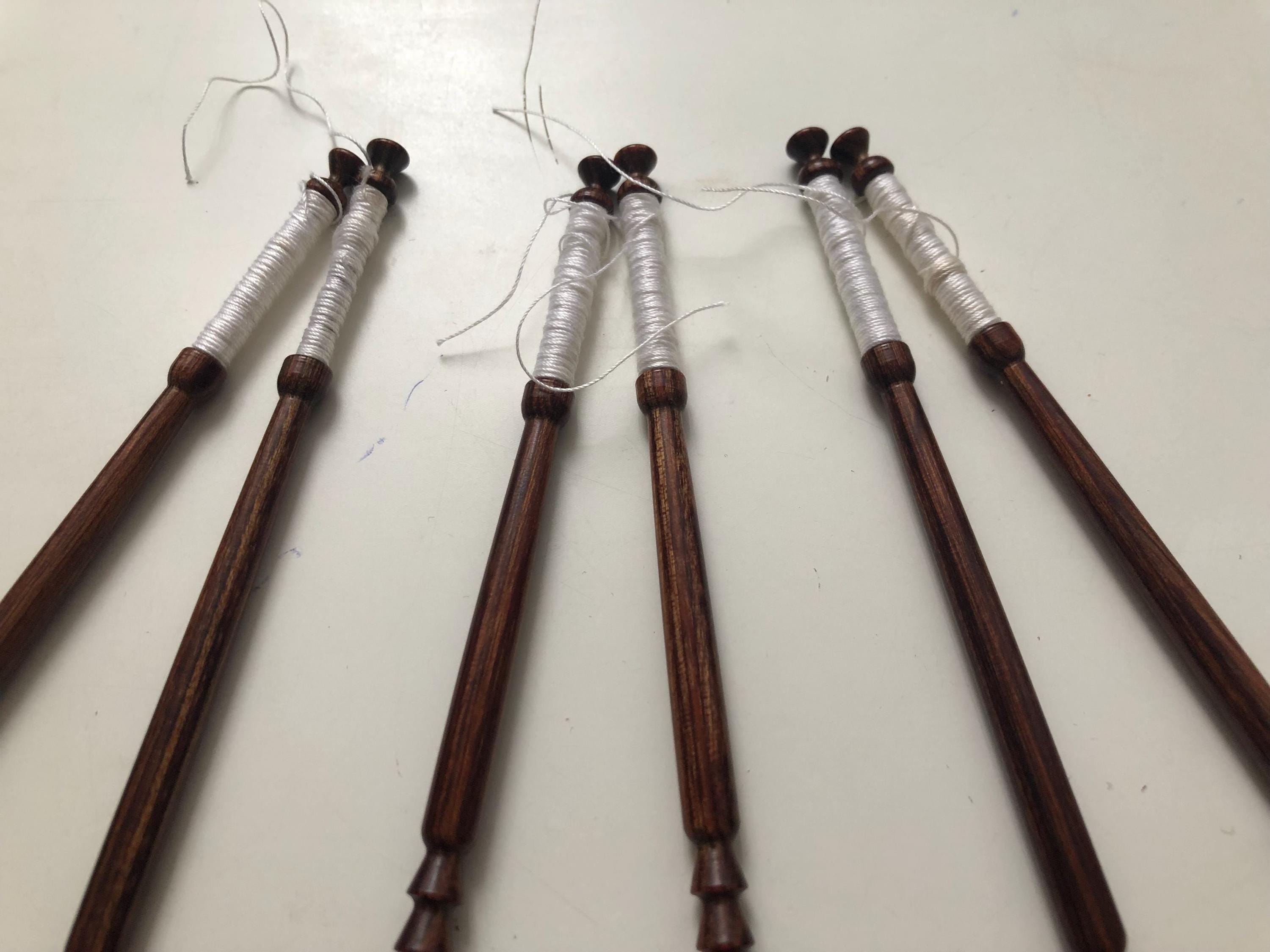6 different wooden lacemaking bobbins with matching spangles