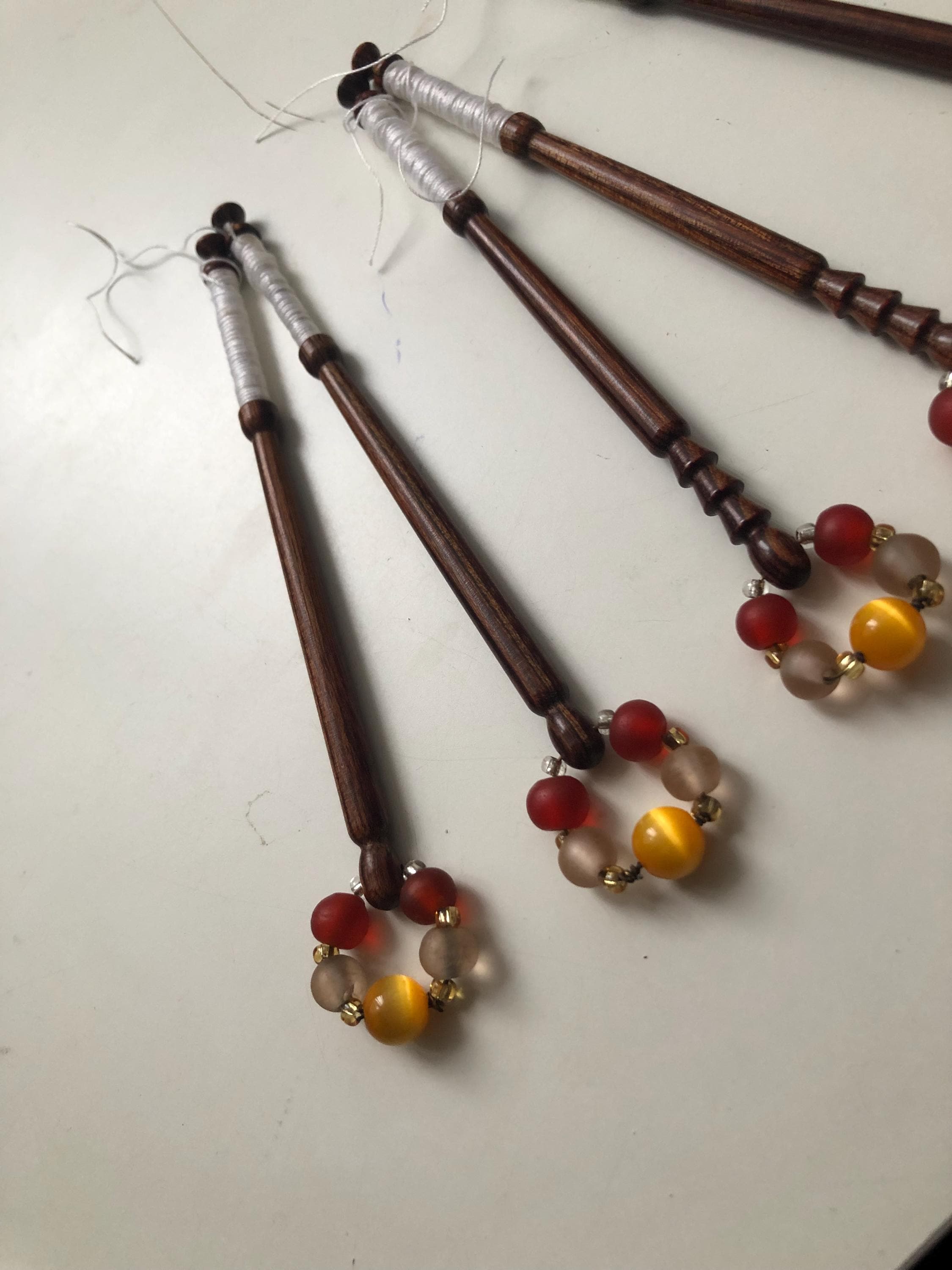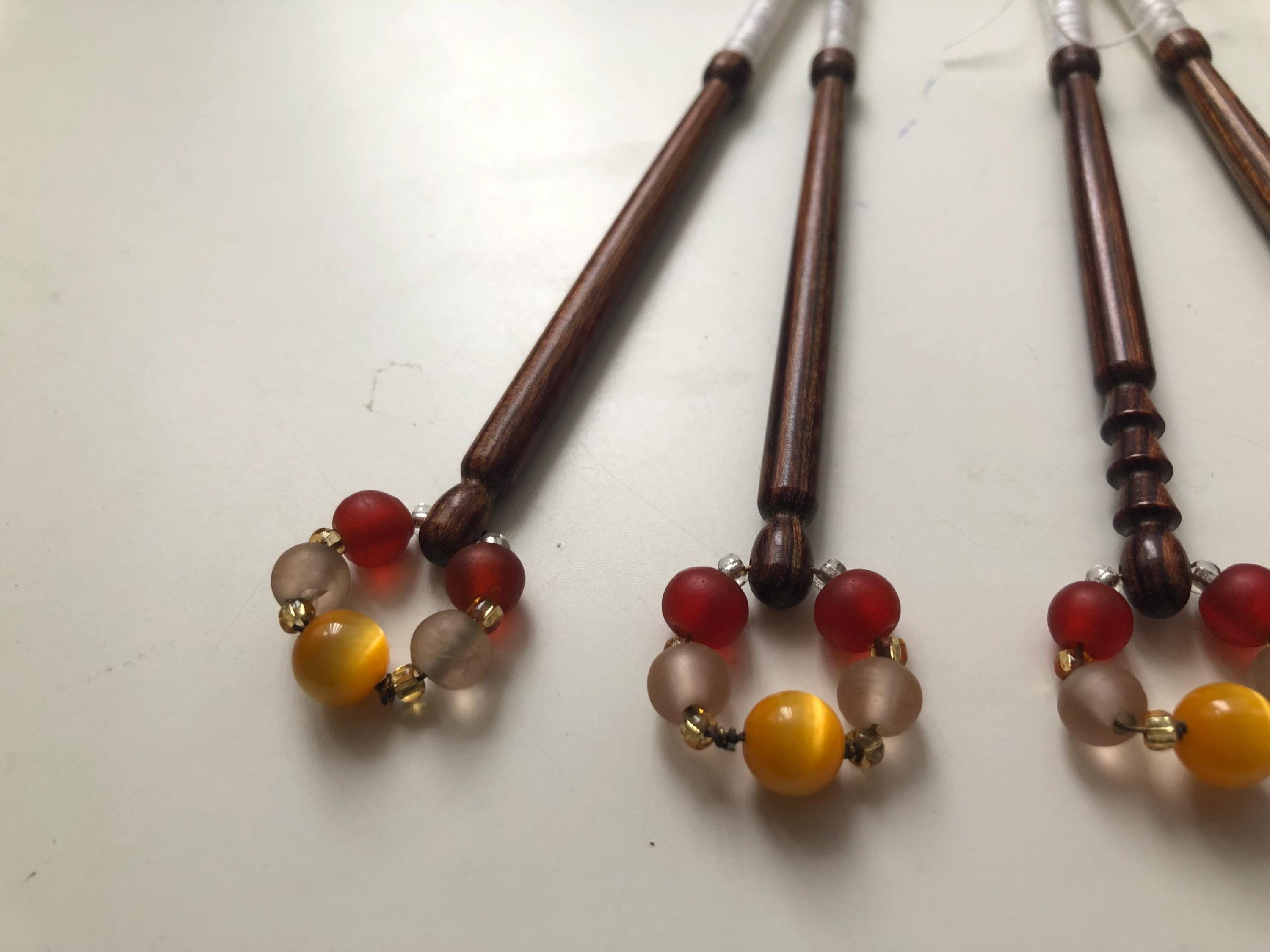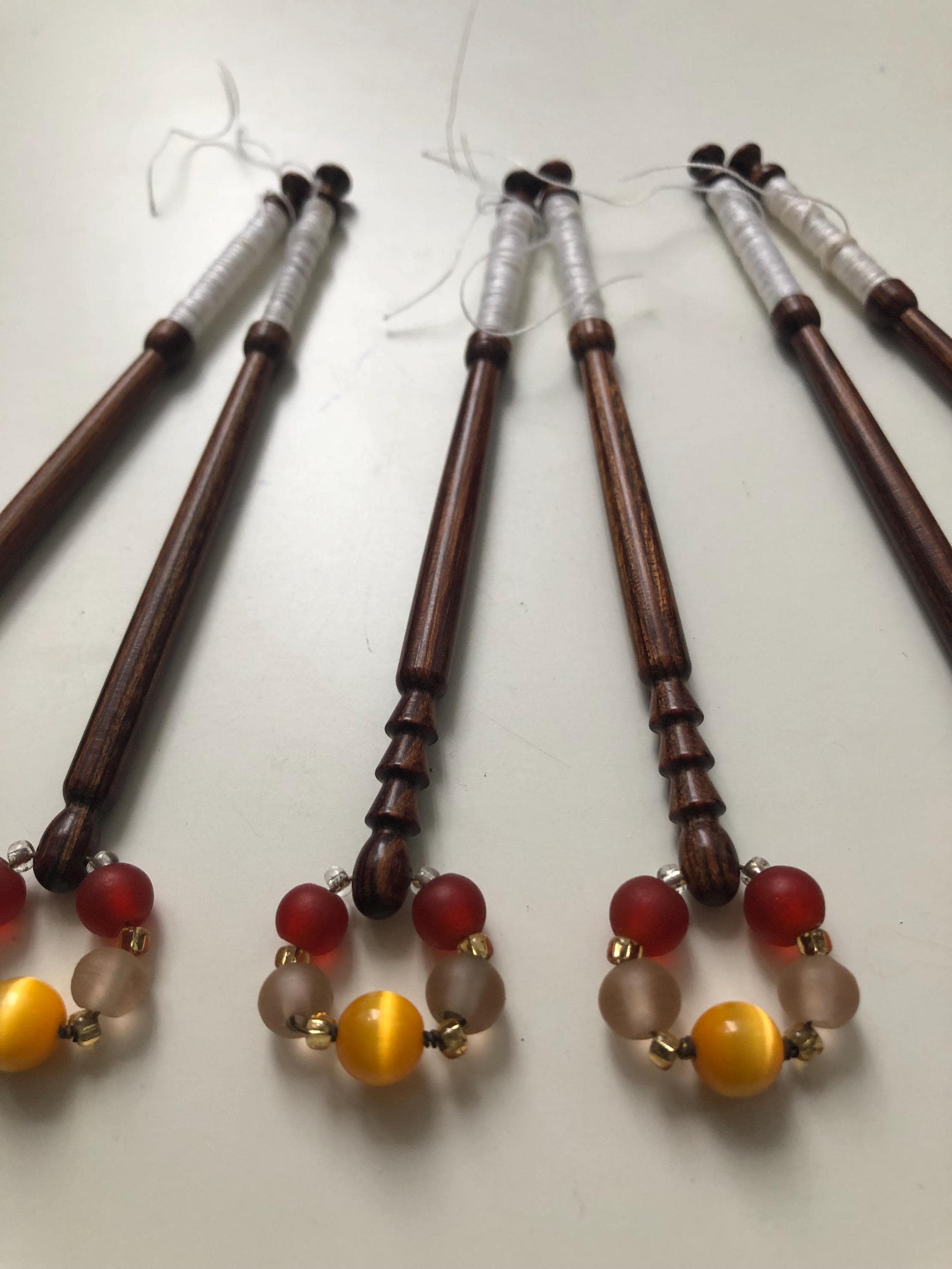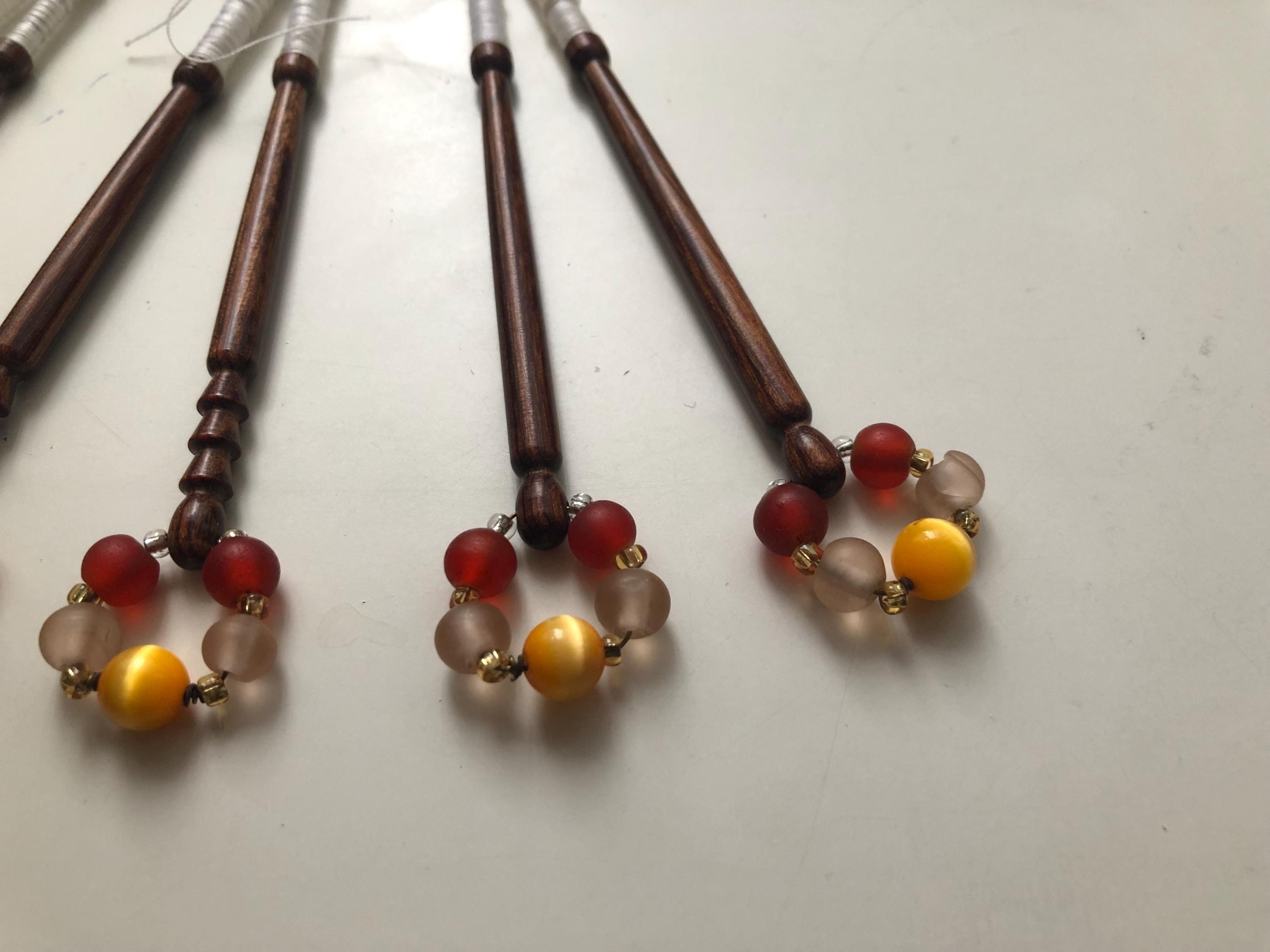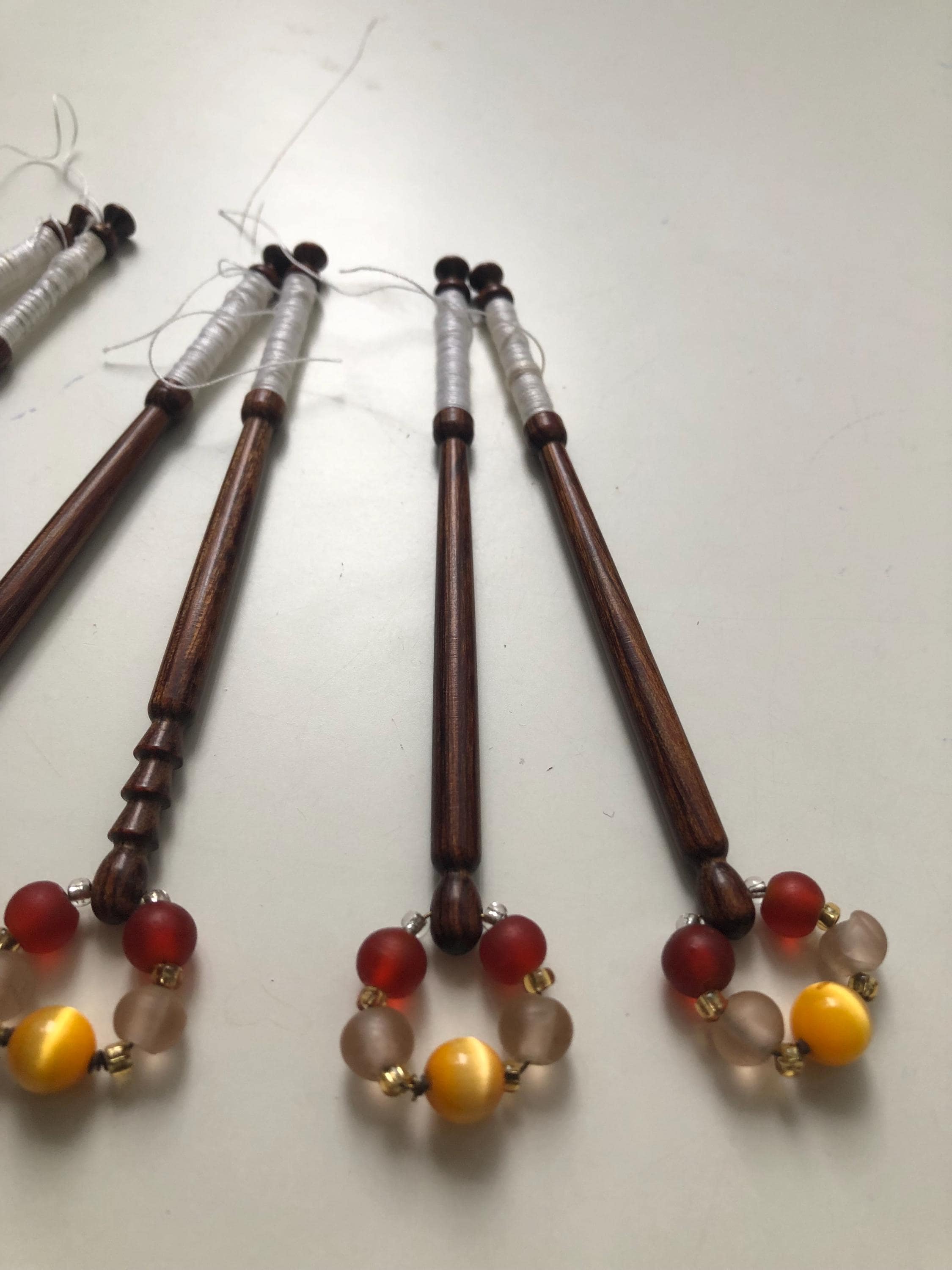 6 different wooden lacemaking bobbins with matching spangles