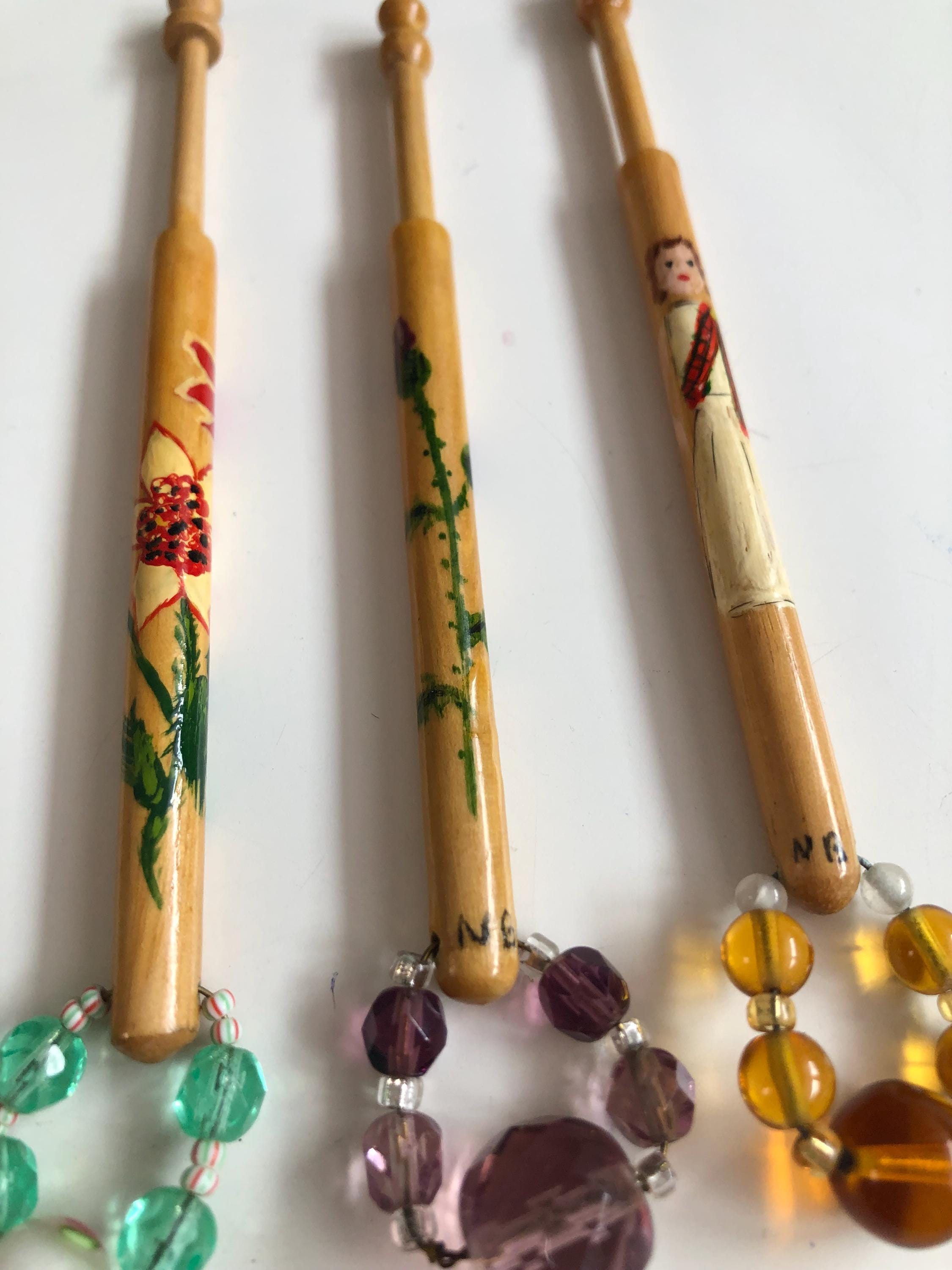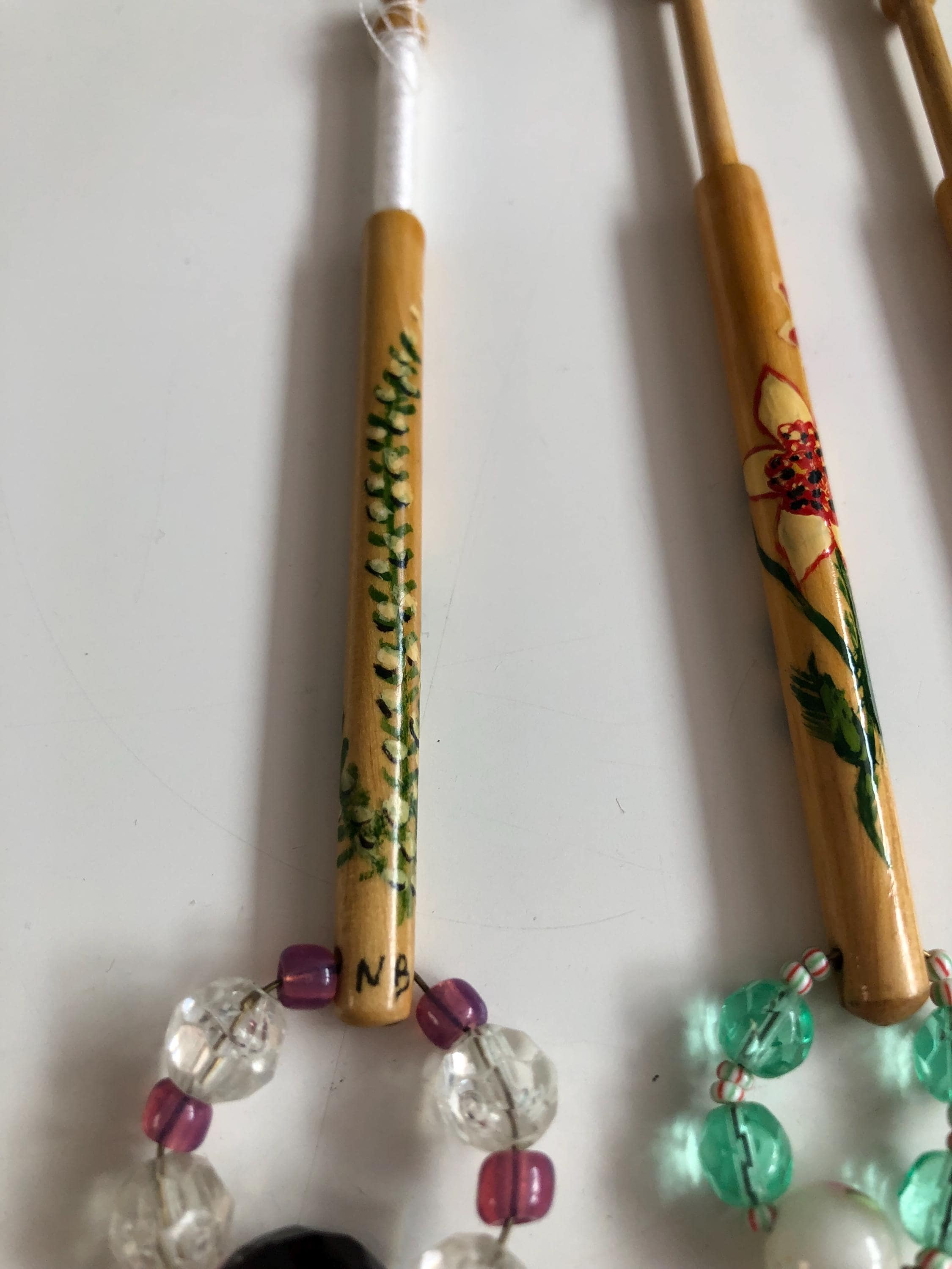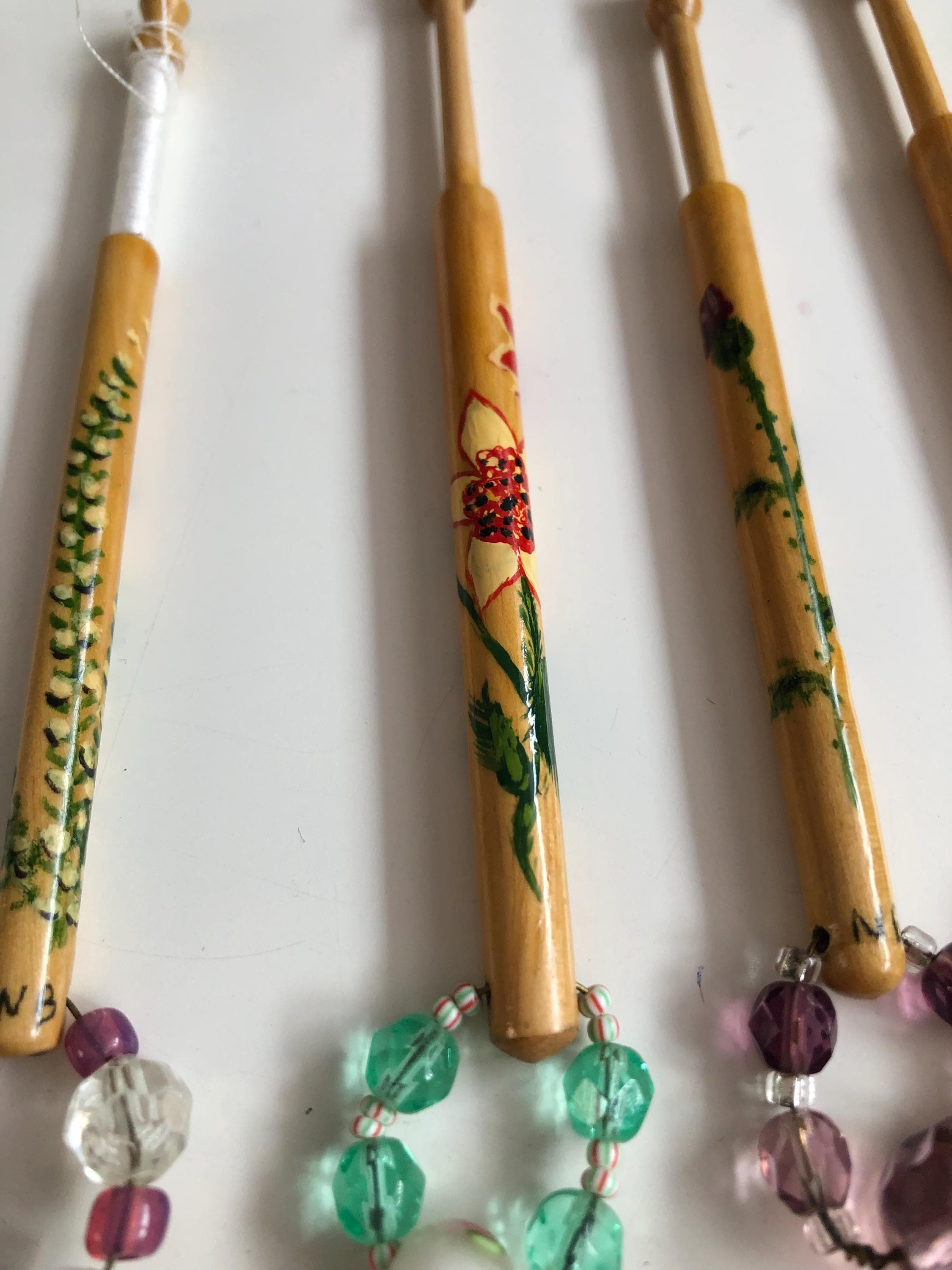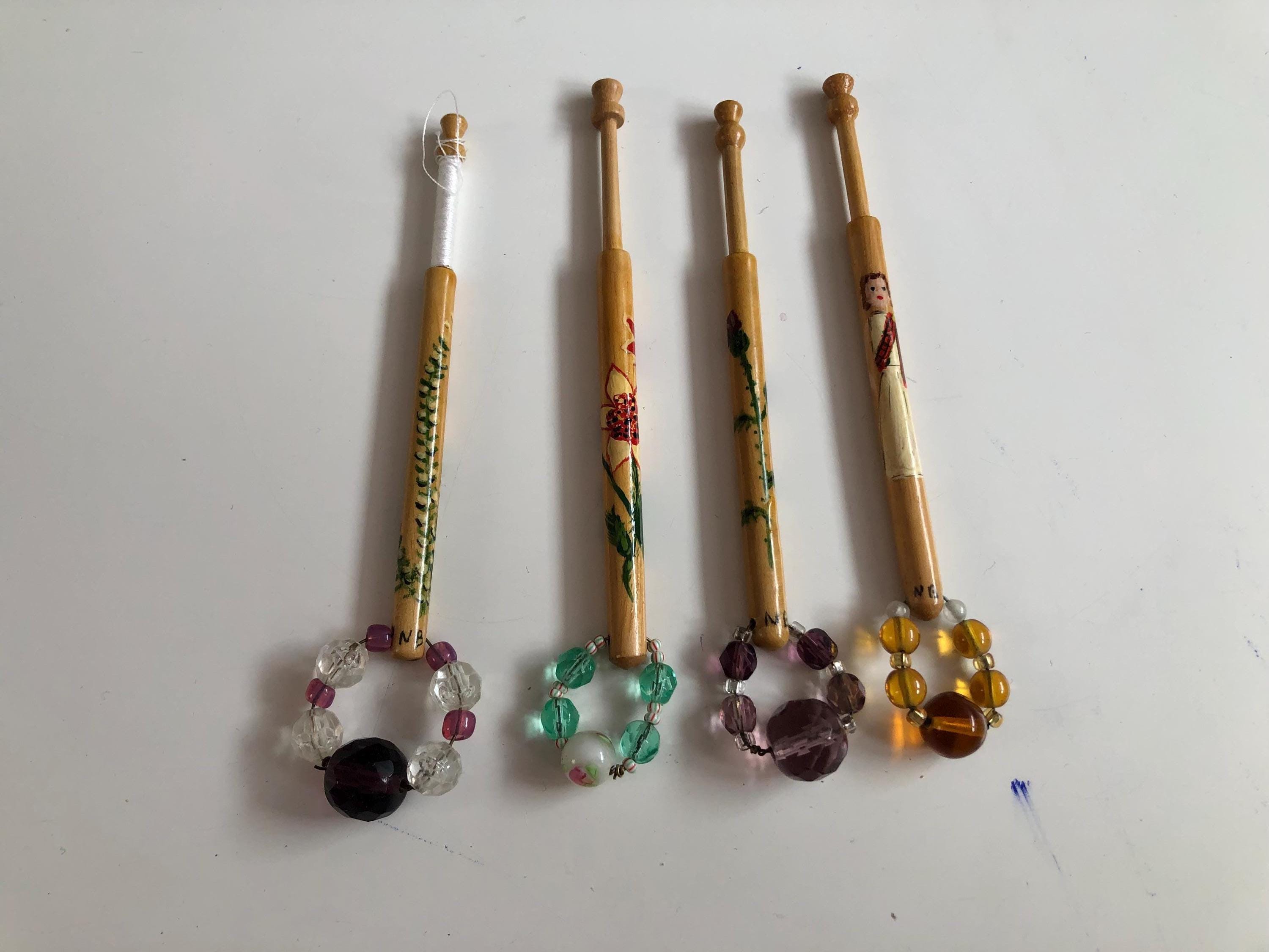 A set of 4 hand painted wooden lace making bobbins with pretty spangles.