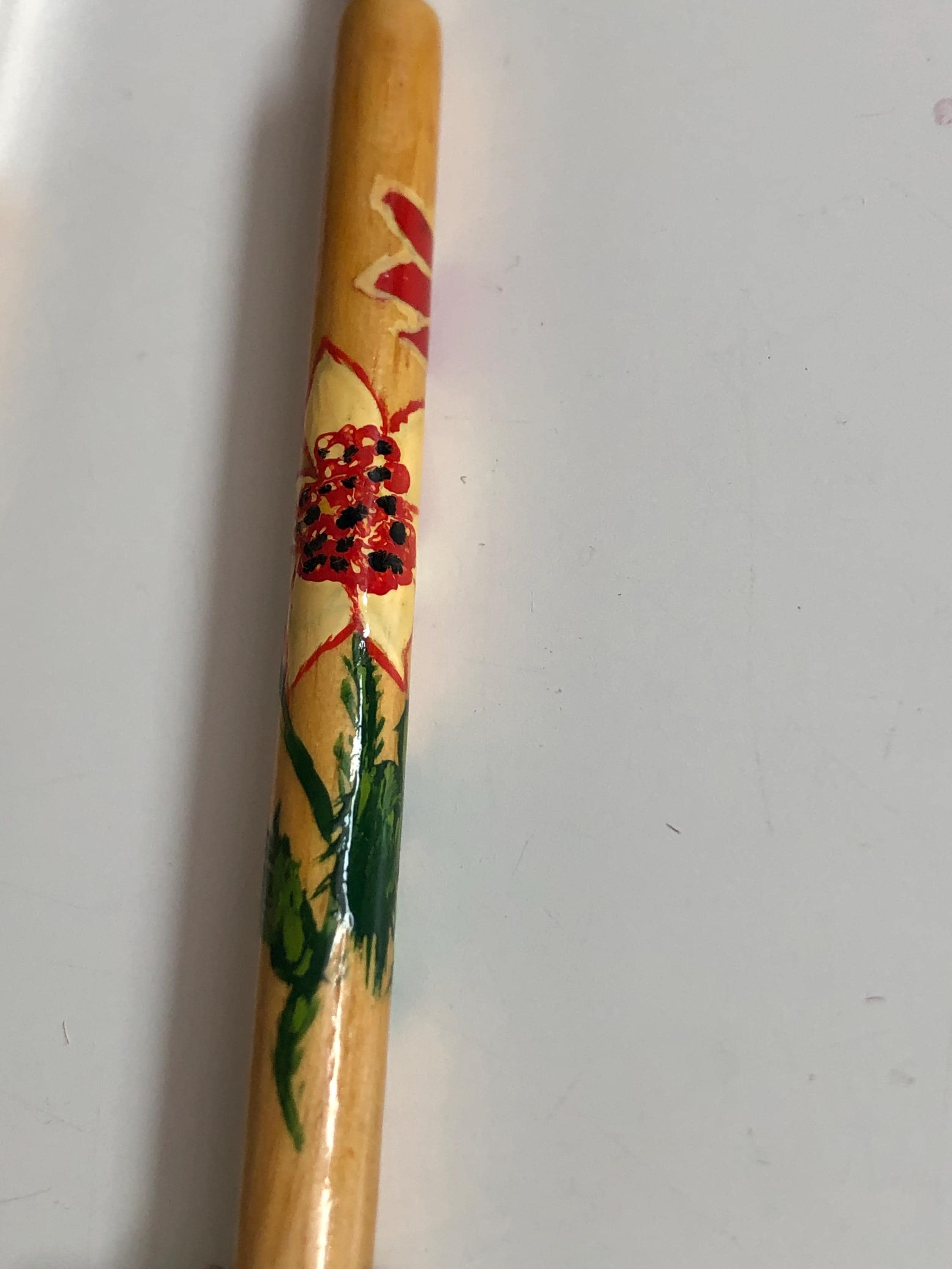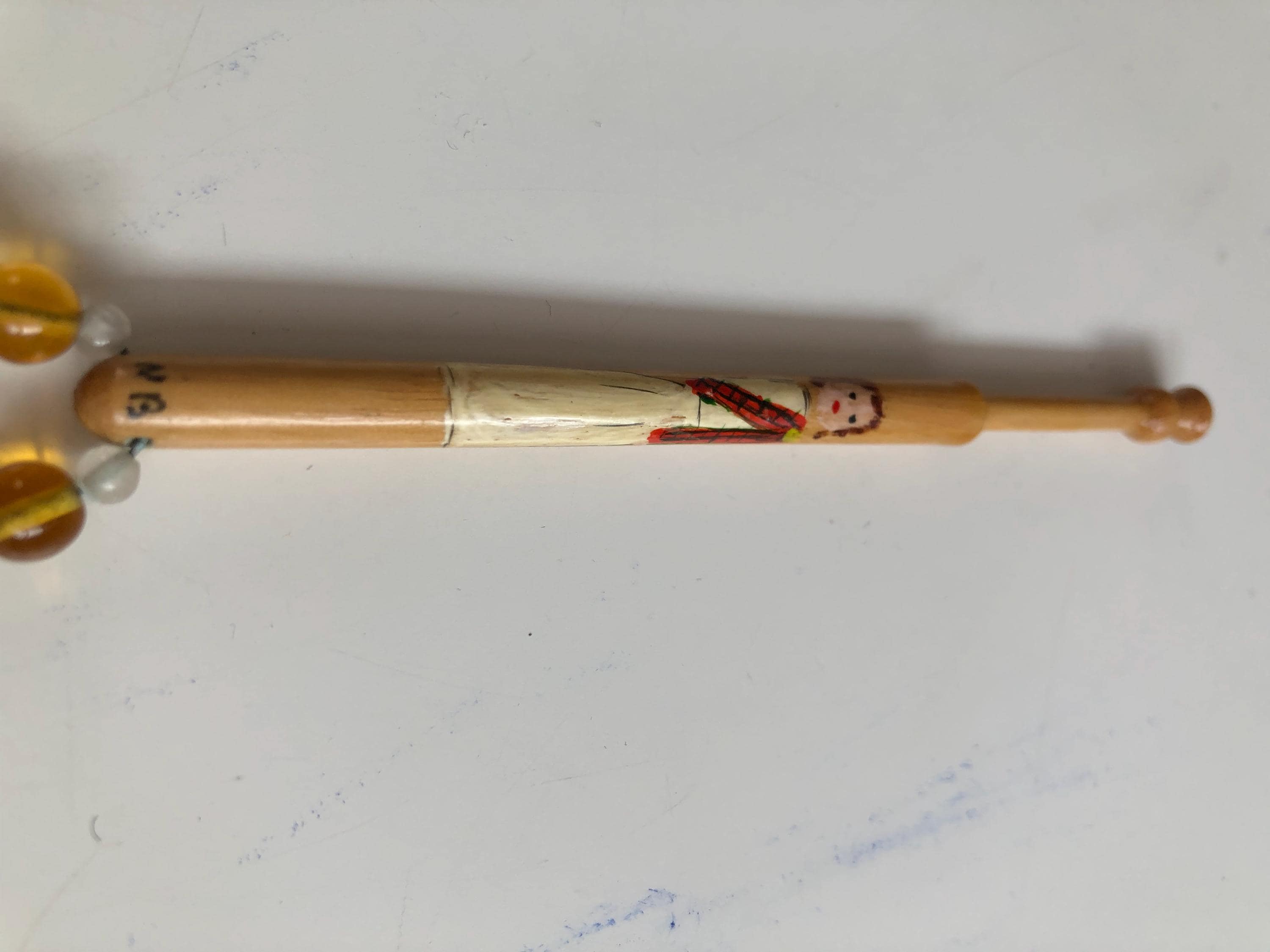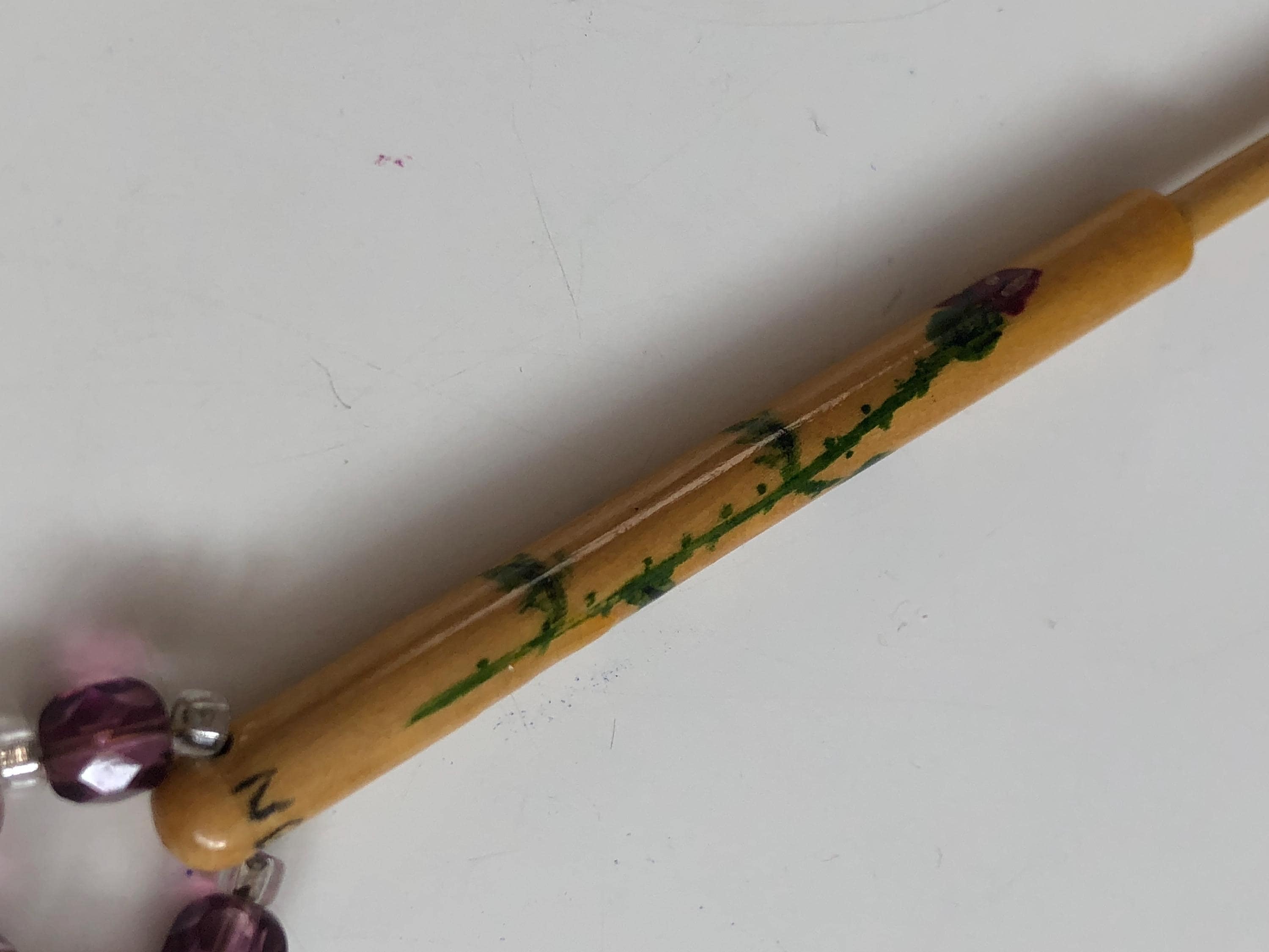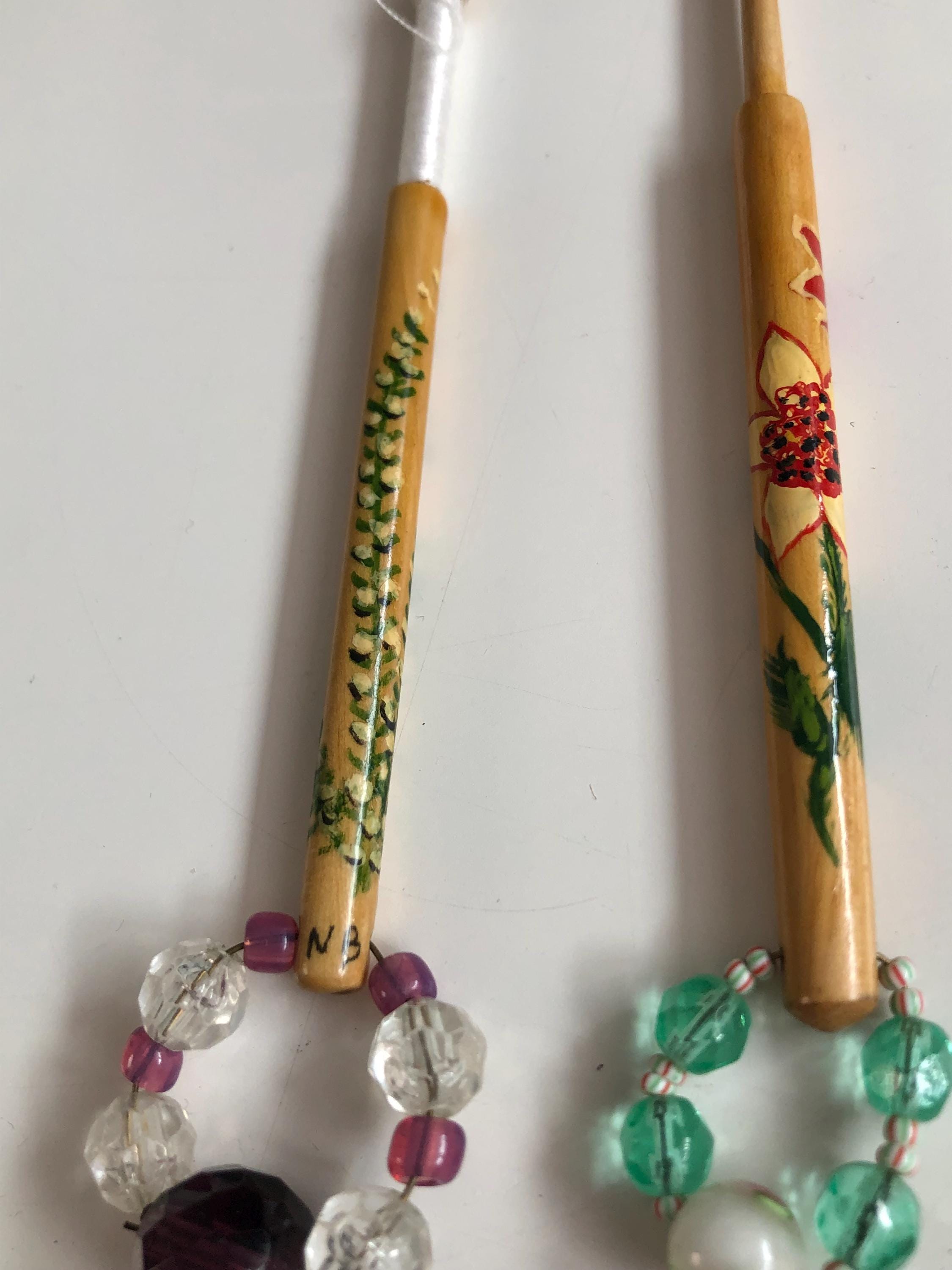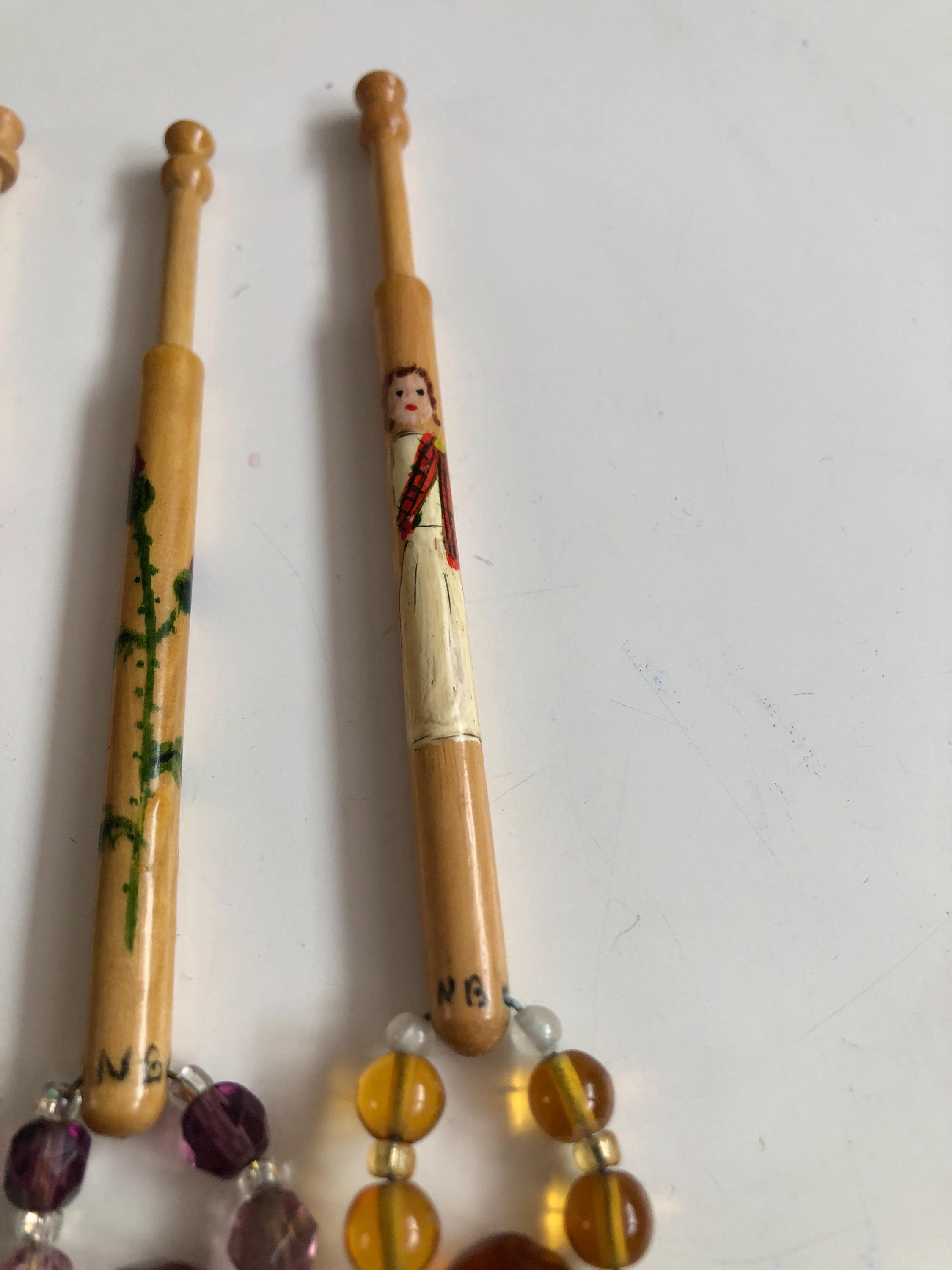 A set of 4 hand painted wooden lace making bobbins with pretty spangles.