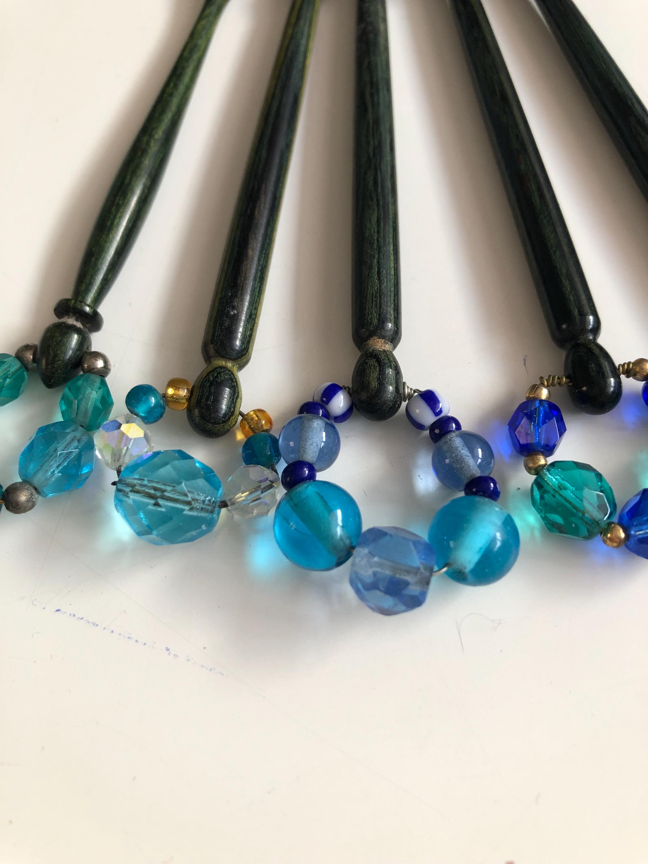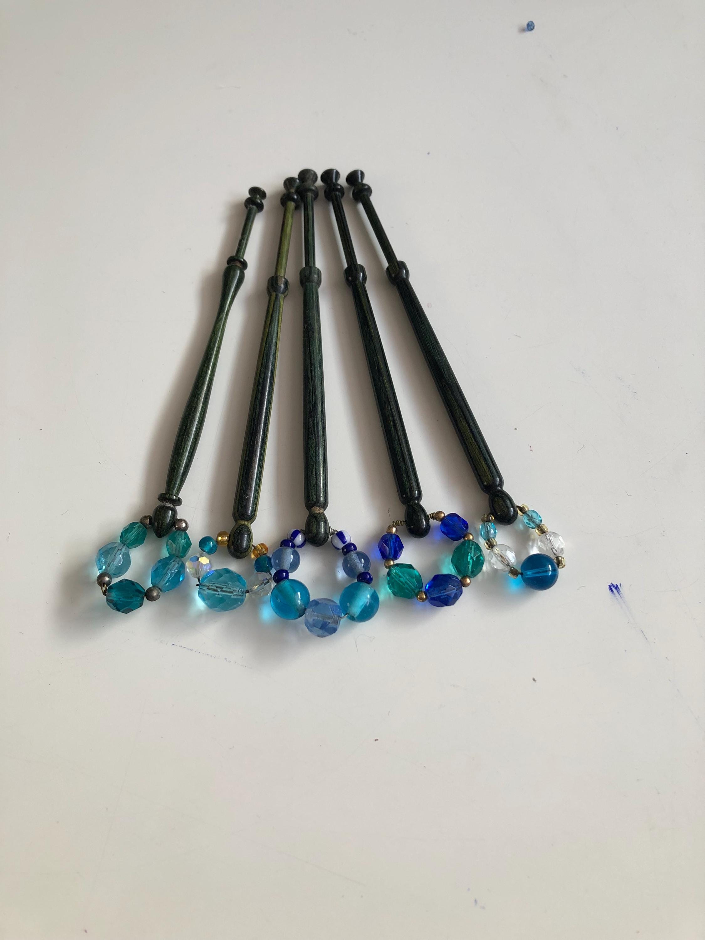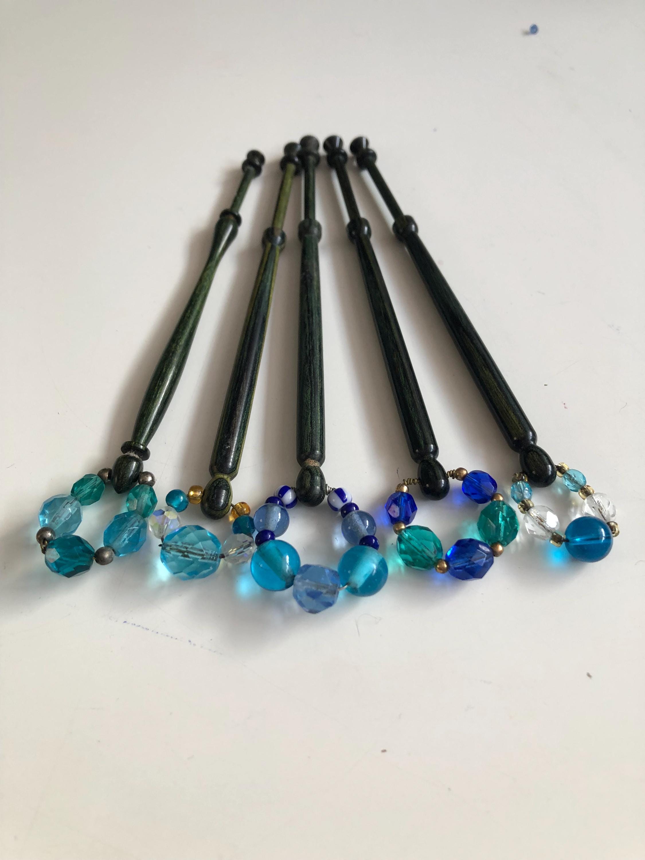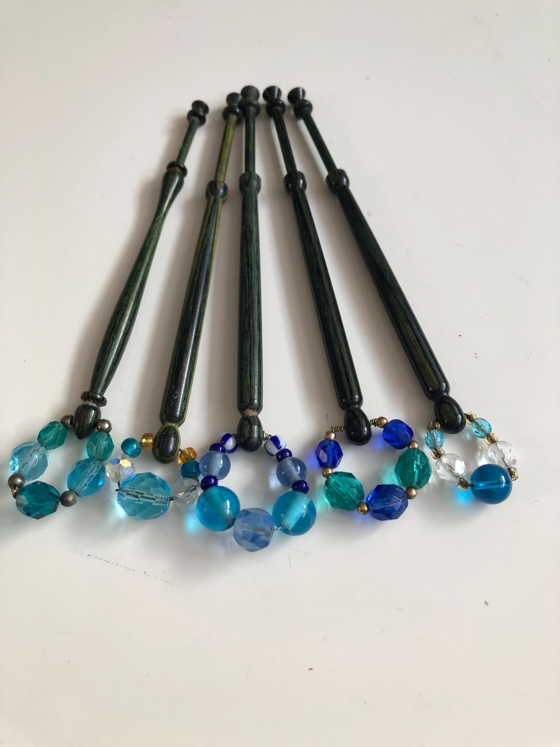 Set of 5 wooden lacemaking bobbins - green/blue coloured wood.