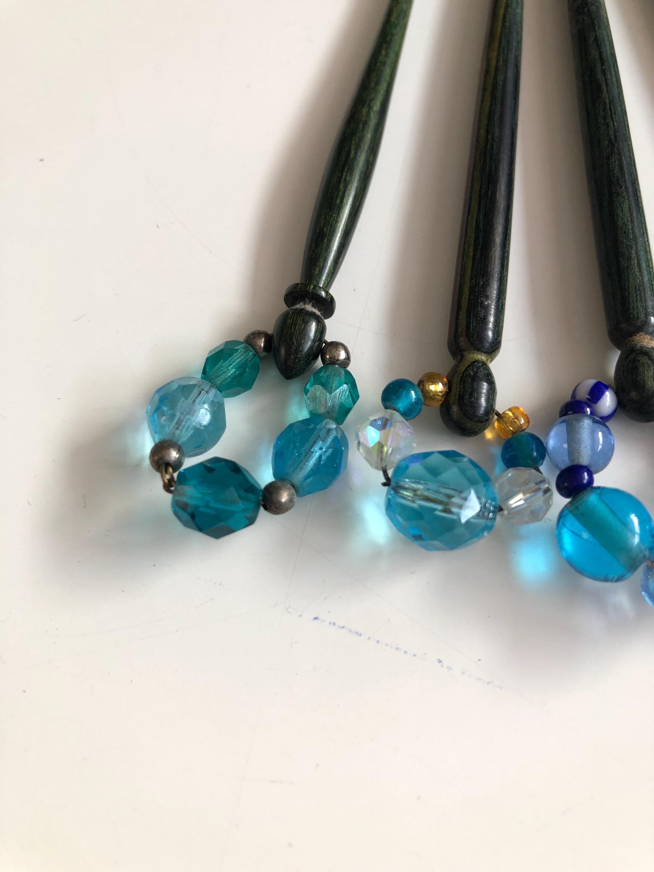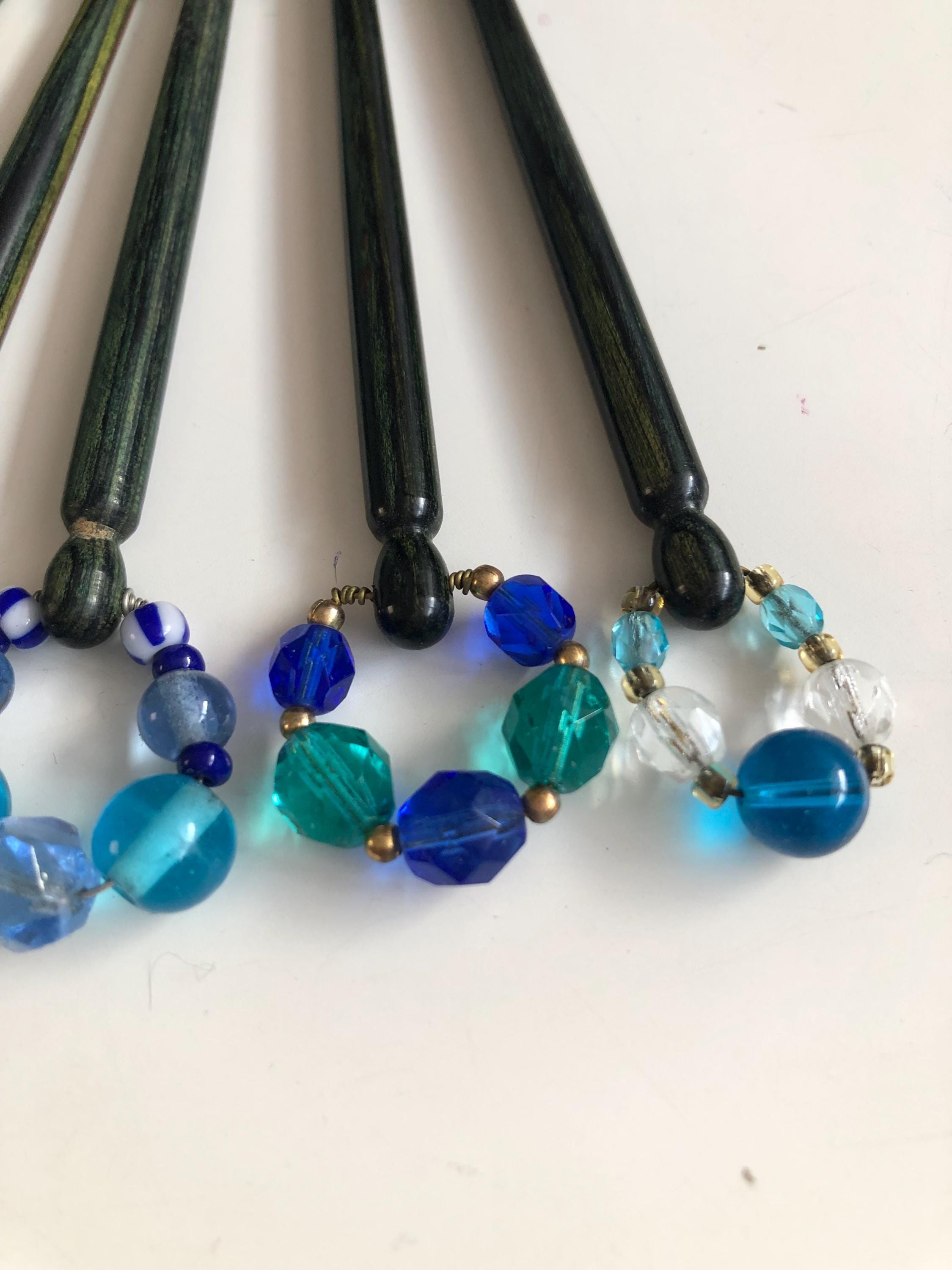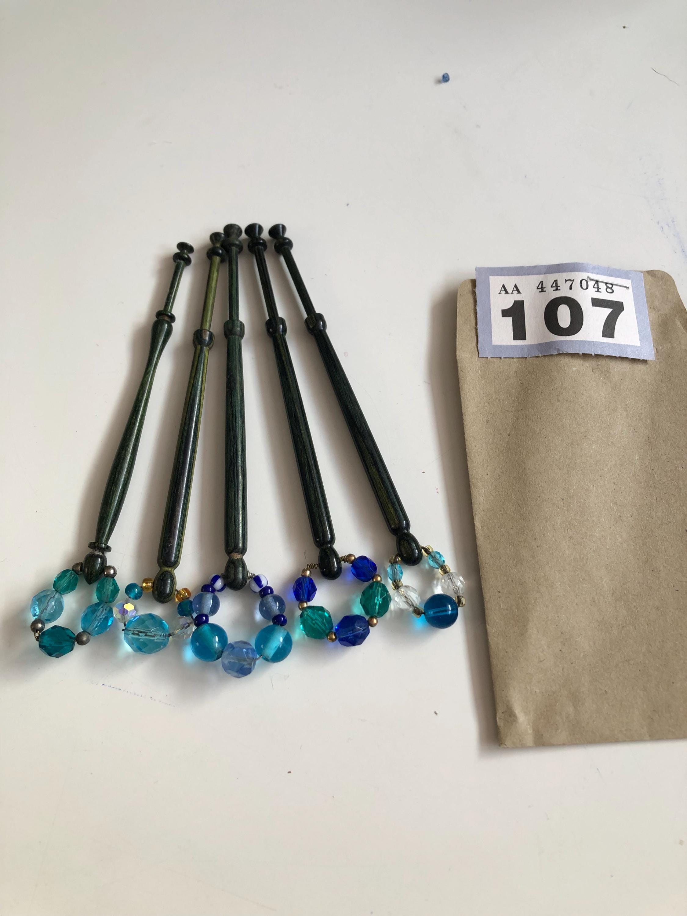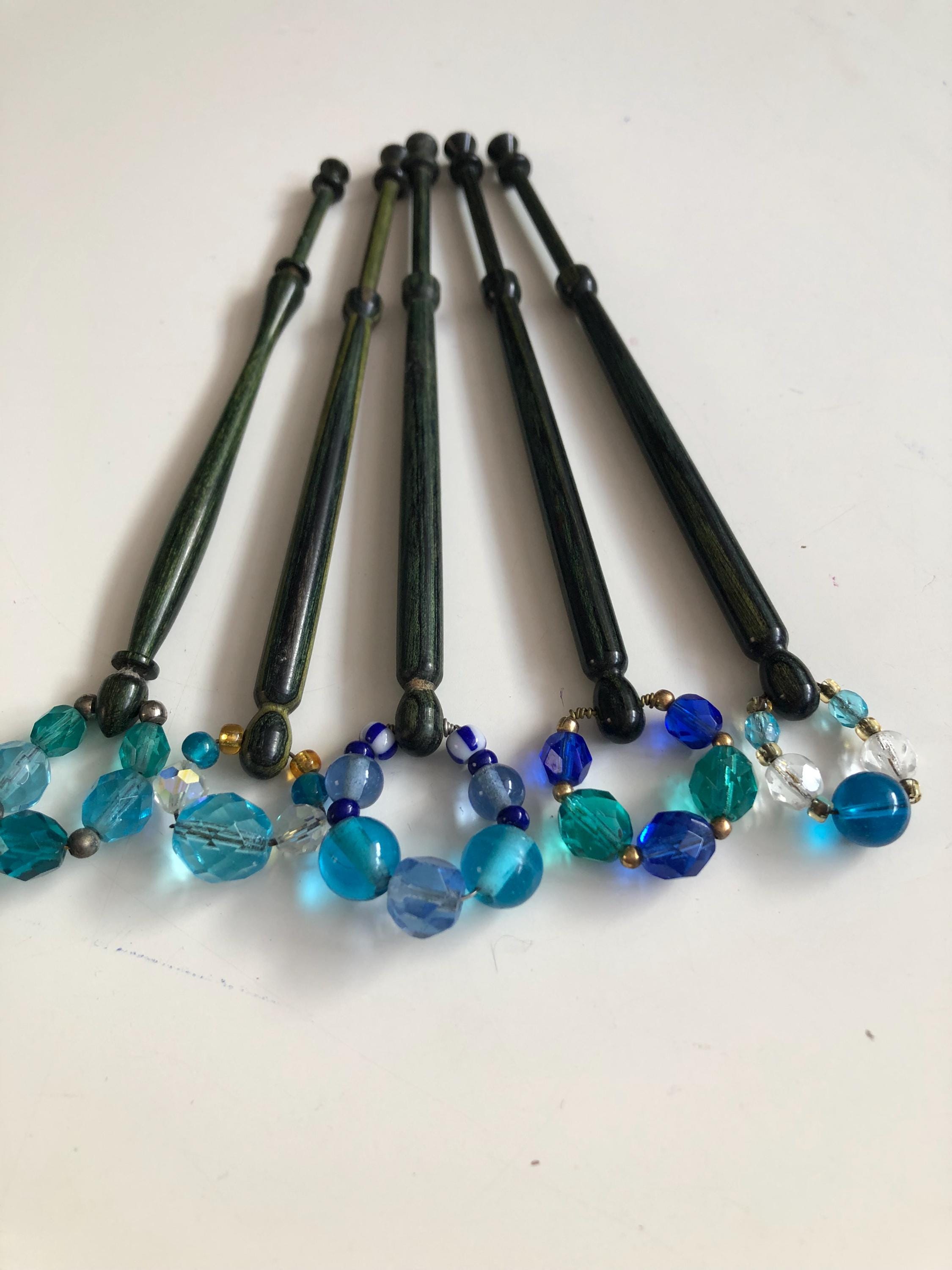 Set of 5 wooden lacemaking bobbins - green/blue coloured wood.
