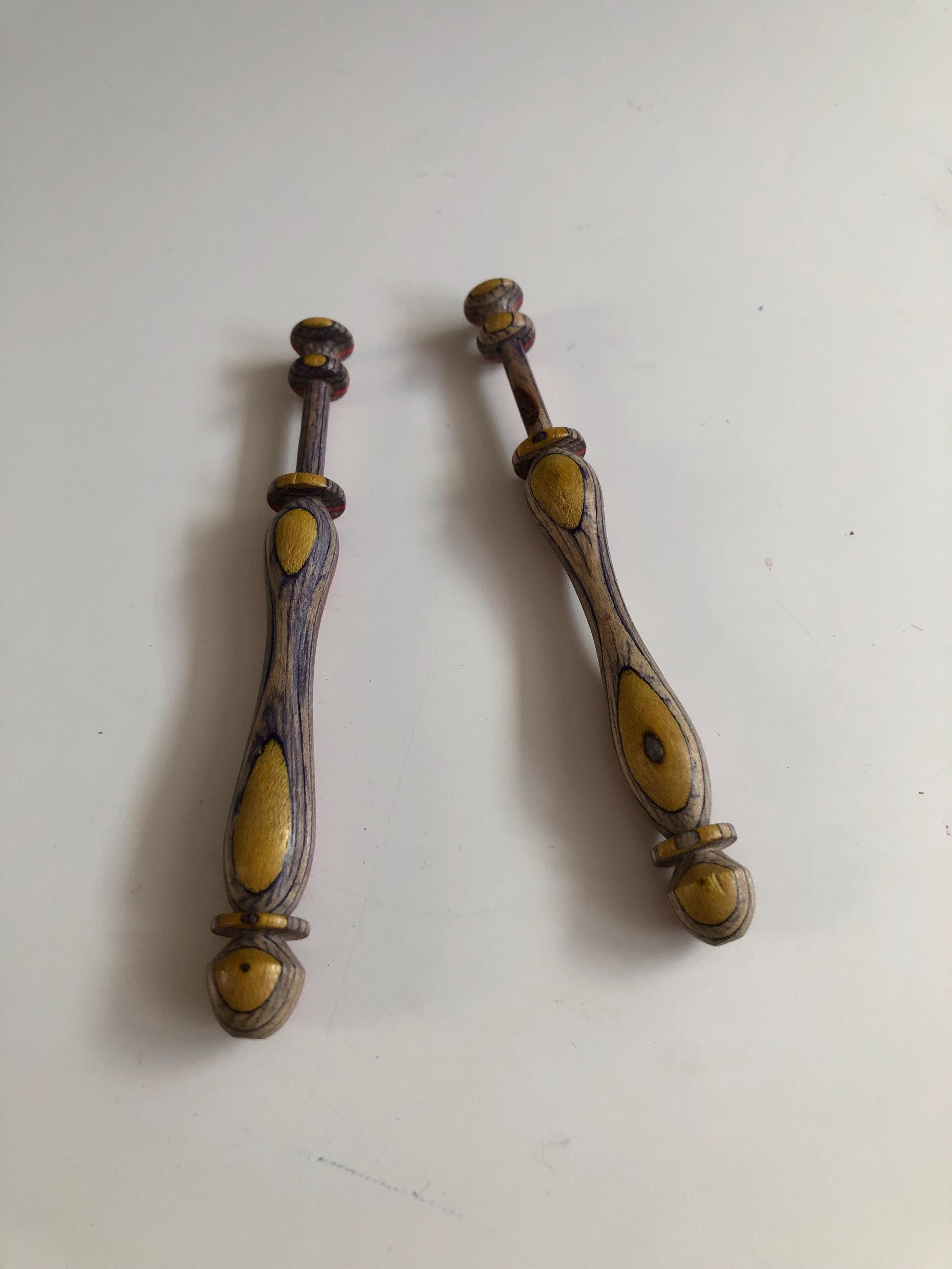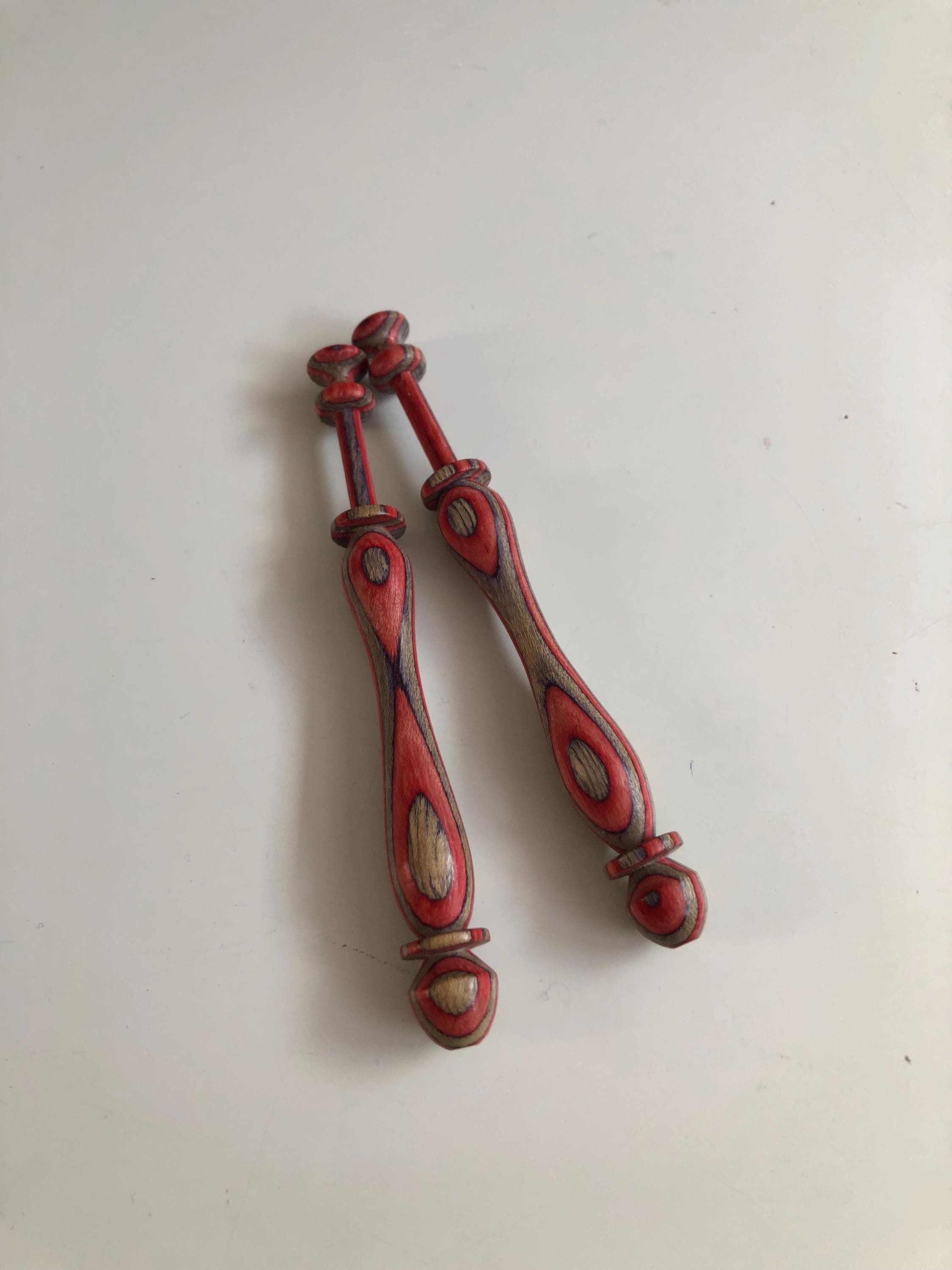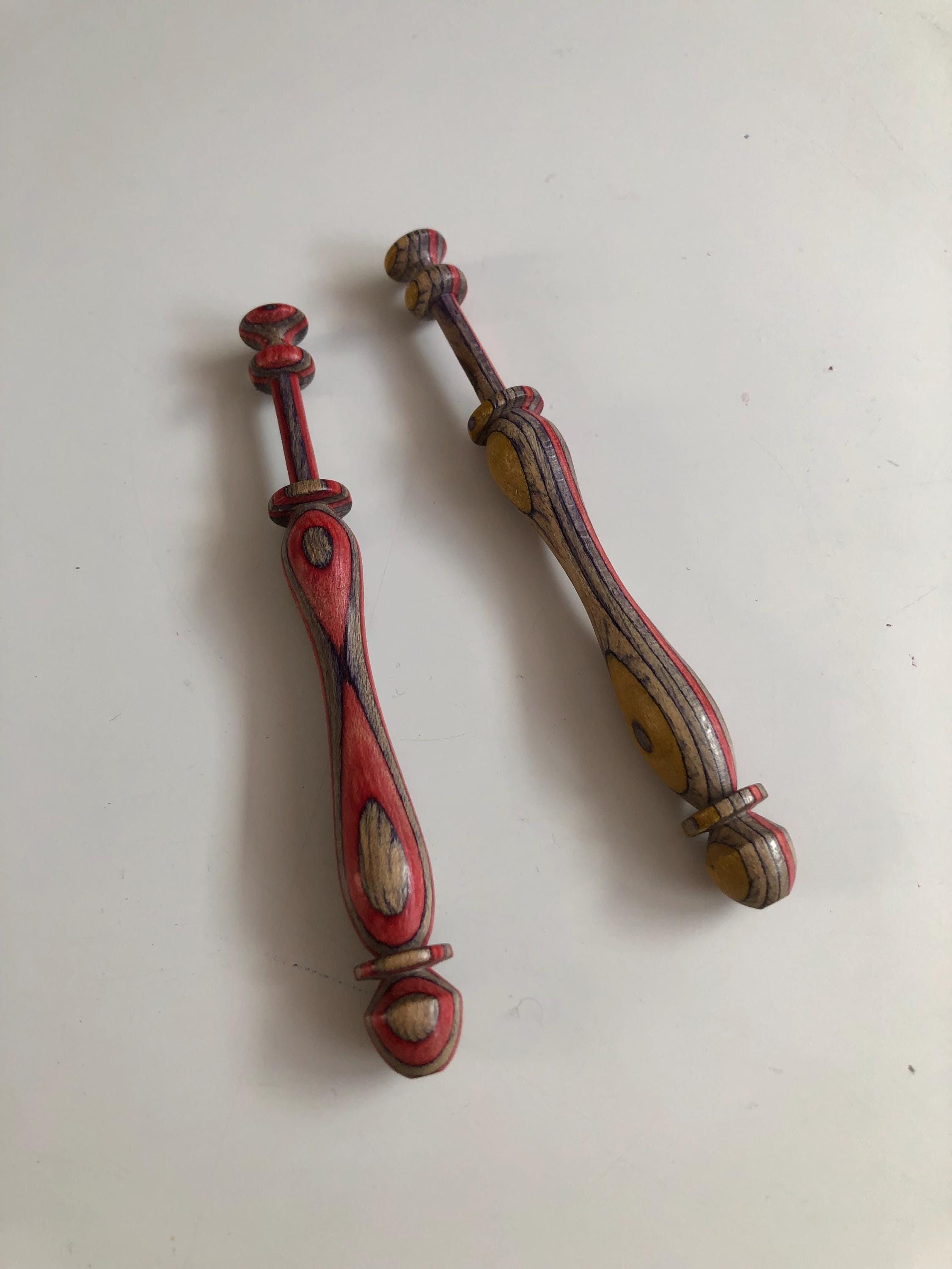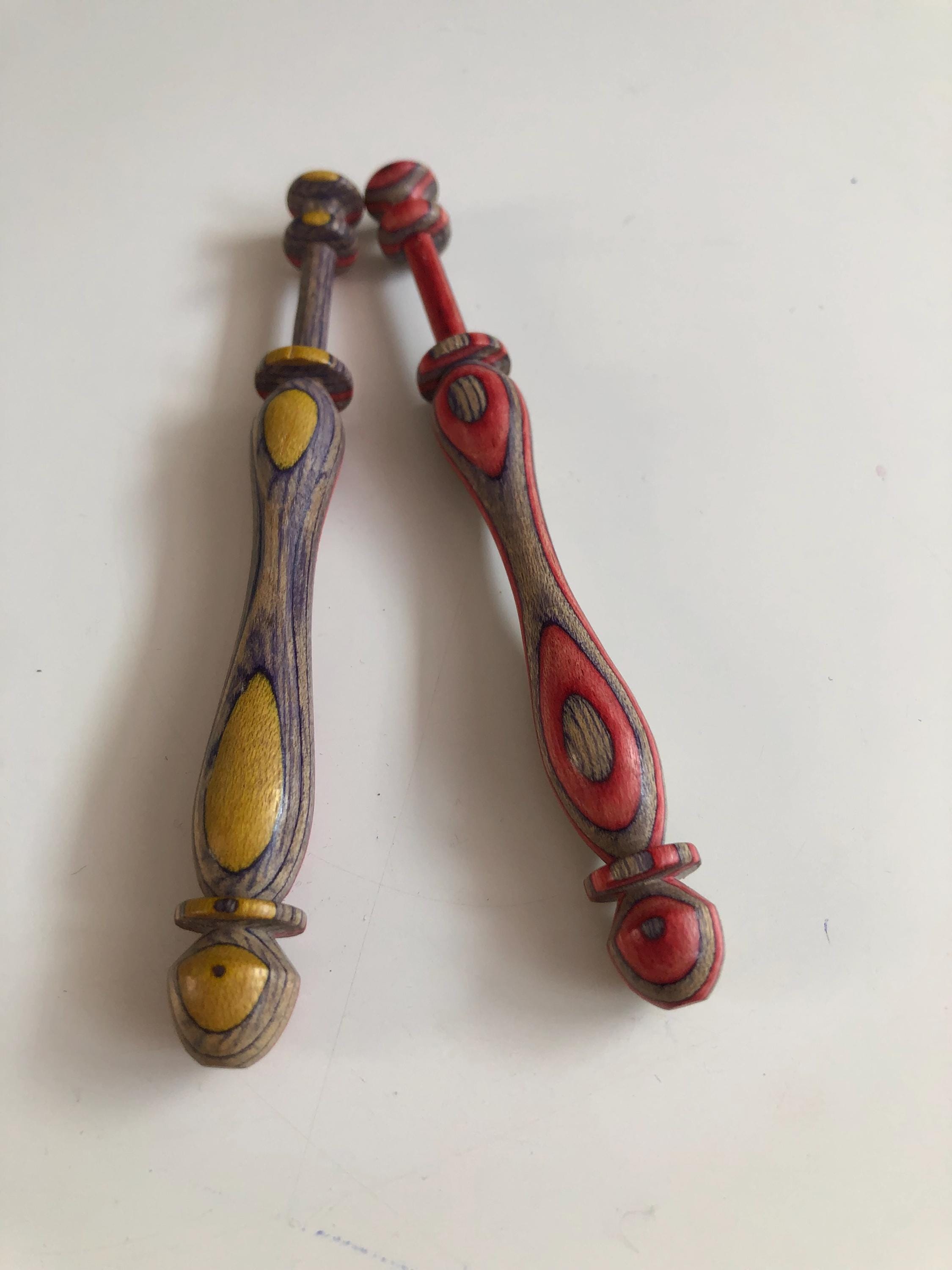 Pair of wooden lacemaking bobbins - red and yellow coloured wood.