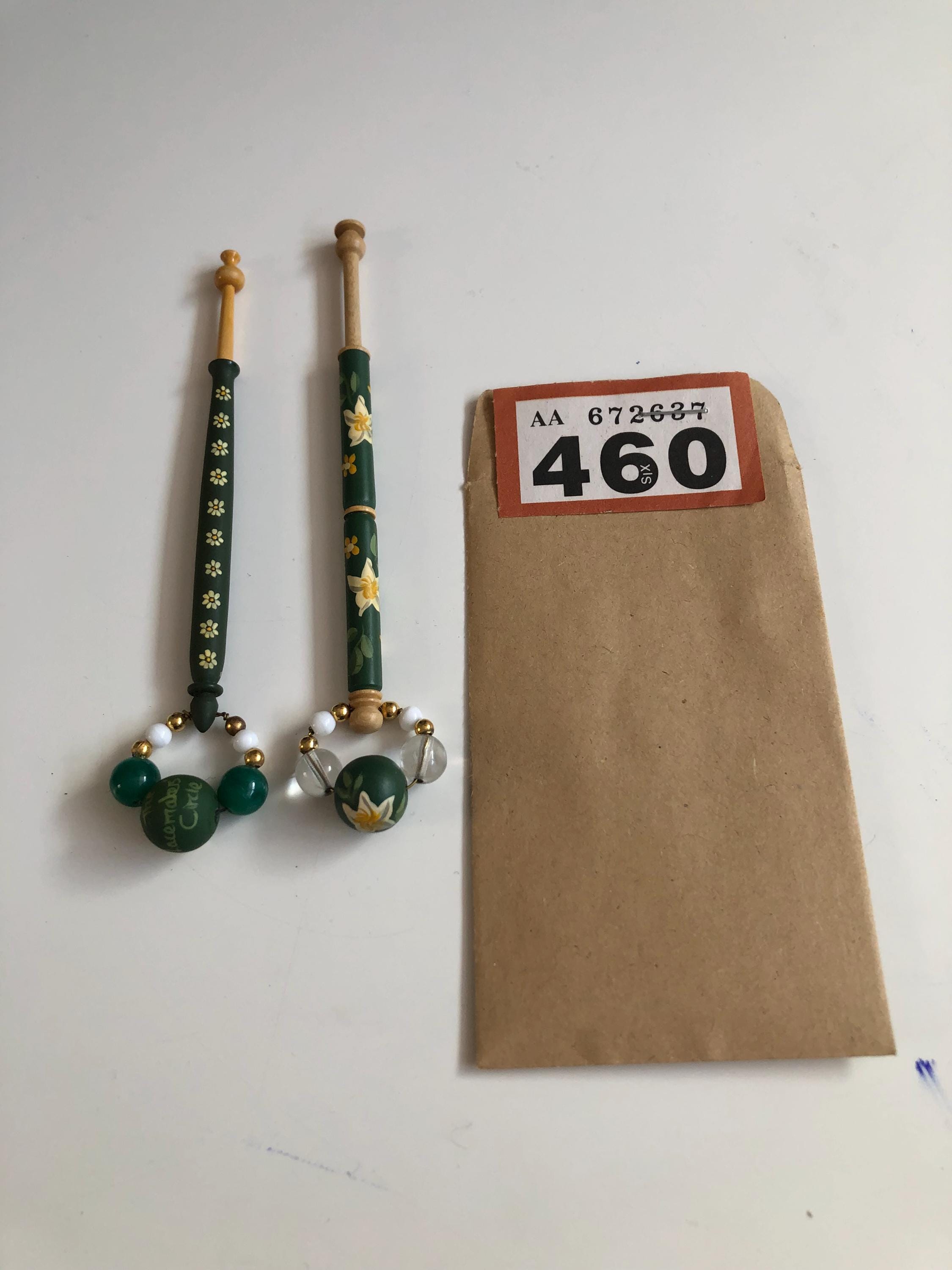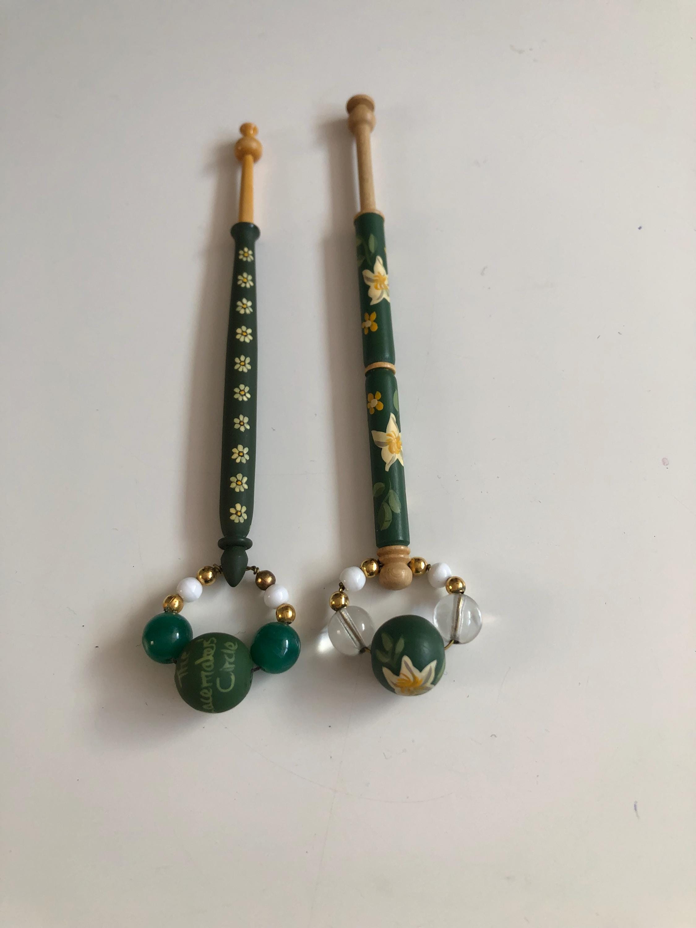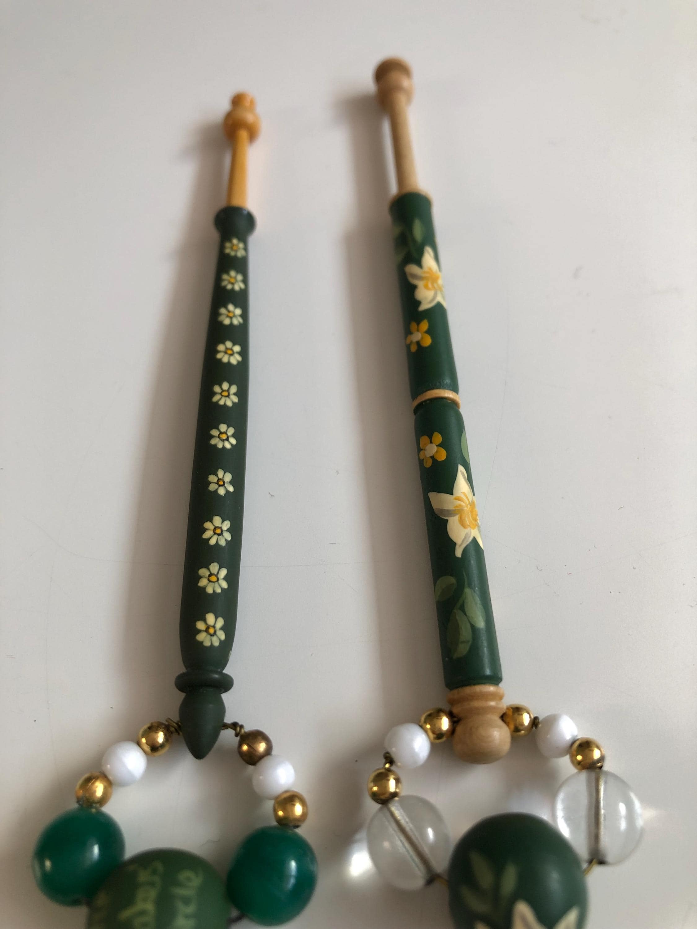 Pair of wooden lacemaking bobbins - hand painted.